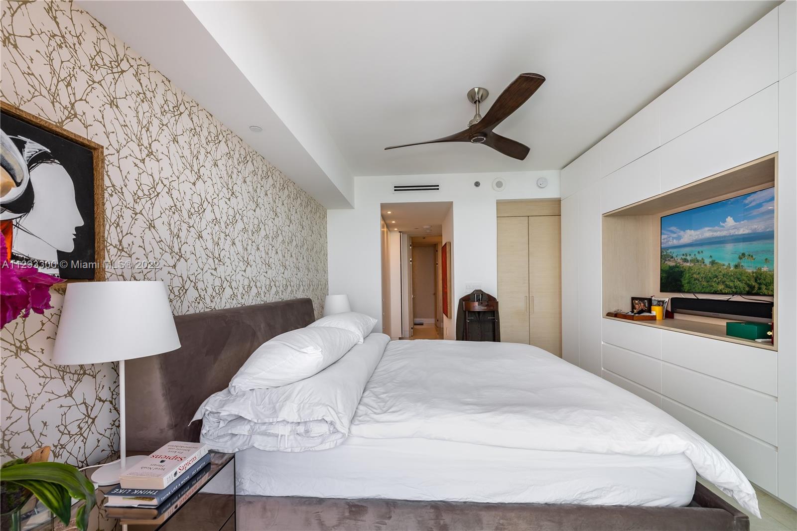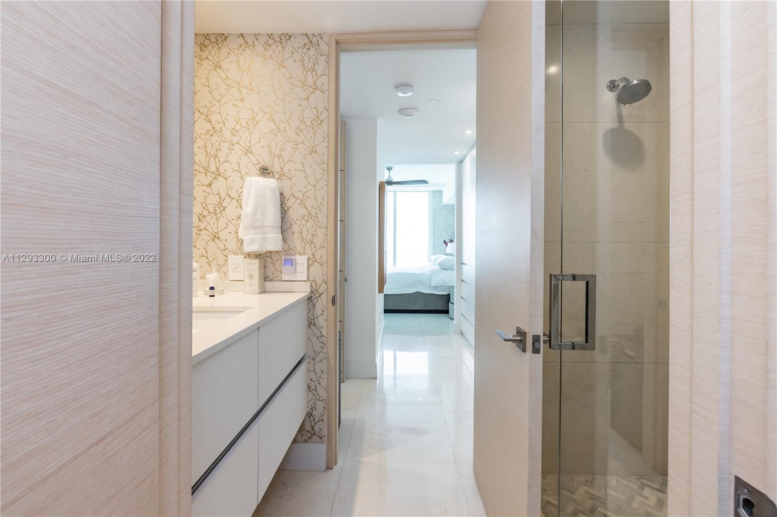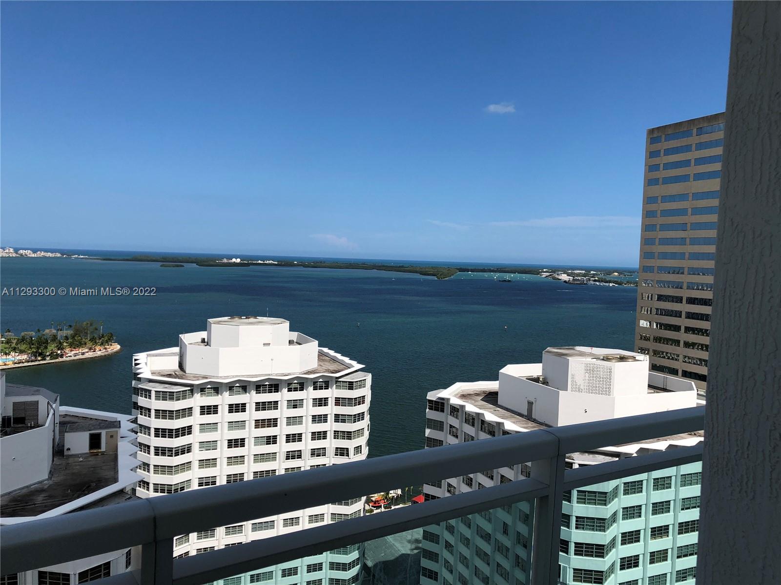 Spectacular panoramic views of Biscayne Bay. Designer remodeled and designer furnished - top-of-the-line appliances, marble floors throughout, European kitchen with built-in dining table, eletric shades & blinds. Second bedroom is used as an office with convenient Murphy bed. Enjoy coffee on your oversize terrace overlooking Key Biscayne, Brickell Key and Miami Beach. Amenties include gym, pool area, theater, party room, office center & valet parking. Centrally located to all Brickell has to offer. Walk everywhere on Brickell. Unit currently rented furnished for $6,500 a month until May 2023. Furniture is negotiable. Please use ShowingTime, text or call listing agent for showings.