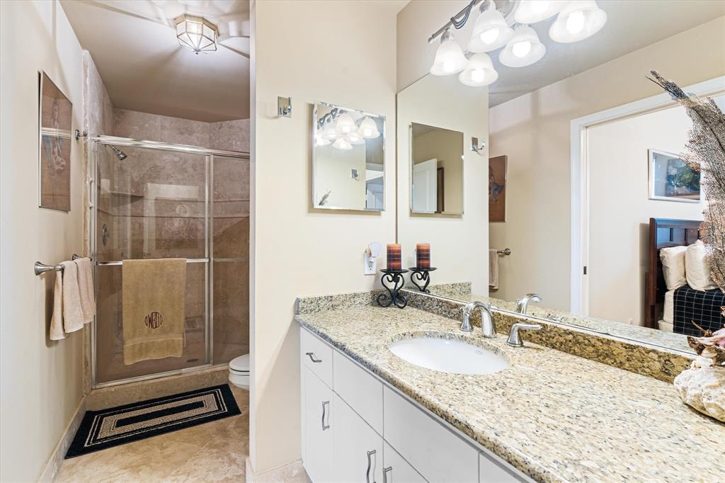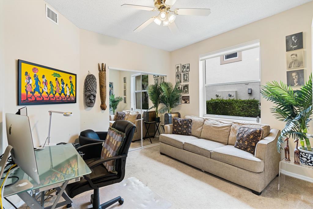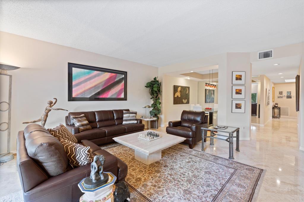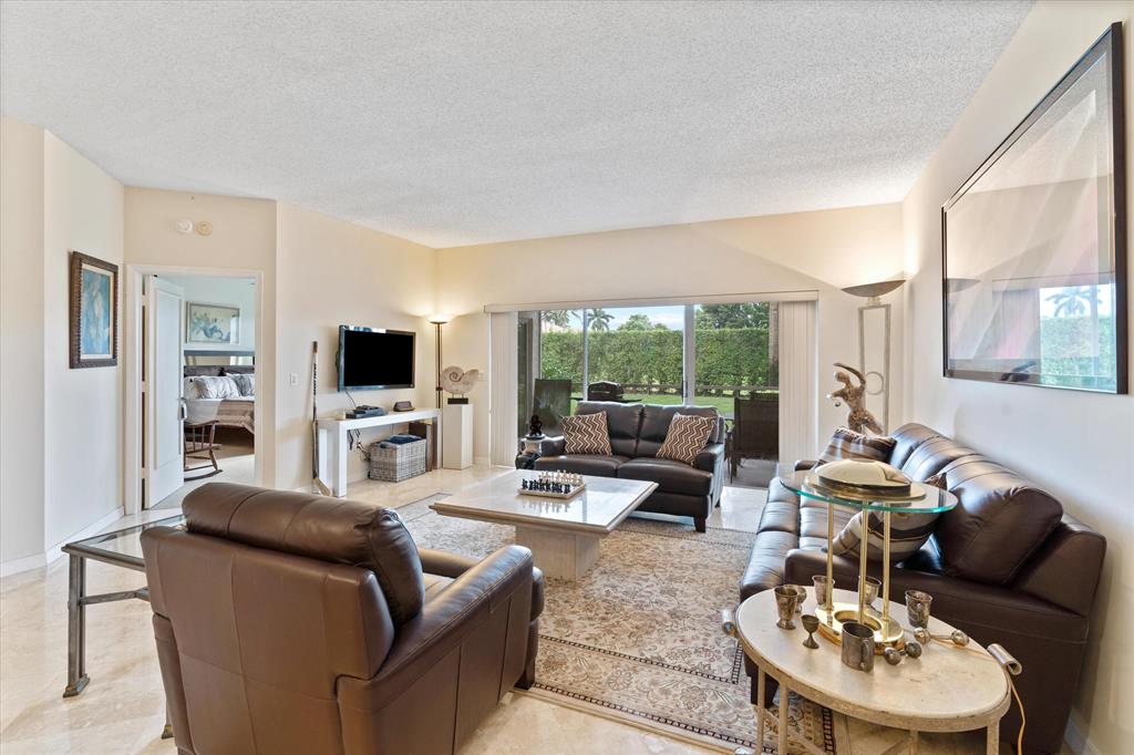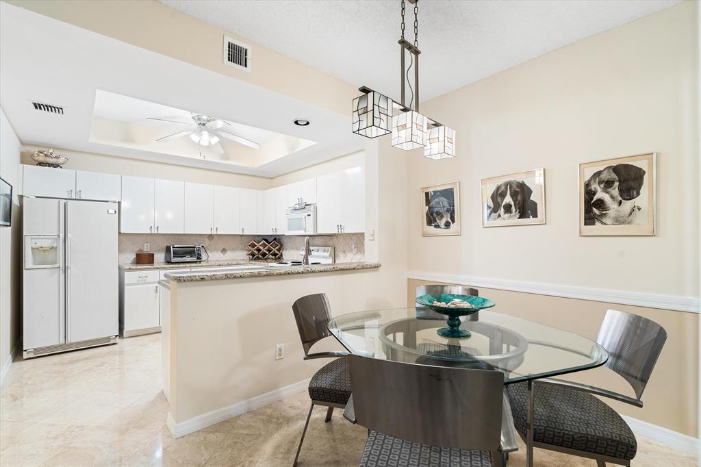 Charming first floor condo with 3 bedrooms, 2 baths and a 1 car garage. Kitchen has granite countertops and a stone backsplash. The open concept dining and living rooms allow for a seamless flow. Designed as a split floor plan layout, there is a guest bedroom and a third room fit as a den perfect for guests. The living room opens to your private screen patio with lush landscaping. Features include marble flooring throughout the main living area, AC 2015, roof 2011.