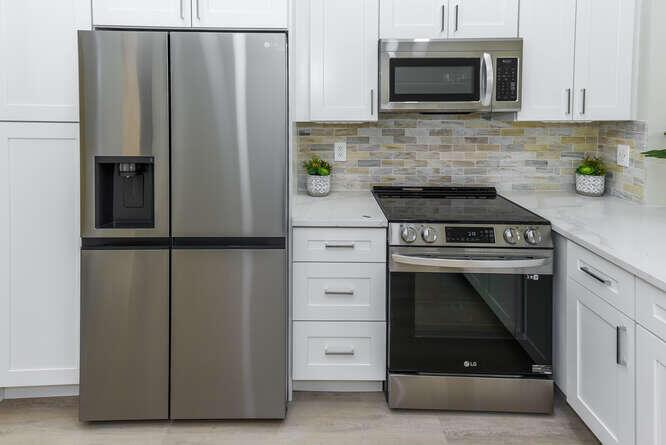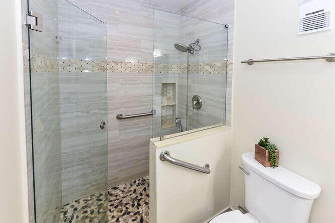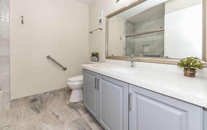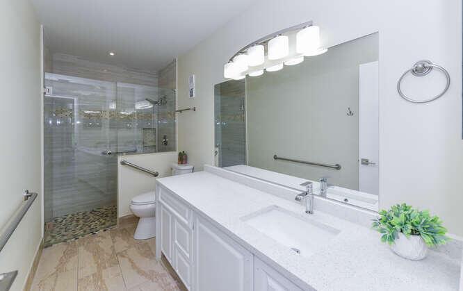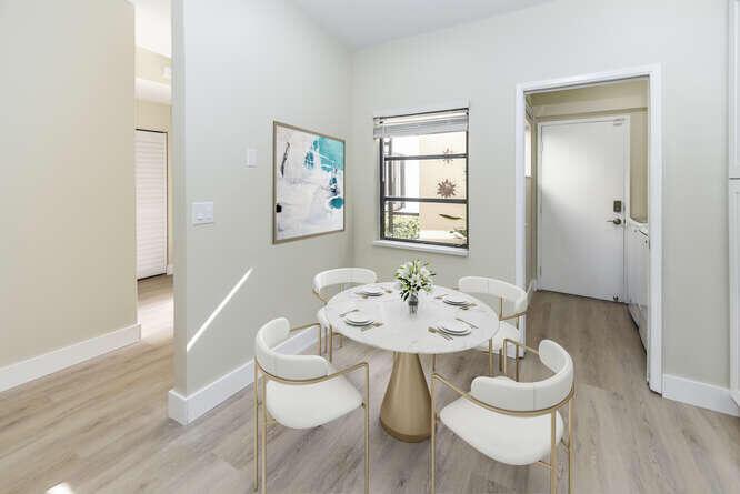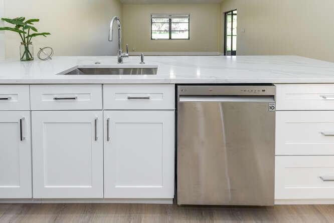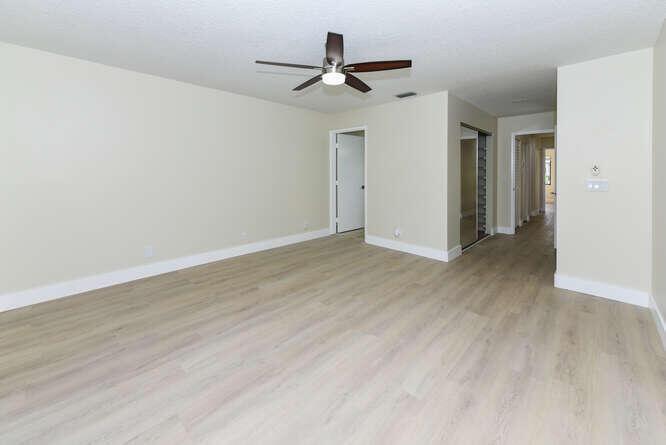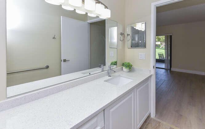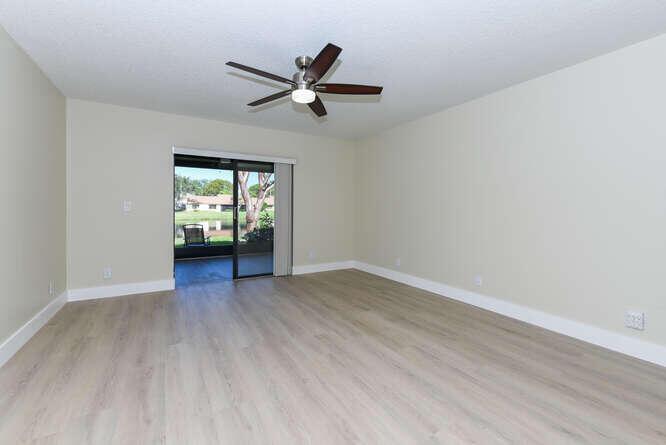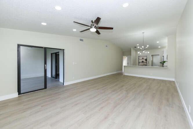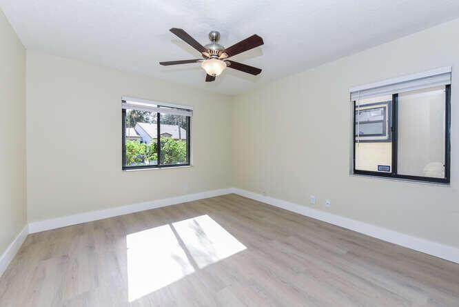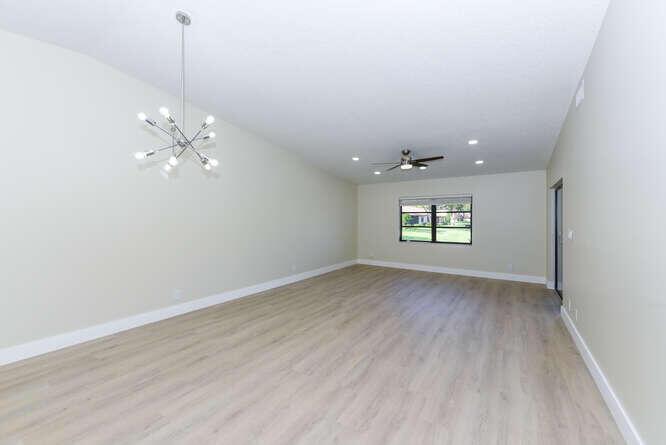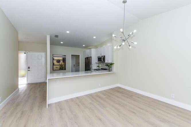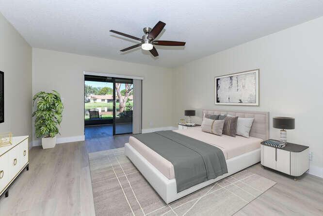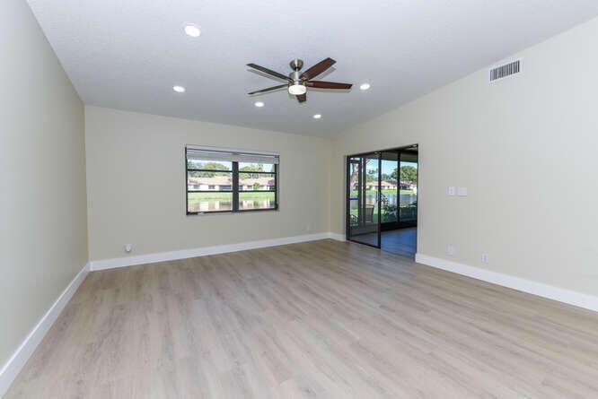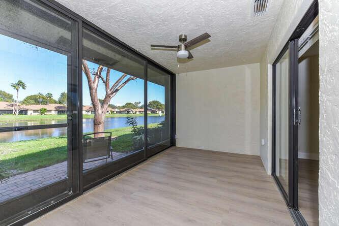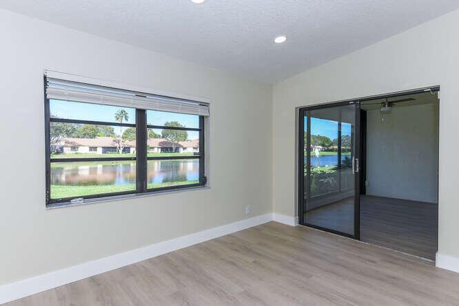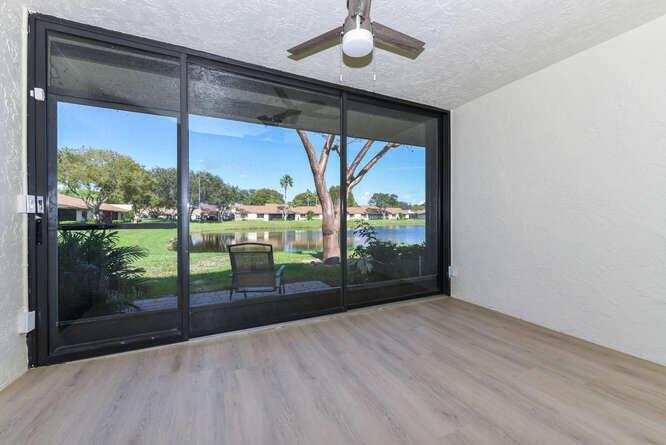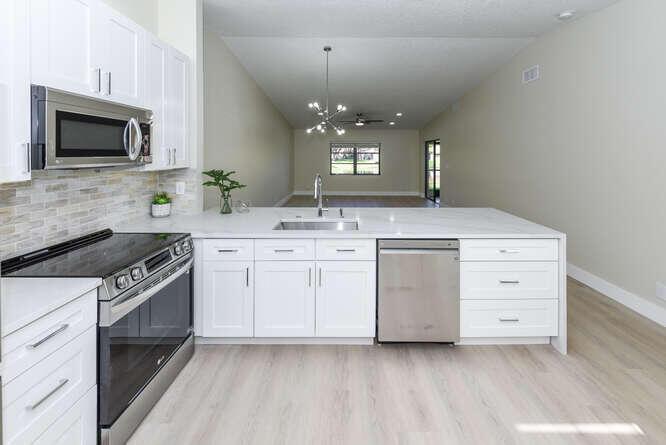 New Roof (Nov 2022). Enjoy this move in ready gorgeous 2/2 + enclosed den, lakefront villa in popular Whisper Walk 55+ gated community. Light waterproof and scratch resistant luxury vinyl floors & modern new baseboards throughout. Open floor plan with new solid wood white shaker kitchen cabinets, oversized S/S sink, eat in kitchen area, new & upgraded Stainless Steel Samsung appliances & new full size Washer and Dryer (inside). Large living room with vaulted ceilings. Updated bathrooms with walk in shower + tub. Beautiful quartz tops in kitchen (Calacata) and both bathrooms. Just painted and no popcorn ceiling. Custom closets in all 3 bedroom closets. New toilets, new bathroom fixtures and new sinks. New LED lighting throughout + fans. Click MORE....