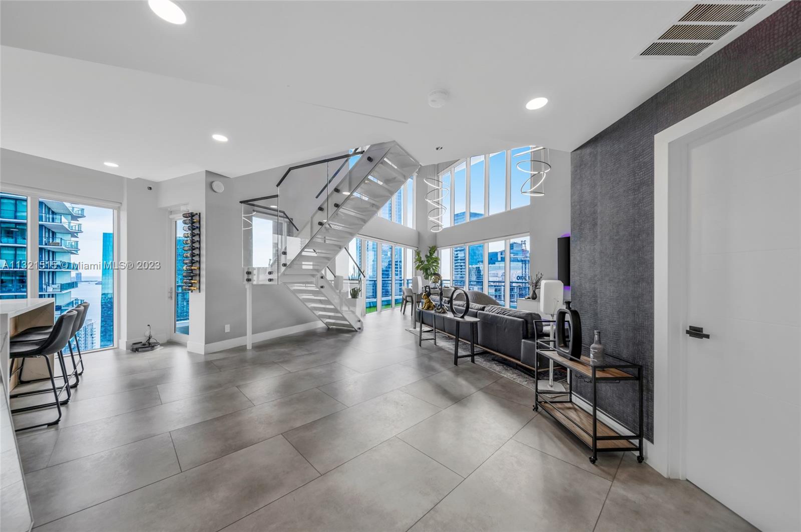 This astonishing and visually dramatic two story residence at Infinity at Brickell is a one of a kind corner unit just remodeled in 2022. Floating 36 floors up on the south east corner with expansive views of the bay, ocean and the city. This unit will wow you from the very entrance with the double height ceilings and floor to ceiling glass windows that make you feel like you are in the clouds. This 2,415 sq ft 3 bedroom, 3.5 bathroom features custom floating staircase, Architectural Lightning, floating vanities, luxury toilets, custom closet cabinetry, and more. Building amenities include: pool, jacuzzi, sauna, steam room, bike storage, 24hr security, concierge, valet parking, and a cafe´/market in the lobby. Enjoy walking to everything Brickell has to offer.