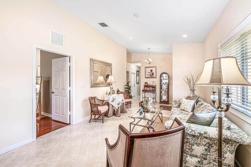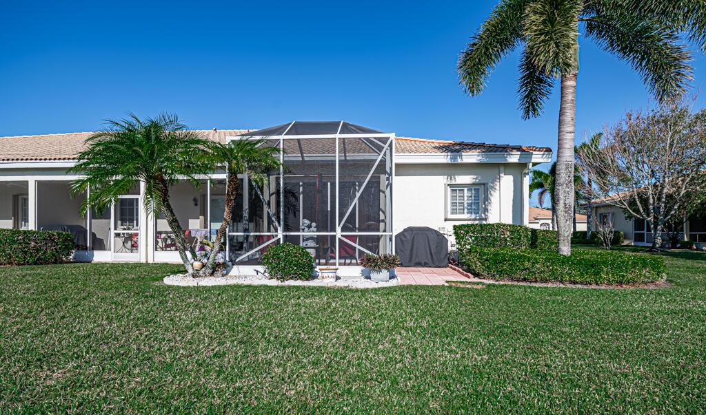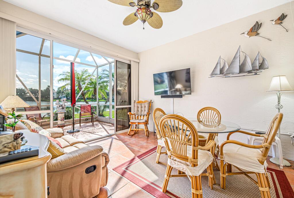 Stunning home on the lake. This is one you can't pass up! 3 bedrooms, 2 full baths with a one car garage situated on a beautiful lake. Enjoy relaxing on your patio seeing the sunset. The double patio features an outside screened enclosure, outdoor BBQ area and an enclosed patio you can use all year round. This is an end unit which gives you more windows letting in a lot of natural light. Fabulous engineered hardwood in the primary and one of the guest bedrooms. Very clean home. Well maintained. AC 1 1/2 yrs, dishwasher, microwave 2 years, updated stove, refrigerator and hot water heater. Washer/Dryer have been enclosed and are not in the garage. Built ins in the closets and pull outs in the cabinets. Complete with accordion shutters. The clubhouse is fantastic! Resort feel with 3 pools