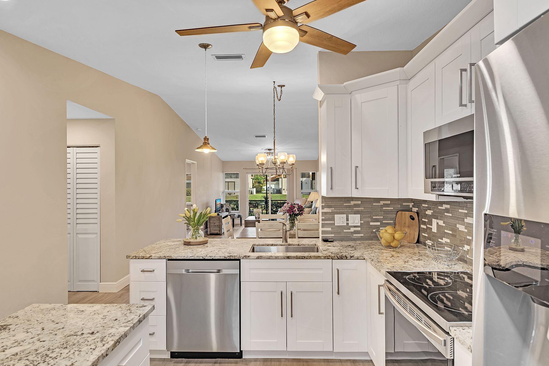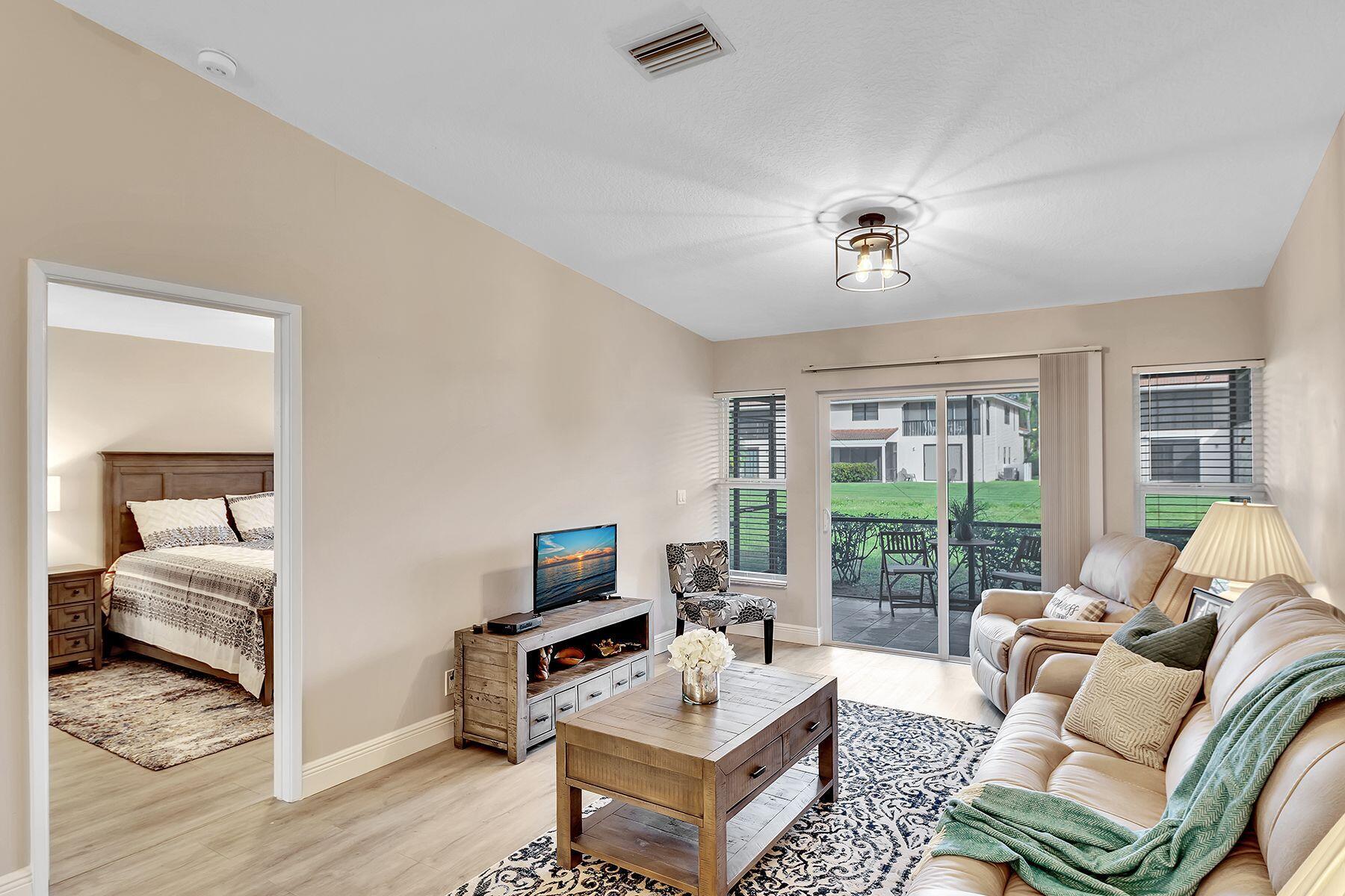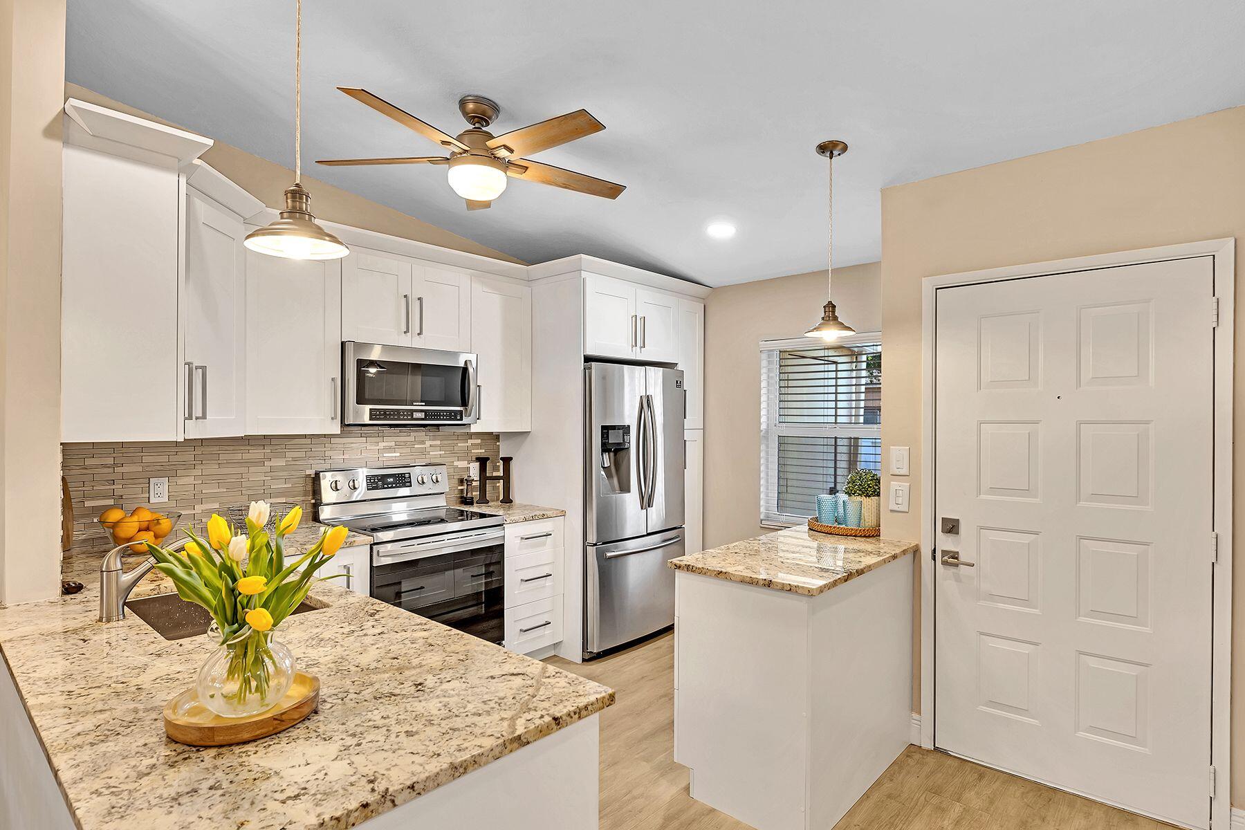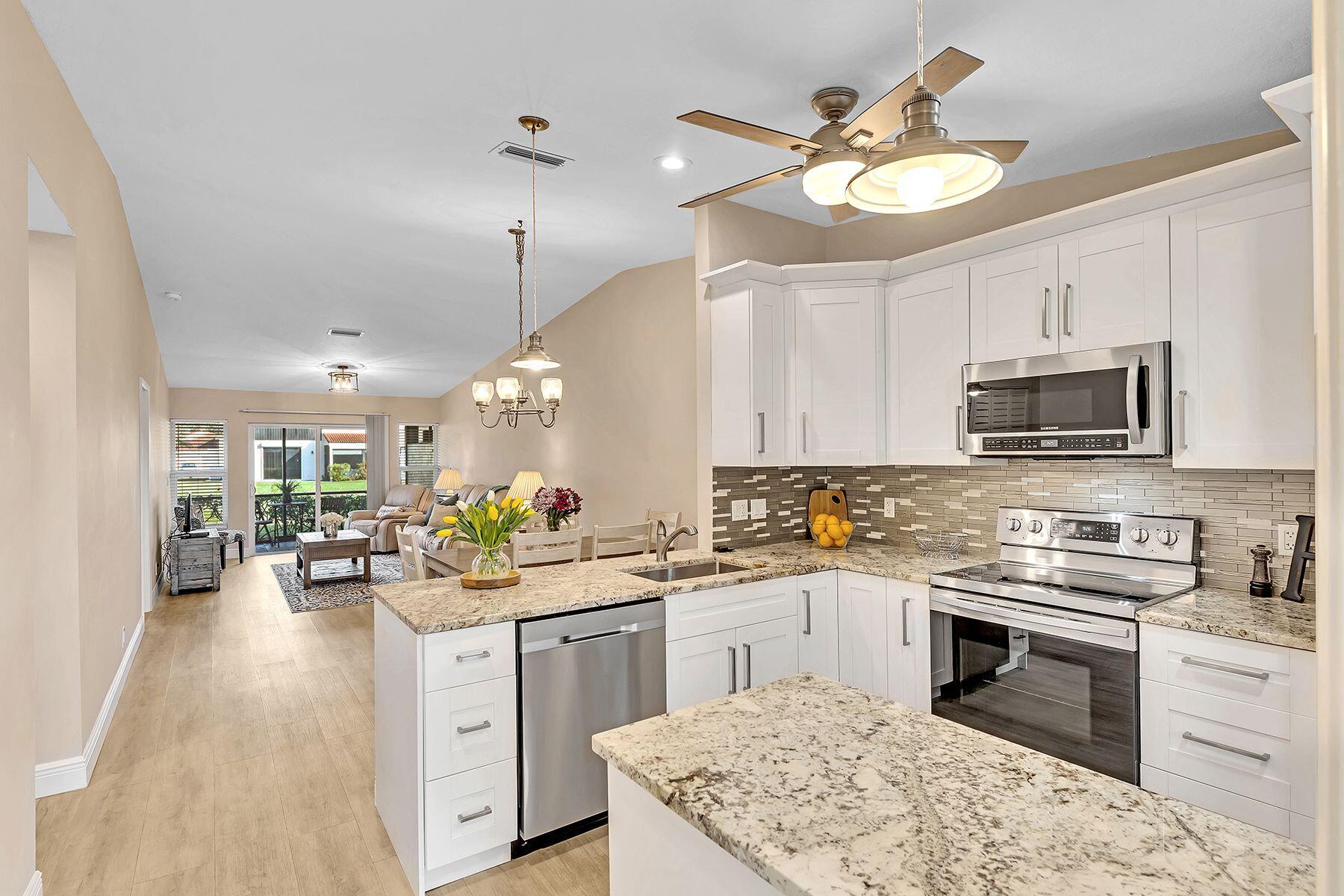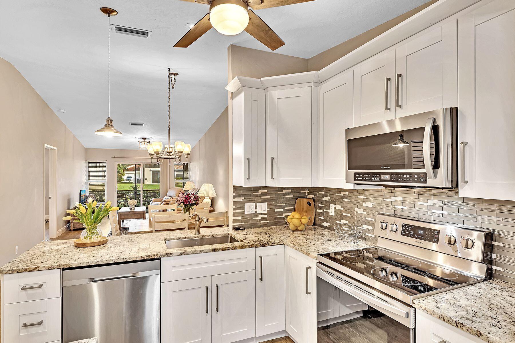 Enjoy living in a peaceful setting with tree lined streets and a multitude of amenities at Whisper Walk of Boca Raton. This 55+ community provides many opportunities to live an active lifestyle; pickleball, tennis, community pool and hot tub, clubhouse, library, walking trails, plus the security of 2 gated entrances. This 2 bedroom, 2 bath unit has been completely updated with white cabinets, granite counters, stainless appliances, lighting fixtures, continuous wood look flooring, interior doors and impact windows. Full size washer and dryer and large screened in patio, are added bonuses!