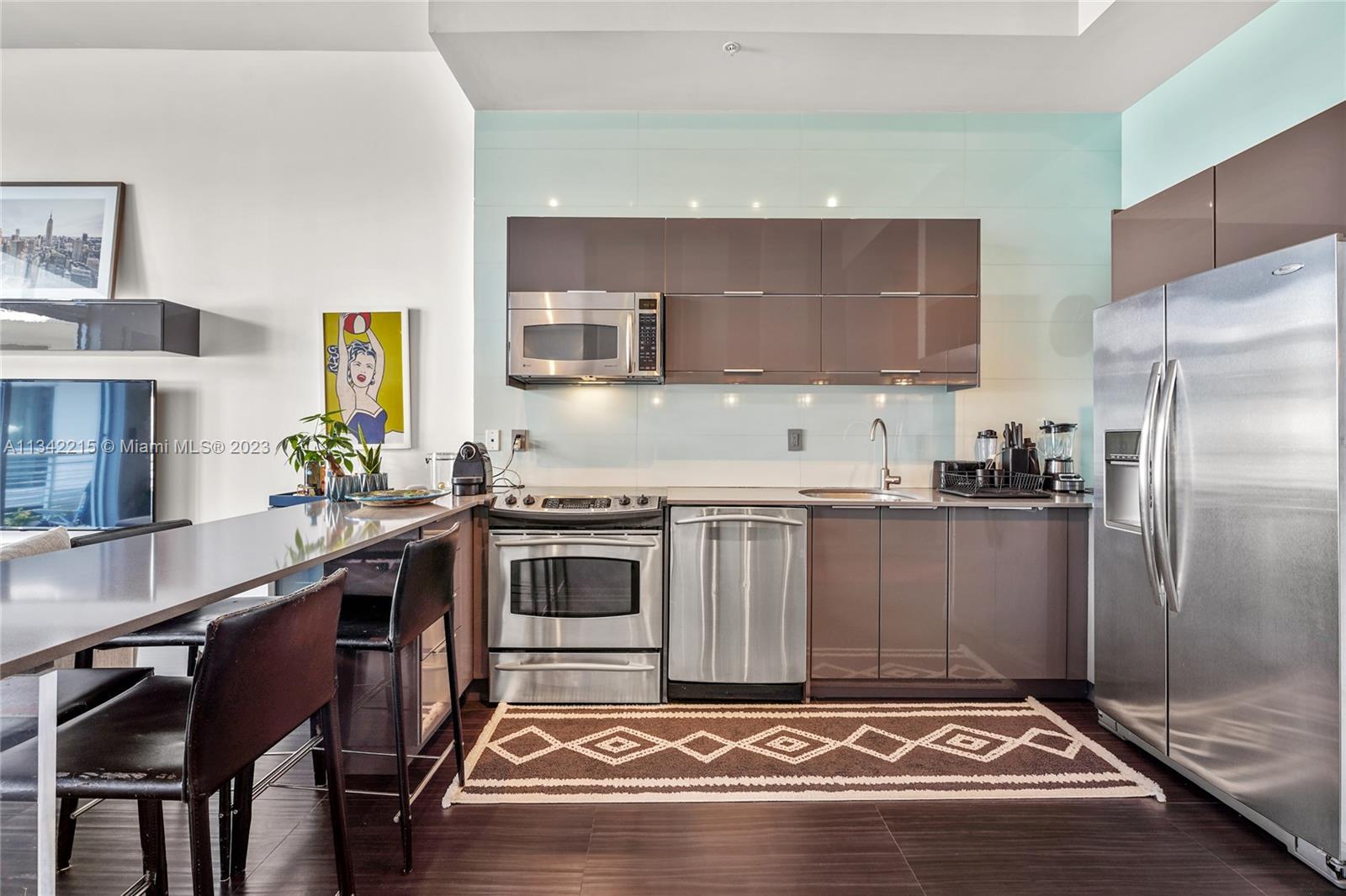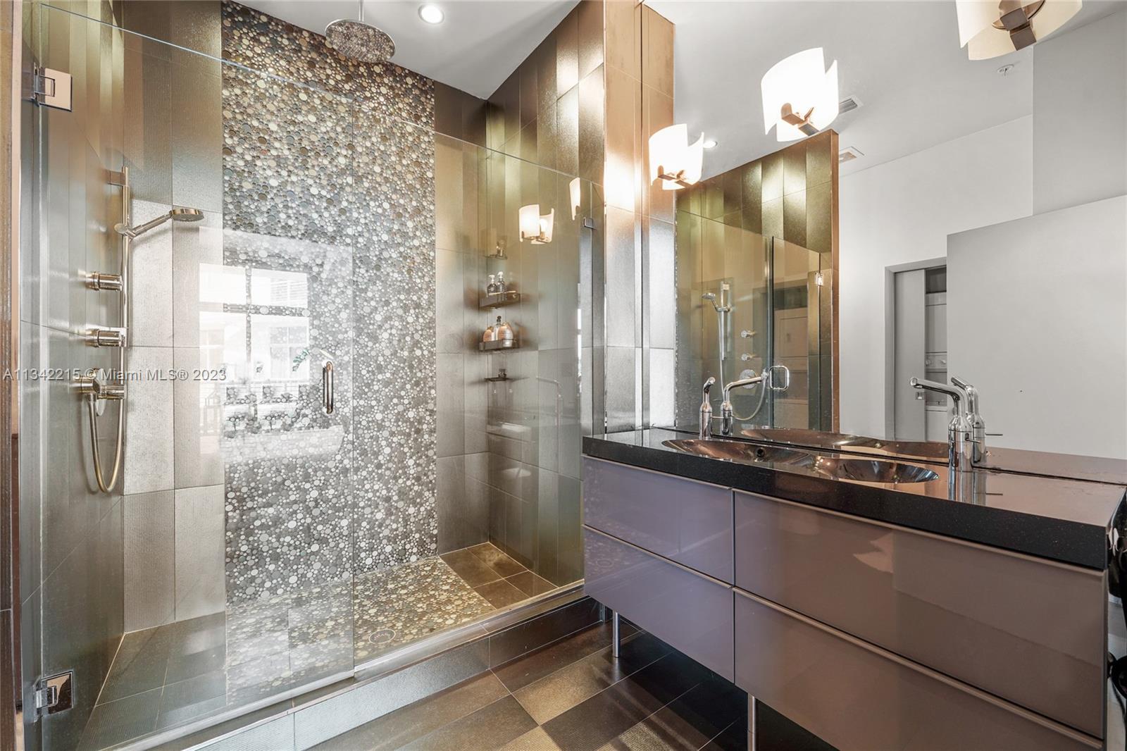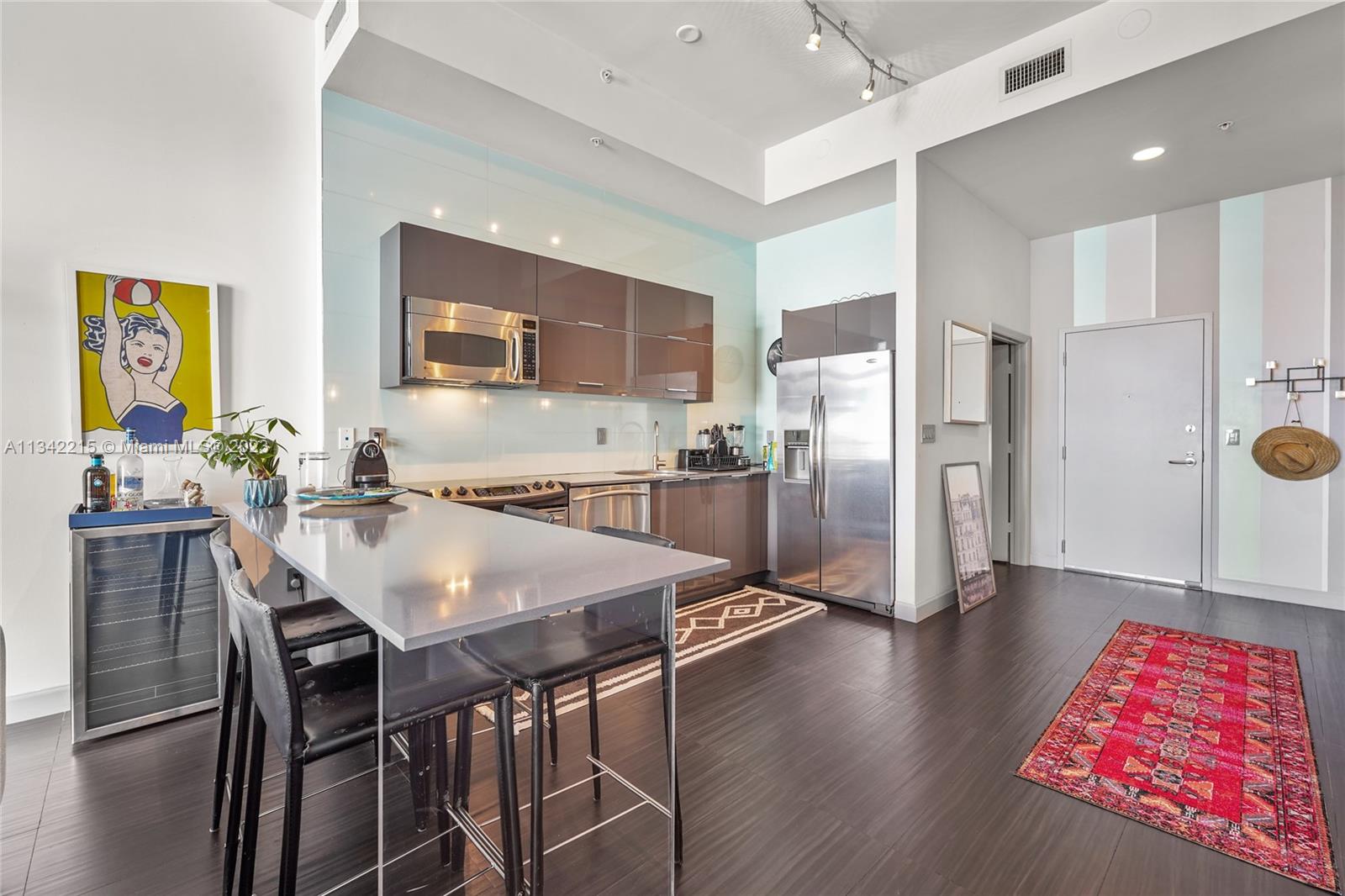 Rare designer loft at the modern, elegant & exclusive Meridian Condo. Featuring 11 ft ceilings, nearly 1000 SF of open living space facing golf course/garden views & a 200+ SF balcony. Floor to ceiling windows, 2 balcony entrances & lots of natural light. Every aspect of this unit is high end, from the appliances & furniture (can be included) to the meticulous renovation. Extra bathroom, full size Washer/Dryer & 1 XL garage space. Bldng feat. gorgeous rooftop pool, jacuzzi & sun deck w/ panoramic views, gym & 24 hr concierge/security. Amazing Pied-a-terre or investment property w/ great cap rate. Excellent tenant leasing for $5200 through May & willing to stay if buyer chooses. Spectacular location in the heart of Miami Beach, yet quiet & peaceful beside tranquil golf course.