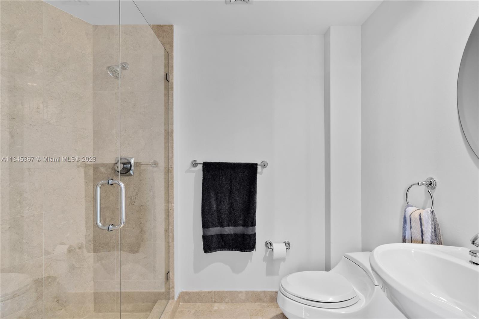 Upscale condo with amazing bay and city views from 30 floor unit. Two bedrooms both with ensuite bathrooms, powder room, modern kitchen with quarter countertops, polished marble floors, laundry, views from every room and large terrace for entertainment. Elegant lobby, concierge, business center, and free valet parking for guests. Relax and swim laps in resort- like pool, BBQ grills, and state of the art gym with basketball, racquetball, tennis courts. Bike Storage. Brickell Key is home to Mandarin Oriental and the unit is an easy walk to Brickell City center and many restaurants.
