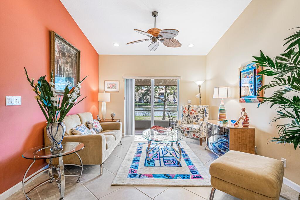 Wow! Beautiful villa overlooking the lake. Impeccable taste shows with the sunny, inviting decor of this cute villa. Super clean, gently used home owned by snowbirds. As soon as you walk in the door you are greeted by the amazing lake view. This 2 bedrooms, 2 bathrooms and a den/flex space, nice kitchen, light, bright colors make this home feel like a coastal beach house. AC is 2019, hot water heater 2022, accordion shutters, beautiful glass etched front door, upgraded diagonal tile, kitchen cabinets and newer ceiling fans and custom master closet. HOA fee includes high speed internet, premium cable channels, ADT home alarm and phone, exterior paint, lawn maintenance, pressure washing, recently mulched and use of all the amenities, which include resistance pool, family pool