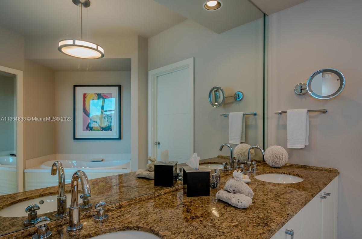 Best deal price per sqft. in the building. Beautiful, pristine, renovated two Bedrooms in prestigious Portofino Tower. Bay views, overlooking the pool. A clean modern design and semi-private foyer. New updated amenities. Full amenity luxury building with world class spa on the 29th floor, tennis, pickle ball, valet, concierge services. All assessments have been paid. Be part of the South of 5th lifestyle. Just steps to the ocean, marina, park and fabulous restaurants. Note; Avail for showings on Thursdays.