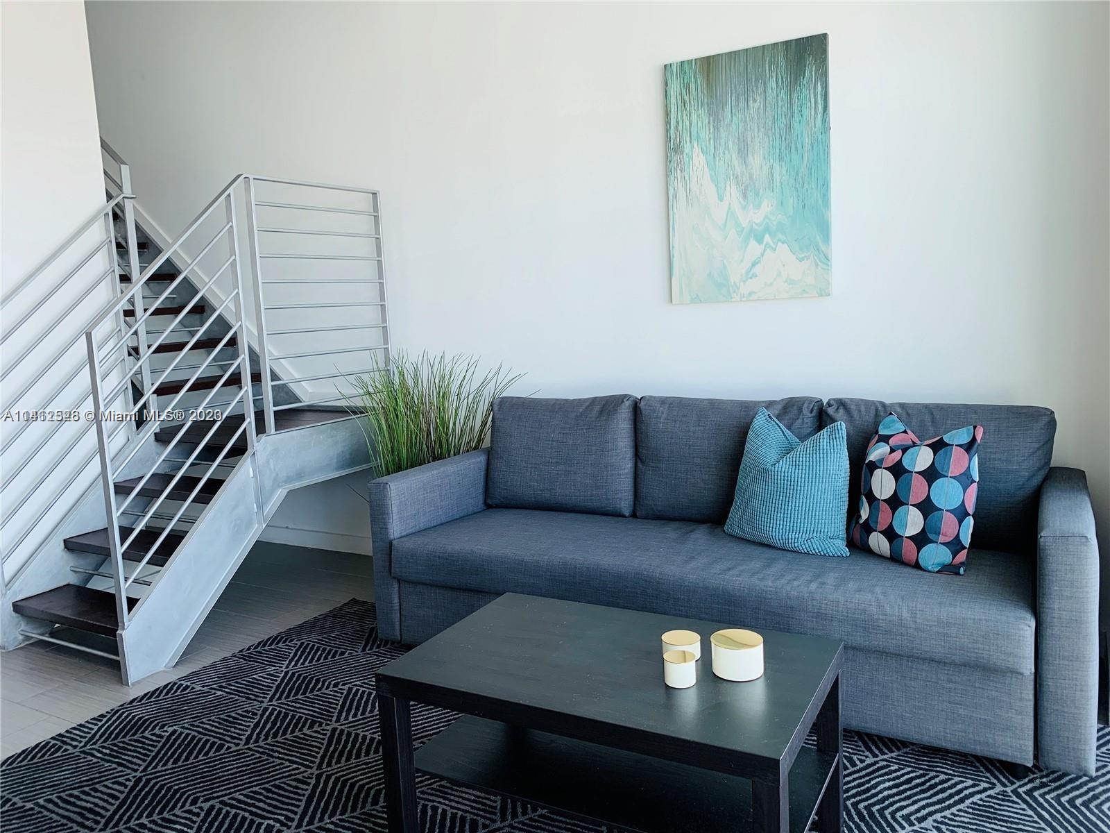 Fully furnished 1/1.5 loft-style unit located in the Brickell area. The building offers luxurious amenities, including a range of options, a 24-hour attended lobby, lounges, clubrooms, a pool, and a fitness center. The unit features a split-level plan with a unique extended terrace, perfect for outdoor entertainment. There is also a second balcony in the upstairs bedroom. The unit is conveniently located on the 11th floor, the same floor as the amenities, including the pool, clubroom, and gym. The kitchen is equipped with stainless steel top-of-the-line appliances and granite countertops. The building is close to numerous restaurants, Mary Brickell Village, Brickell City Centre, supermarkets, the and Metro Rail.