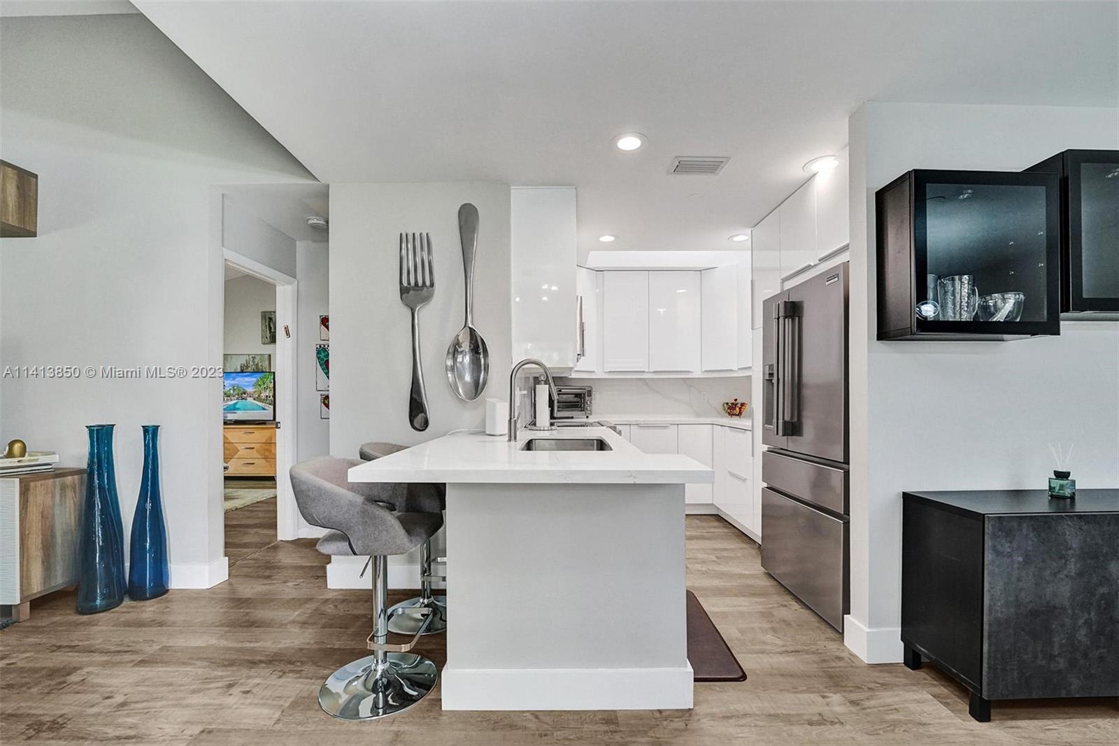 Beautifully renovated one-level corner villa in popular guard gated Aventura Waterways community has the feel of a much larger home with the vaulted high ceilings, separate dining area, split bedroom floor plan, screened patio, and natural sunlight. You will be delighted with the spacious size and ambience. Gorgeous kitchen has white quartz countertops, modern white soft close cabinetry and drawers, innovative storage, newer appliances, skylight. Hunter Douglas style window treatments. Hurricane shutters are accordion; front door is impact. A/C and appliances all new in past two-three years. Pet friendly [two small dogs welcome] La Mirage is located near parks, A-rated schools. Walk to shops, dining, houses of worship. Close to beach, Aventura Mall, airports. Condo fee inc. Internet Cable.