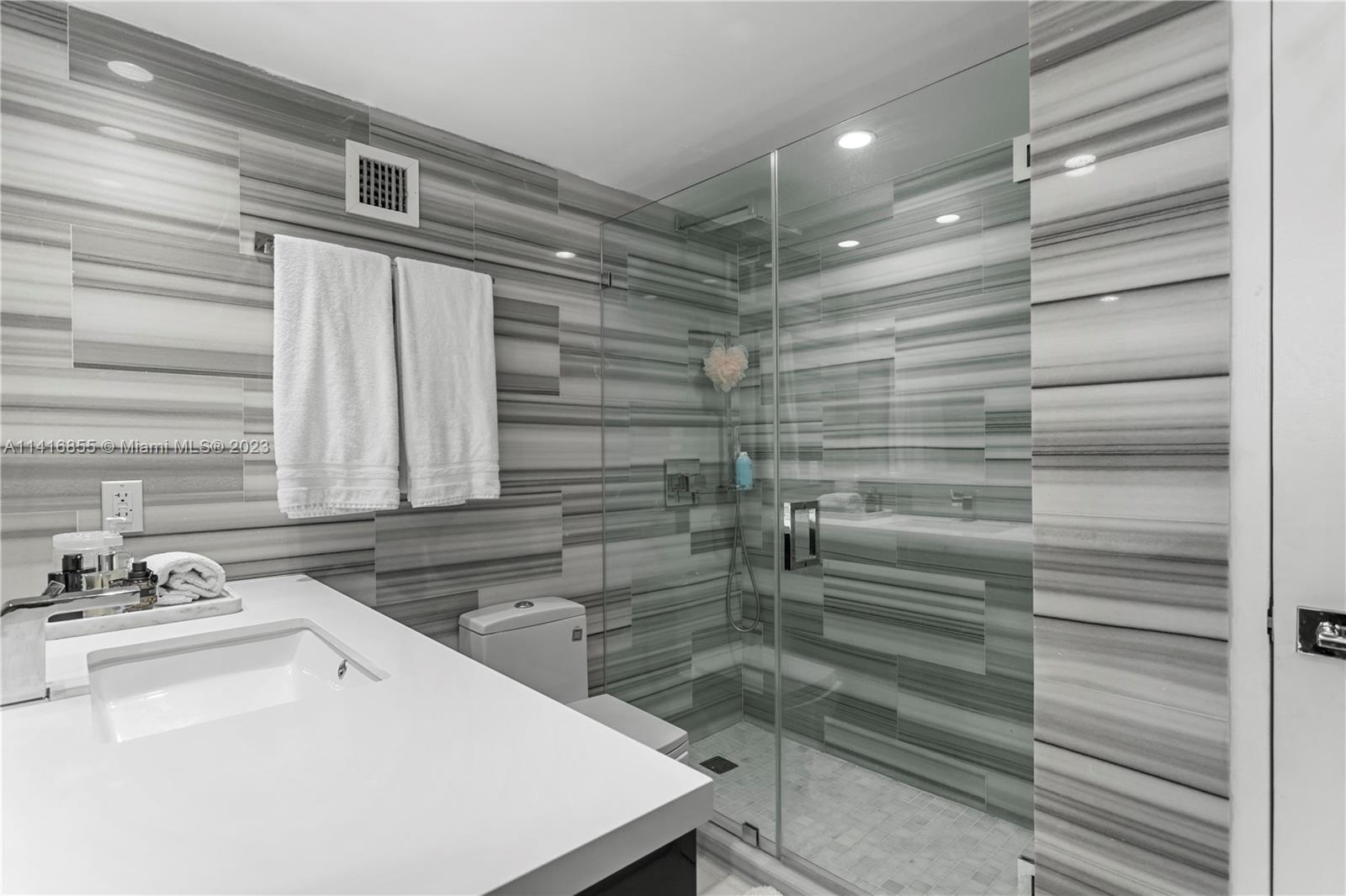 Beautiful corner unit at Mirador North. This unit has been FULLY renovated, including kitchen, bathrooms, marble flooring, and in-unit washer and dryer. This is the most updated and modern unit to hit the market in awhile. Well maintained building with friendly staff and stable HOA. Best condo gym in South Beach overlooking the Bay. One valet parking spot included with unit. Next door to world-famous Mondrian Hotel