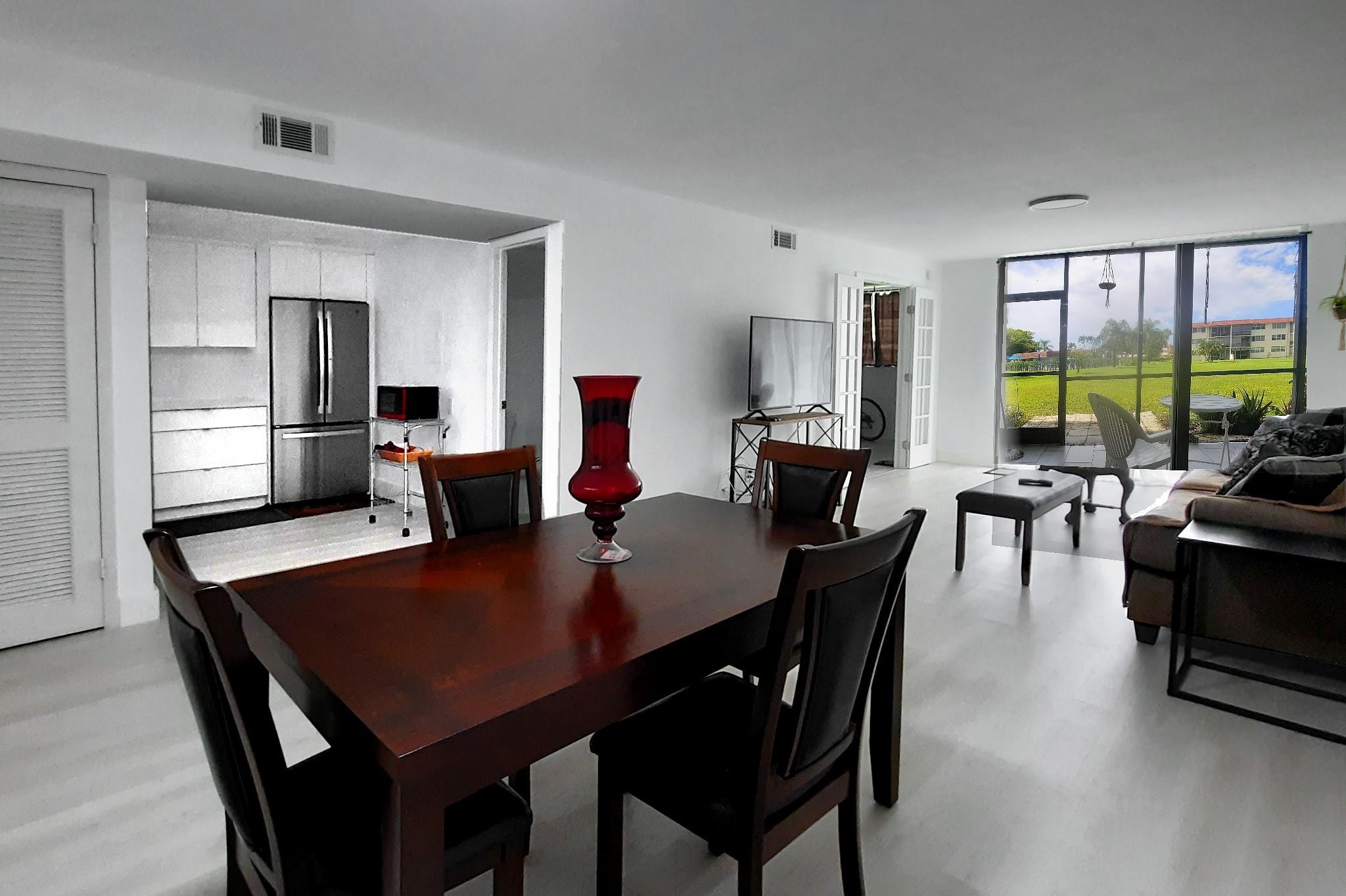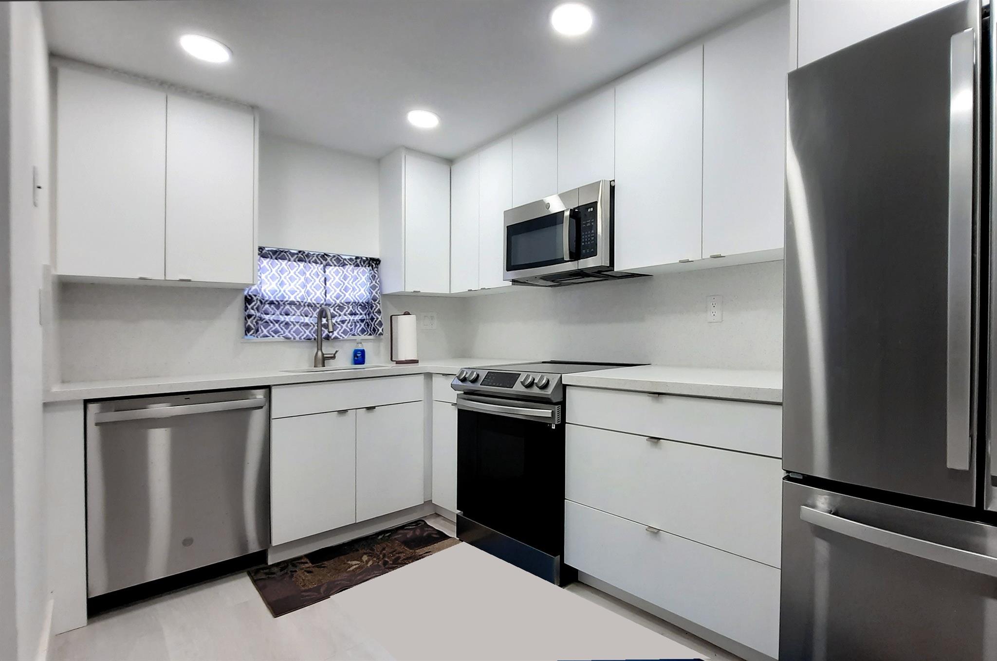 Completely updated recently. Modern 1 bedroom on first floor with pool access from the patio in back. Completely updated with new kitchen with new cabinets with quartz counter tops, new stainless appliances and raised ceiling with high hat lighting. Bathrooms are all redone. High quality vinyl flooring throughout. Updated air conditioning. Tankless hot water. French doors leading to the large master bedroom. New ceiling lights throughout. Paid up rec lease. Free golf , 14 tennis courts, 7 pools, theater, fitness center, restaurant , 24 hr. security,. Assoc. represents housing for older persons authorized (HOPA).. *** IMPORTANT! See Broker Remarks below for occupancy qualifications.