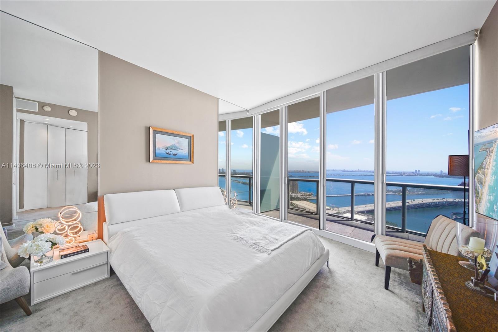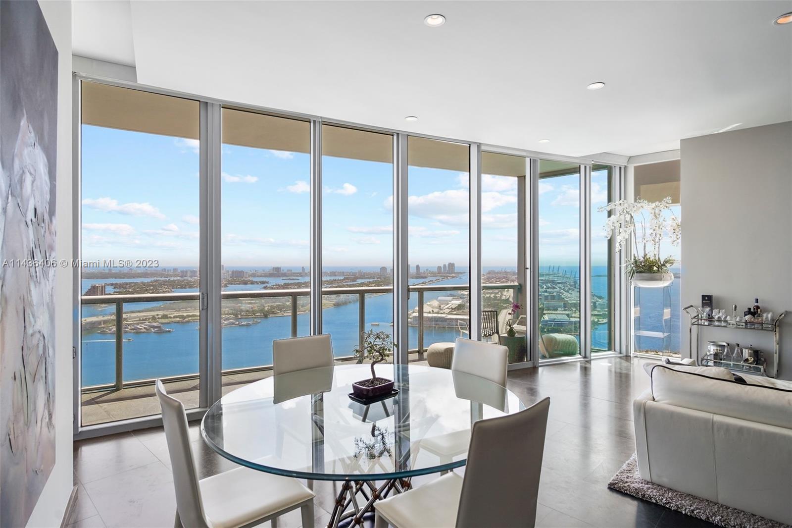 Discover a world of opulence & refinement in this premium line, uniquely designed residence. With only five similar units spanning floors 45 to 50 in the esteemed building, this property offers an unparalleled sense of exclusivity. Step inside to experience the grandeur of higher ceilings, an exceptional feature setting this unit apart from the rest. Meticulously remodeled. Indulge in the allure of French wallpaper & latest modern conveniences, complemented by the custom kitchen island & master bath. Spanning 1,754 SQFT, this 2 BDR, 2.5-bath sanctuary is a haven of luxury living. Enjoy stunning, direct Biscayne Bay views from the living/dining area & master bedroom, all thanks to the floor-to-ceiling glass windows that seamlessly connect you to the breathtaking surroundings.