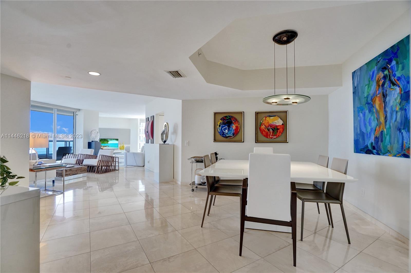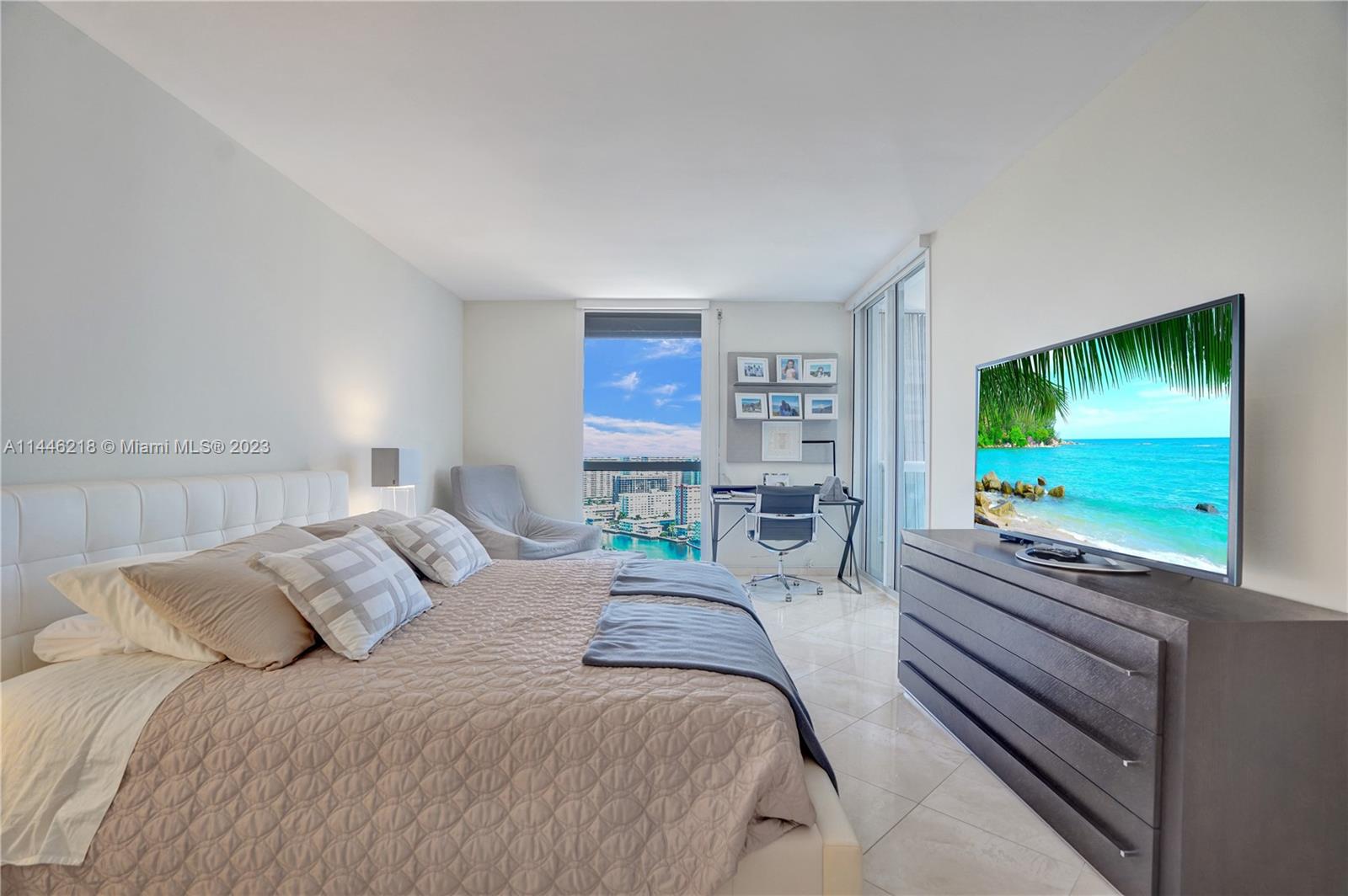Turnkey, furnished, corner 2 bedroom + den or 3rd bedroom with panoramic ocean, intracoastal and city views. Used only as a second home. Artefacto and Anima Domus furniture. Marble floors throughout. Two balconies; redone kitchen, quartz countertops. Full size washer and drier. Walk-in closets, hurricane shutters. Two parking spaces. Great amenities included in the maintenance: outdoor café, 25,000 sf spa & fitness center, beauty salon, 3 pools, 4 lighted tennis courts, BBQ, kids’ playground, library, and party room. Zumba, yoga, and Pilates classes are included in the maintenance. Walking distance to marina of the Waterways.