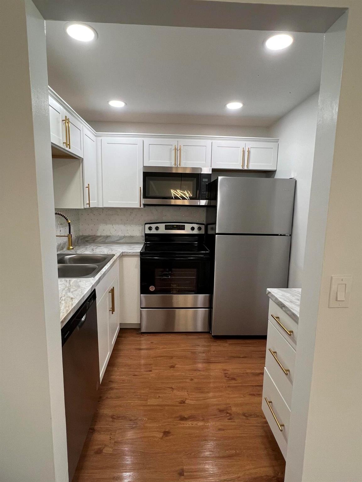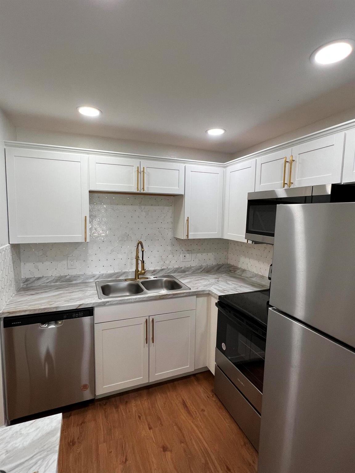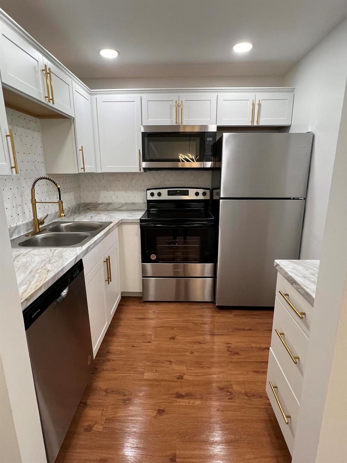 Beautiful 1st floor condo 1 and 1/2 bathrooms. Completely remodeled. New Kitchen and Marble look countertops and 3D Marble Backsplash. All new wooden shaker white kitchen cabinets with updated gold handles and crown molding on top. New LED recessed lighting in the ceiling and all brand new designer stainless steel kitchen appliances, which includes over the range microwave and dishwasher. New vanities and toilets in both bathrooms. Newly designed master bathroom with new shower walls, floors and a rainfall shower head. LED lighting throughout the entire condo. This place is beautiful, and located on a dead end street, thus very little traffic. Serene And Very Quiet. ****GROUND FLOOR UNIT. ****** FURNISHED