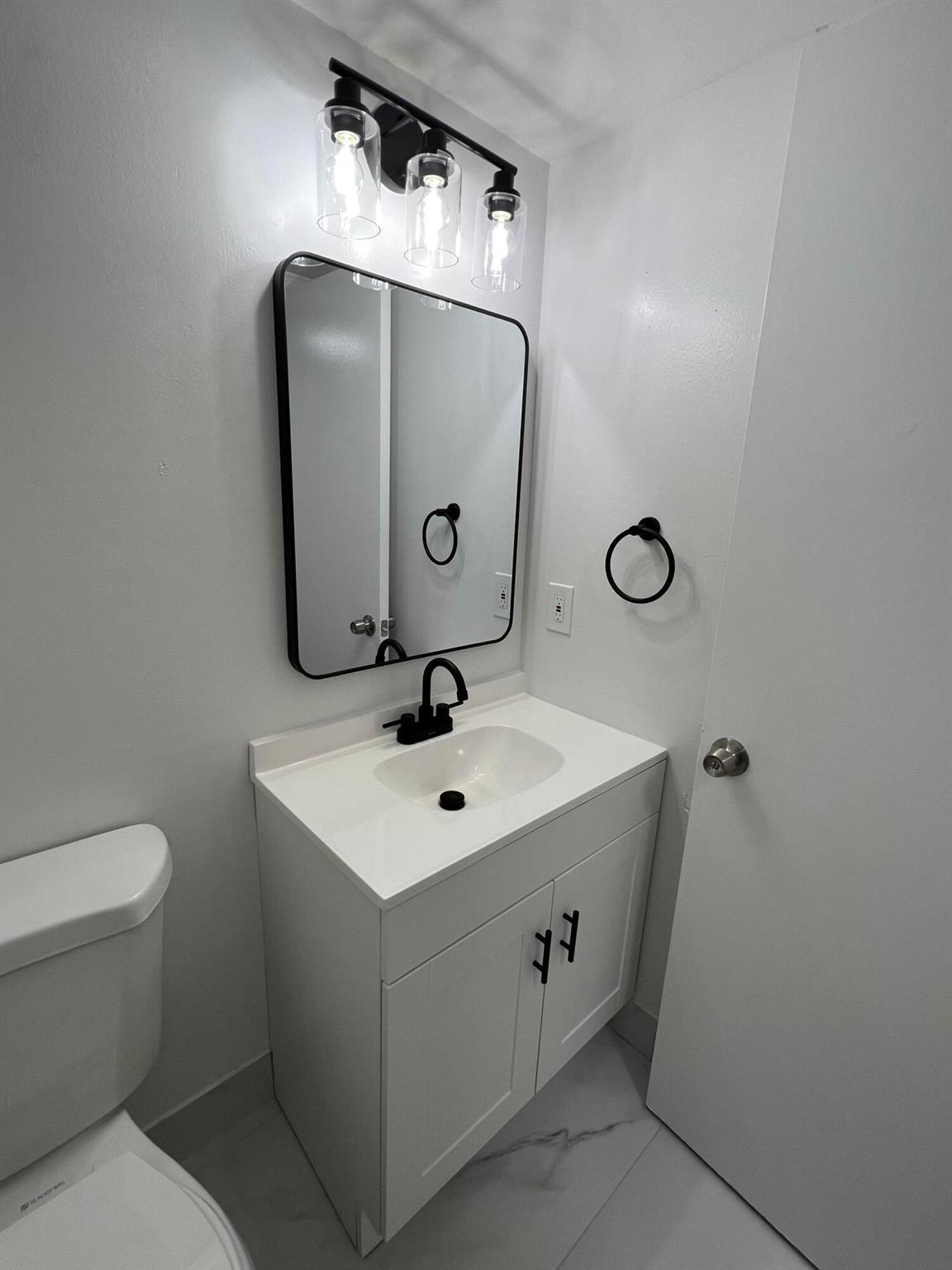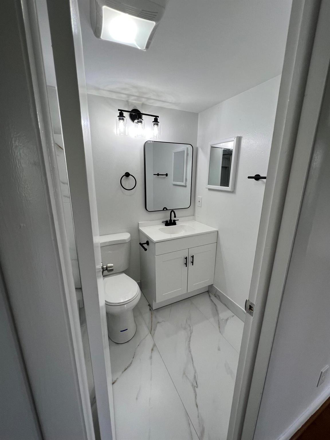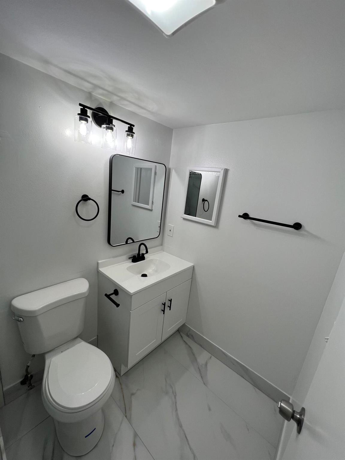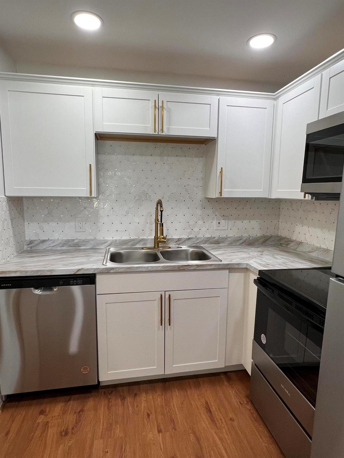 Beautiful 1st floor condo 1 and 1/2 bathrooms. Completely remodeled. New Kitchen and Marble look countertops and 3D Marble Backsplash. All new wooden shaker white kitchen cabinets with updated gold handles and crown molding on top. New LED recessed lighting in the ceiling and all brand new designer stainless steel kitchen appliances, which includes over the range microwave and dishwasher. New vanities and toilets in both bathrooms. Newly designed master bathroom with new shower walls, floors and a rainfall shower head. LED lighting throughout the entire condo. This place is beautiful, and located on a dead end street, thus very little traffic. Serene And Very Quiet. ****GROUND FLOOR UNIT. ****** FURNISHED