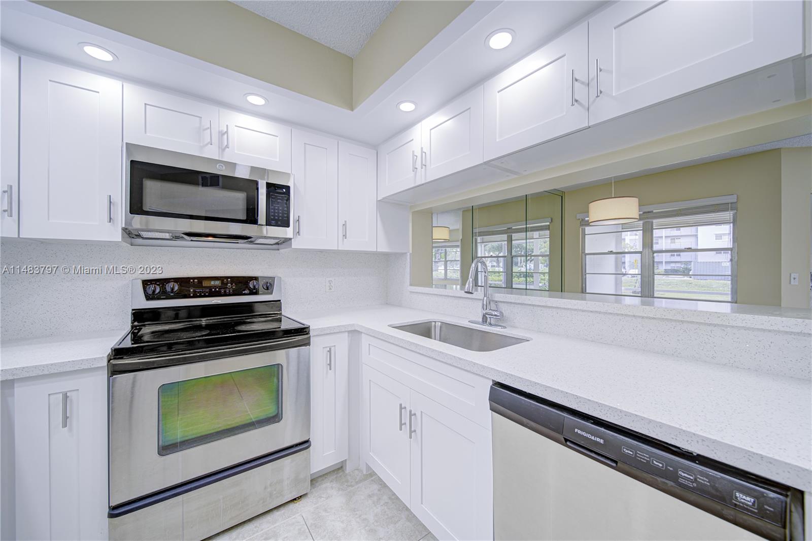 Welcome to this newly updated and spacious condo on the first floor. Tiled throughout and freshly painted, this bright unit is located in a very private and serene area within the village.The kitchen and both of the bathrooms showcase brand new pristine white shaker cabinets, new quartz countertops/backsplash, new sinks, new faucets, and new recessed lighting. The screened in porch features peaceful garden views. All windows have new blinds that allow for plenty of natural light to enter through or for privacy. Other upgrades include a brand new AC unit, dishwasher, microwave, and ceiling fans. Century Village is a 55+ gated community with an active adult lifestyle. All residents can indulge in endless amenities, yearound events, and social activities. Video Available. Priced to sell.