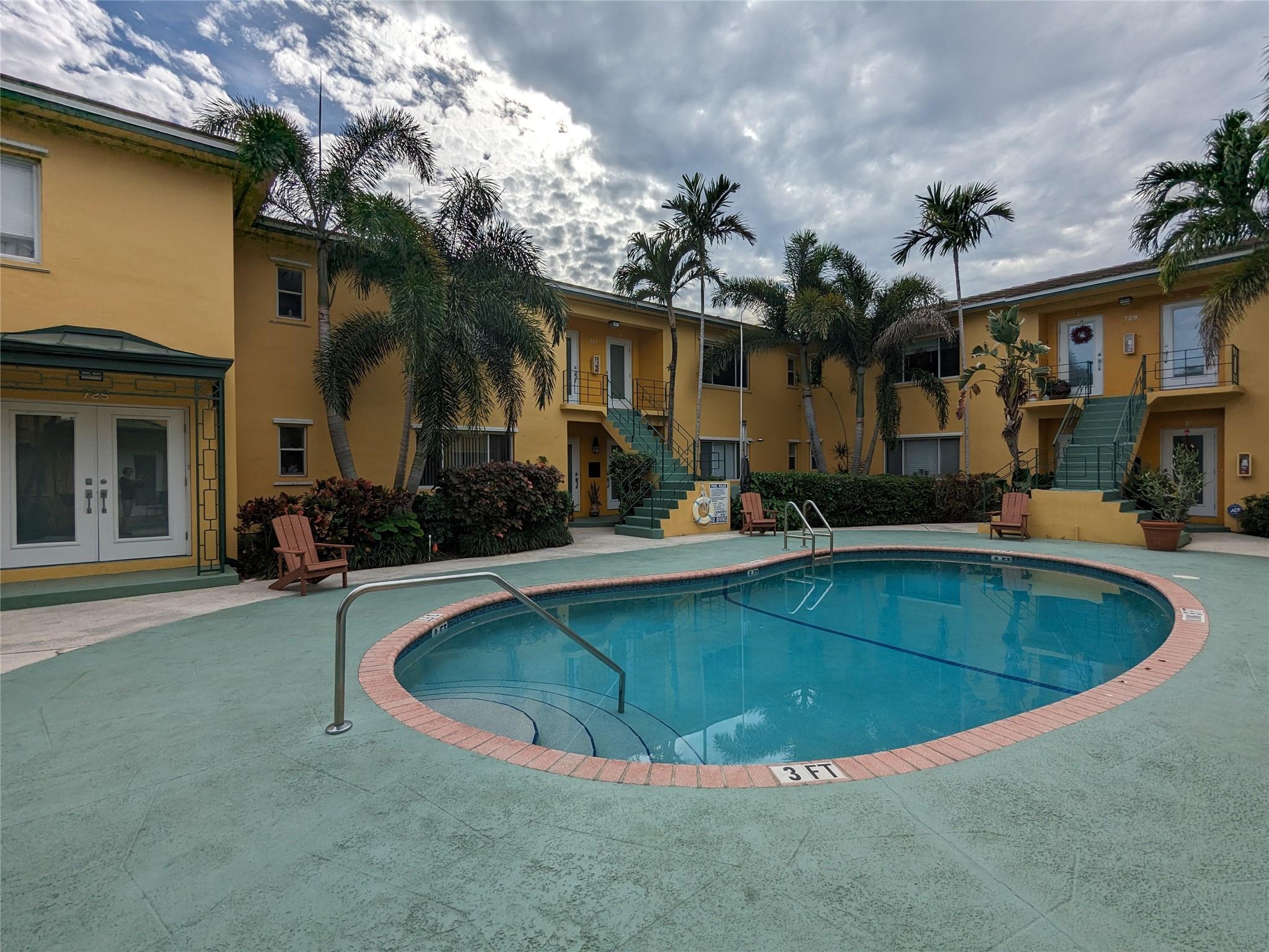 Hidden in Victoria Park, directly on the pool and courtyard, this unit and gorgeous complex are situated in the middle of downtown Fort Lauderdale. The assigned parking space is directly behind this apartment and easily accessible from the rear entrance. A bicycle ride to the beach, a walk to Las Olas, and seconds to airport, this apartment is the perfect place for a winter retreat from the north, or the business person that is tired of the daily commute to downtown. The apartment has a separate kitchen, walk-in coat closet, large living room with eat-in dining and picture window views of the pool and garden area.