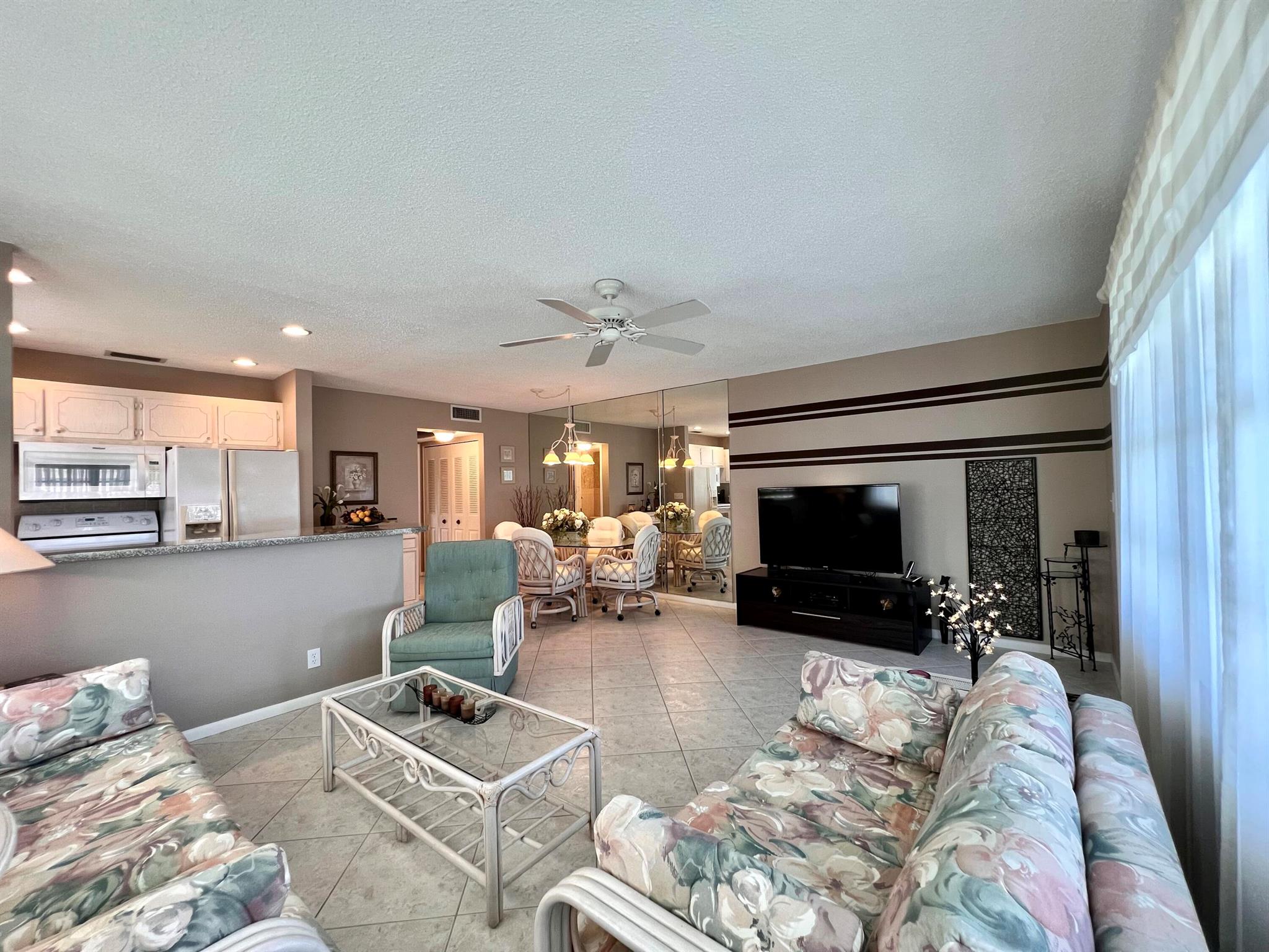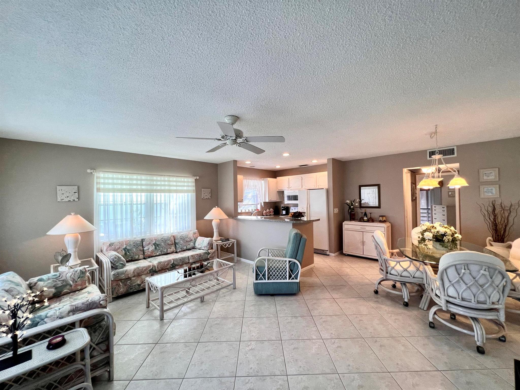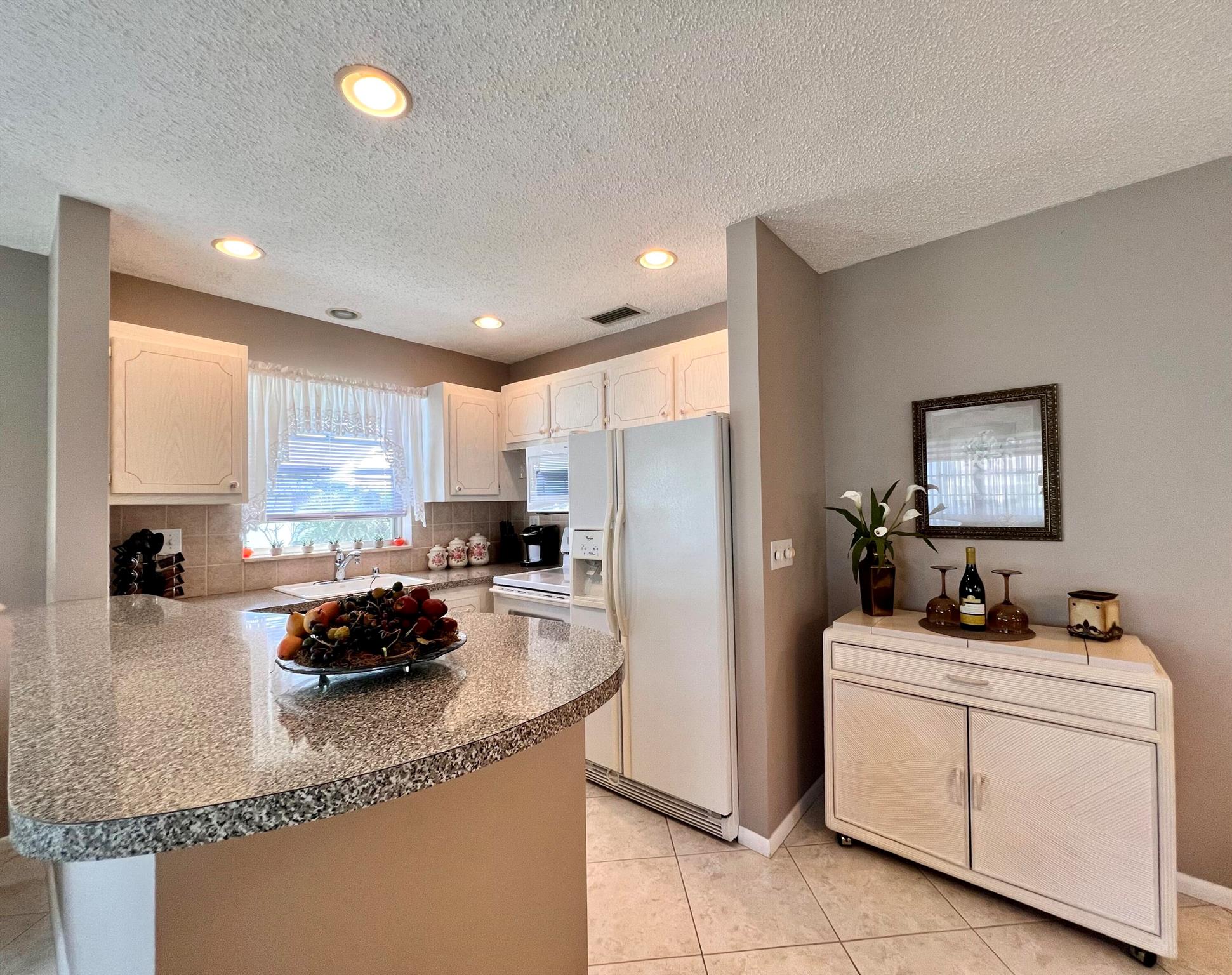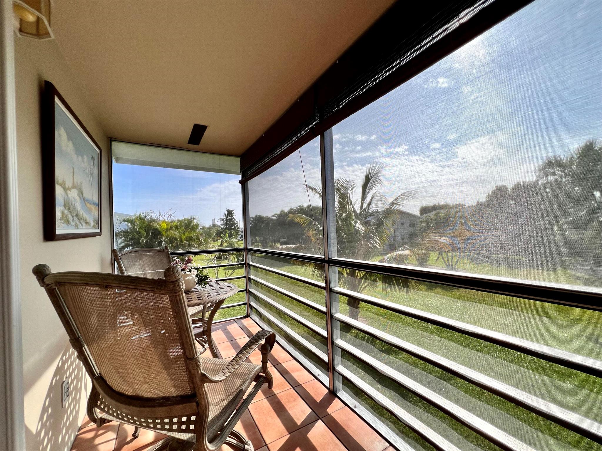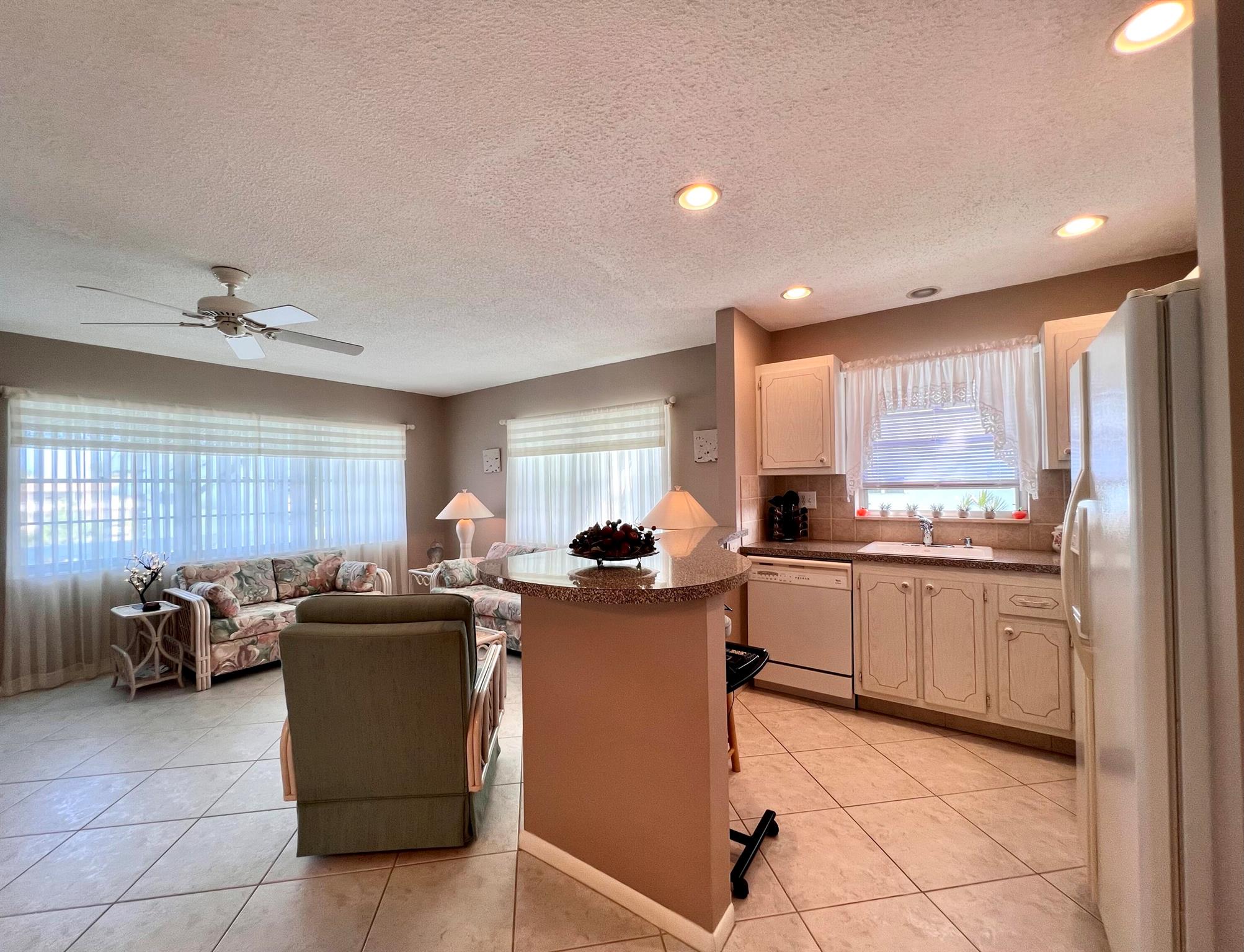 BRIGHT & SUNNY IN 55+ CENTURY VILLAGE! Cheerful 1/1.5 beautifully maintained CORNER condo with updates. Pretty kitchen has been opened to the living area and features white appliances (including a dishwasher), high-hat lights, and a window over the sink. Updated baths. Neutral tile set on the diagonal flows throughout. Large bedroom suite with access to the screened lanai, wall of closets, and an updated full en-suite bath with step-in shower. Long screened lanai is the perfect spot to take in the Florida sunshine & breezes. Sold AS IS and Furnished (some items are excluded). Building is nicely maintained with second floor laundry, resident patio, and new roof (2023). Fantastic location close to Hastings Fitness Center. Century Village is a resort style 55+ Community with so much to offer