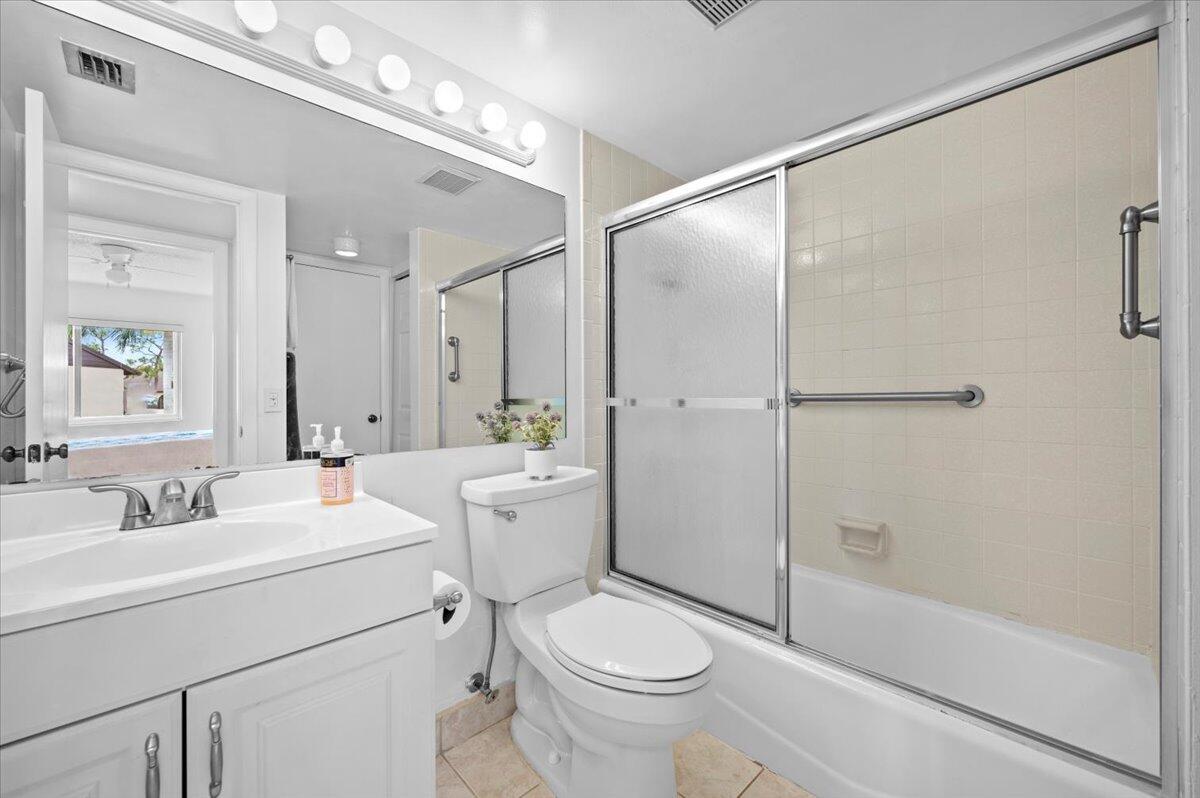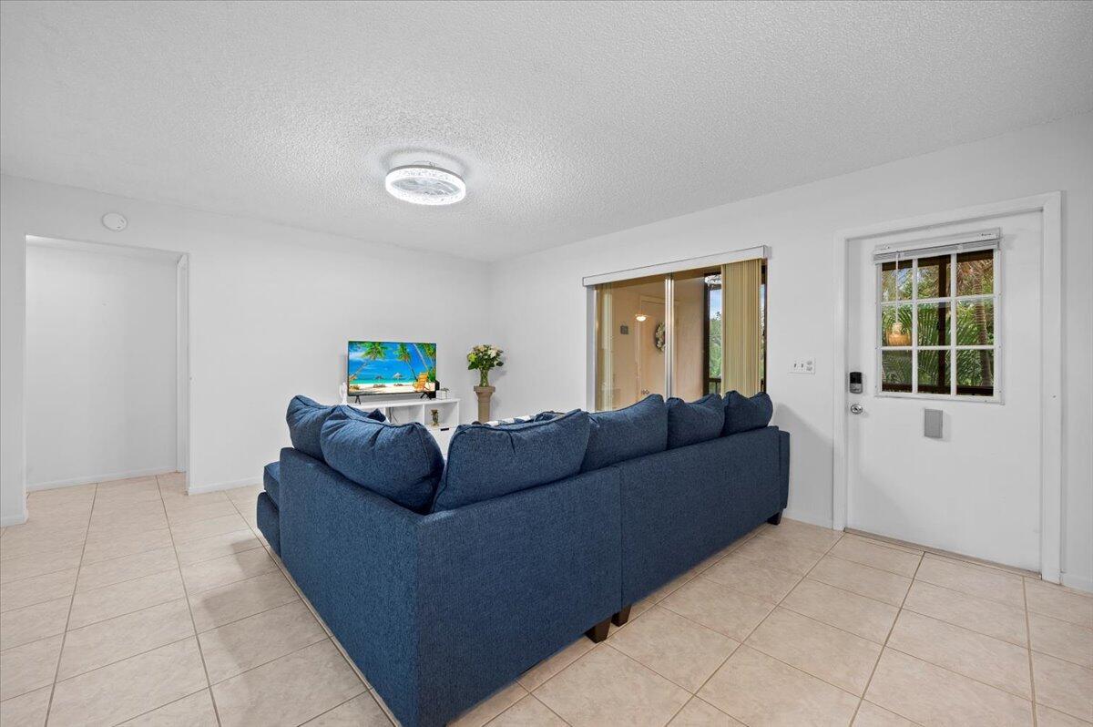 Welcome to your new home! Discover the charm of this inviting 2-bedroom, 1-bath haven that's ready for you to move in. Whether you're dreaming of spending winters in the warmth of Palm Beach County or seeking the perfect spot to kick off your sandals, you've found it. Nestled at the end of a quiet cul de sac, this unit offers a uniquely private setting. Step onto the awesome screened-in patio and soak in the tranquility as it overlooks a picturesque park-like setting. Inside, you'll find beautiful tile flooring complemented by plush carpeting in the bedrooms. The convenience of a separate laundry room with a full-size washer and dryer adds to the practical allure.Safety is a priority with accordion shutters adorning all windows and doors, ensuring excellent hurricane protection.