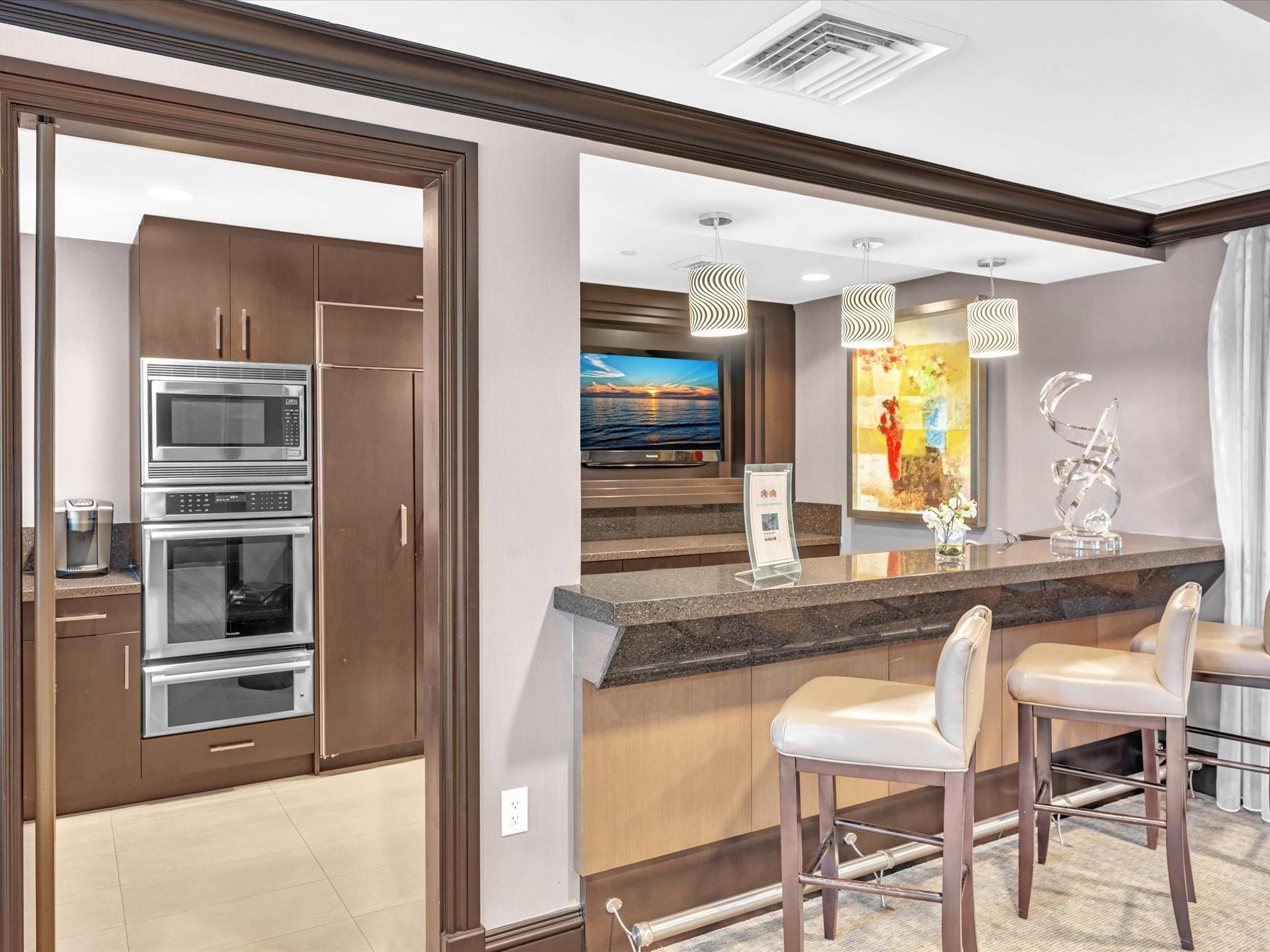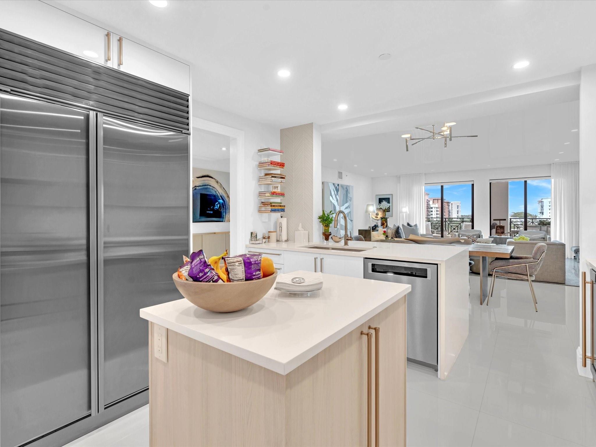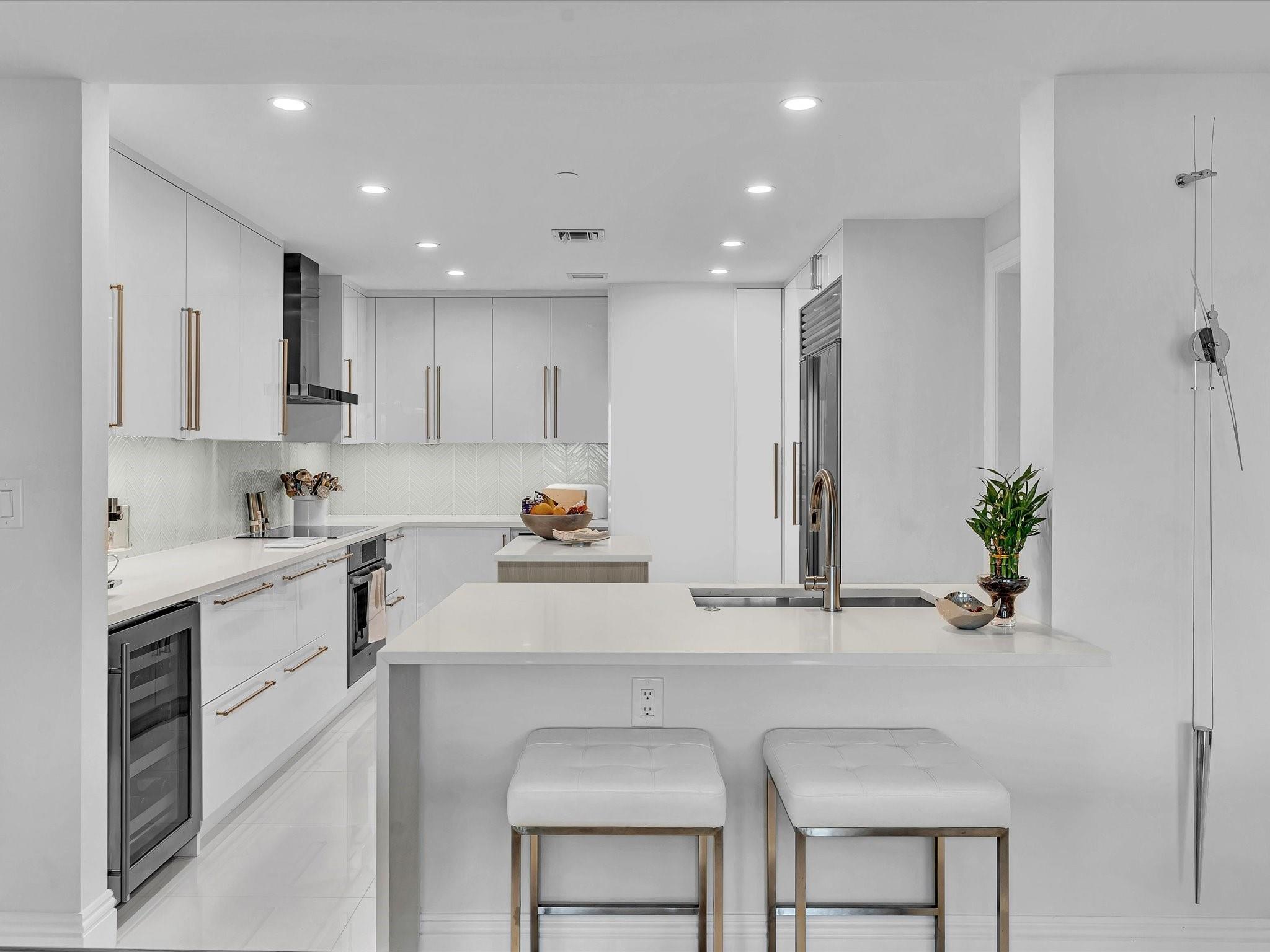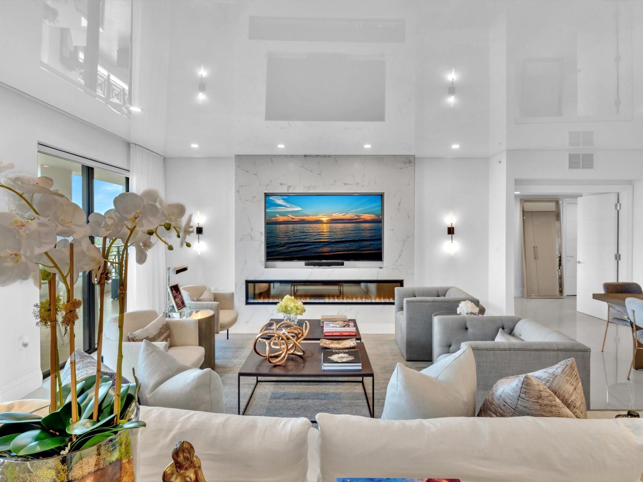 Walk through the double doors into the epitome of elegance-Unit has been recently remodeled in the best of taste- Kitchen features White high gloss cabinetry, stunning white countertops, Sub Zero refrigerator, and top of the line Stainless Steel Appliances and wine cooler-Luxurious White porcelain tile throughout -Split bedrooms Plus a Den With a tray ceiling and designer wall coverings-Breathtaking Electric Fireplace encased in porcelain accents the living room along with a Gorgeous stretch ceiling-Royal Primary Bathroom finishes with a King Size Shower and free standing bathtub-Designer light fixtures and wall coverings showcase this unit- Huge East facing balcony is like an extra room-Enjoy Coffee on the terrace and watch the sunrise ! NEW A/C !! Common areas being renovated