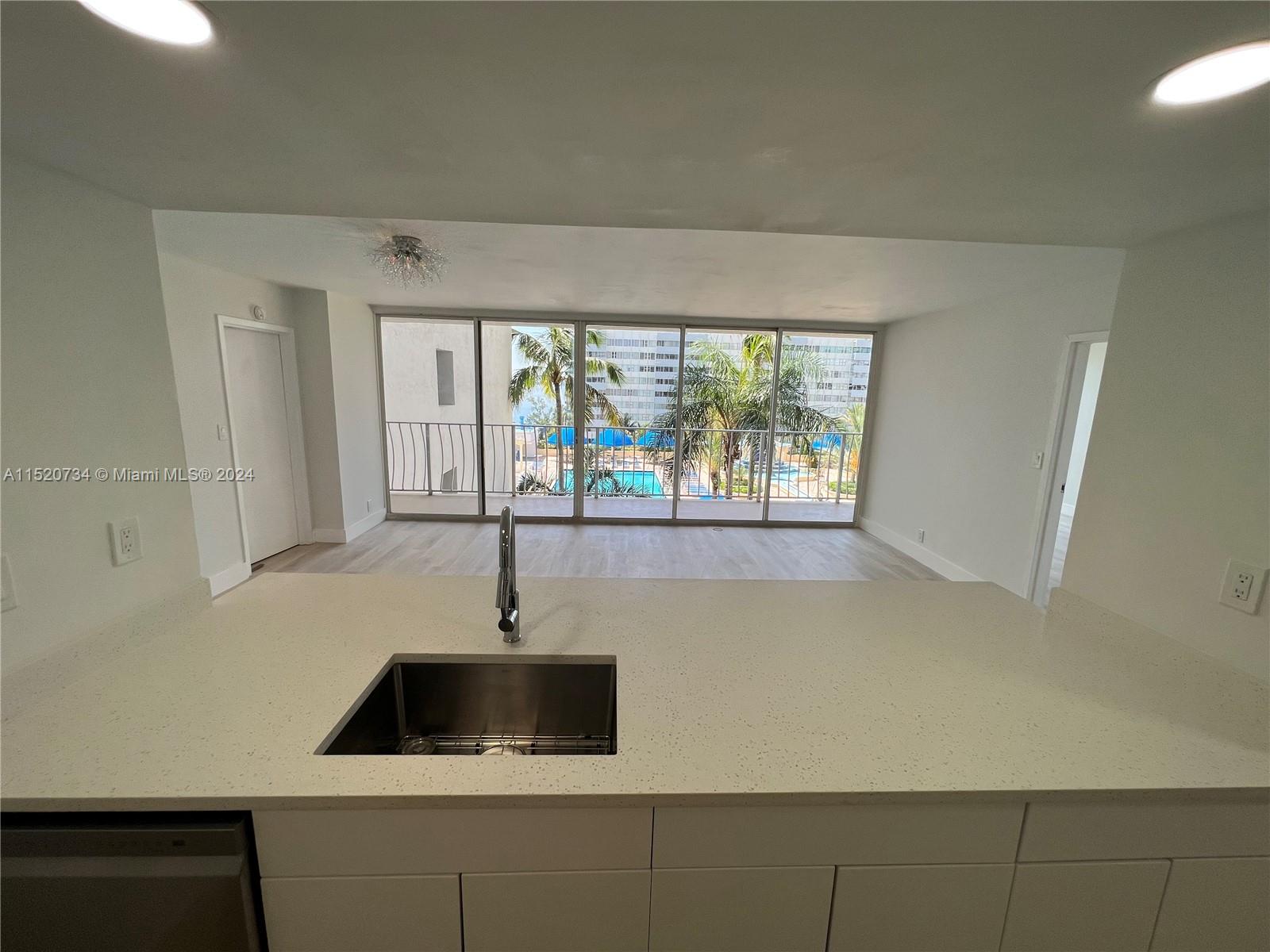 Beautifully remodeled 2bed/2bath unit with water views overlooking renovated swimming pool & tropical terrace area. All work was done with permits. New modern kitchen, bathrooms, flooring & lighting. Open split floor plan. Extra-large balcony. New A/C installed in 2024. One deeded covered garage parking spot. Additional parking can be purchased or leased. Security and management on site. Tenant in place until October 31, 2024. Current tenant pays $2,900/monthly. No Special Assessments. Management also says they have enough reserves to cover upcoming cost for 40 yr. recertification