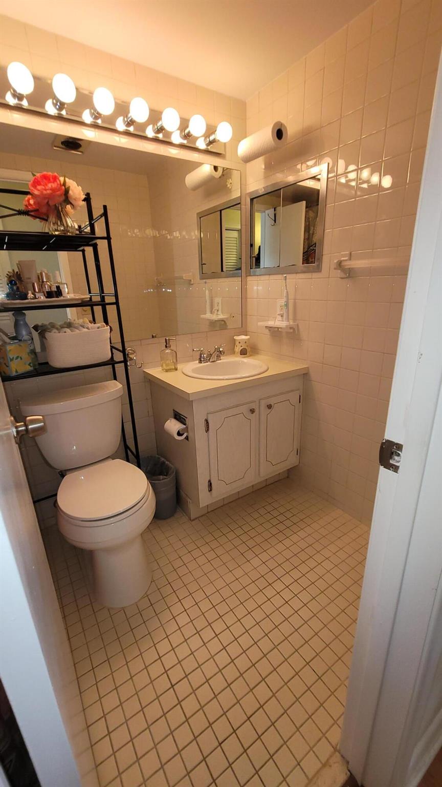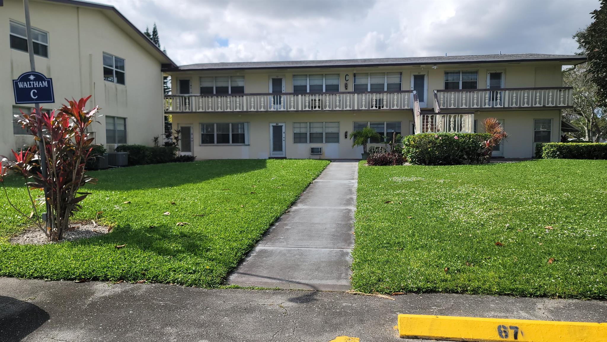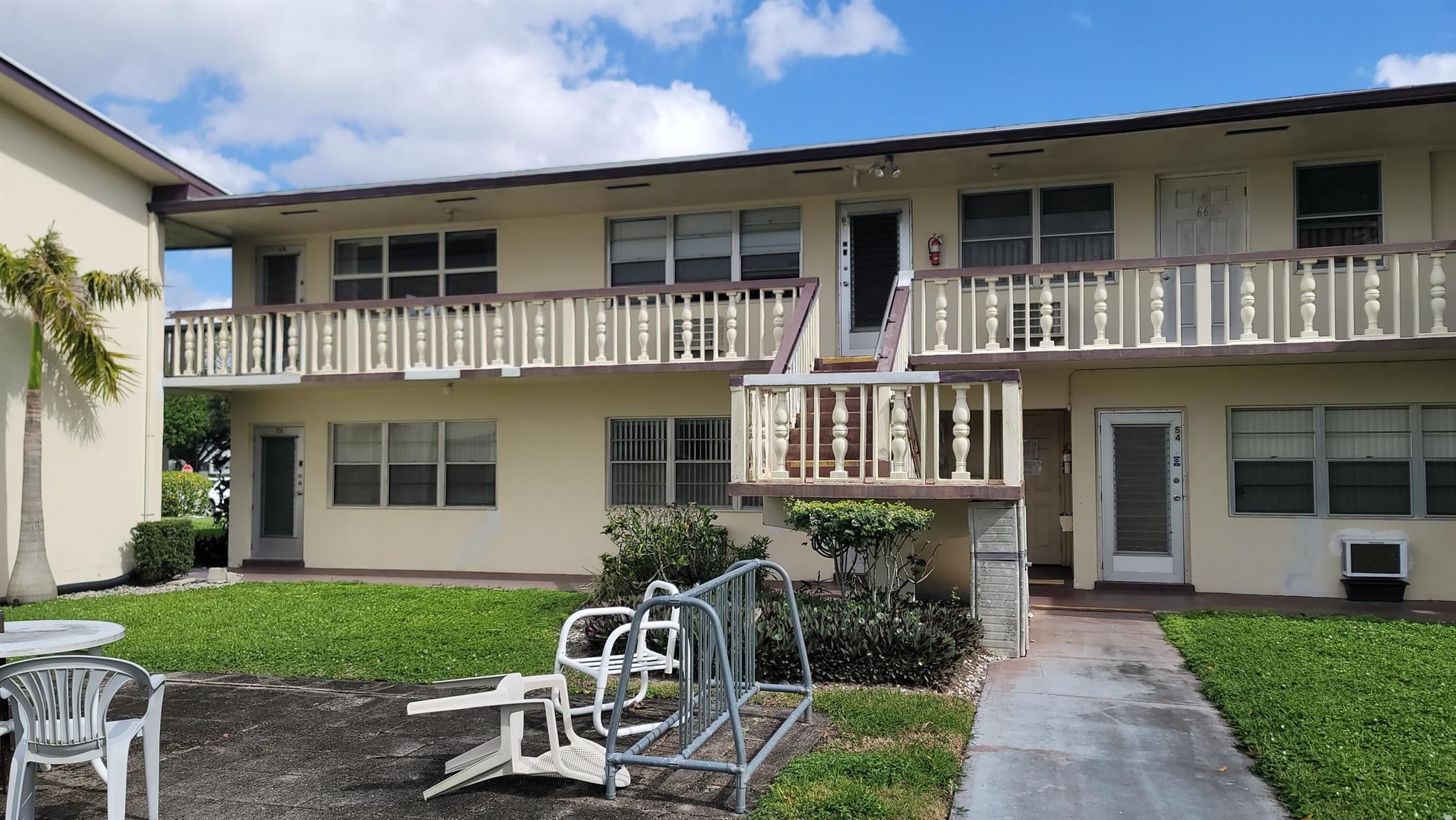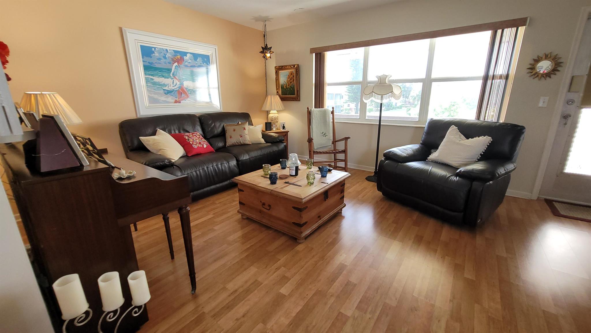 Welcome to the paradise of South Florida, resort-style social living at its absolute best. Enjoy wonderful garden views from this beautiful, fully furnished, one bedroom, one and one-half bath condo located in sunny West Palm Beach Florida and experience the distinct Century Village ''way of life'' with luxurious recreational facilities and abundant social activities. Very private inside corner or end unit. Fully furnished on the second floor of a very well run and friendly Association. Wood laminate floors throughout living areas and tile in kitchen, dining room and bathrooms. The kitchen features wood cabinets and quartz backsplash and countertop, with newer appliances. Impact windows front and sides, accordion shutters on bedroom slider. Piano does not convey.