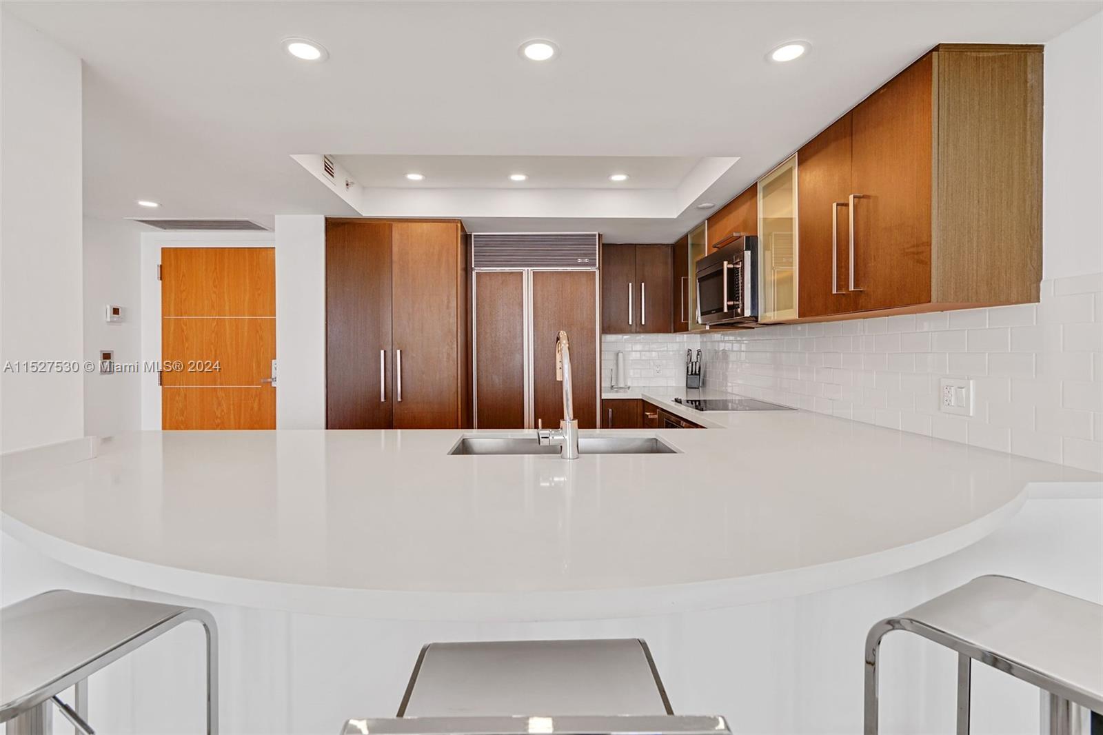 Completely remodeled contemporary residence with sweeping ocean views located in the highly coveted South of Fifth neighborhood in South Beach. This stunning beach home features an elegant design & upgraded impact windows flooding the residence with natural light & beautiful ocean views from every angle. Spacious balcony with brand new tile just installed. Modern open kitchen with a large quartz countertop with seating room from the living area. A well appointed master bedroom suite, with a modern ensuite bathroom, walk-in shower & 2 brand new custom wood walk-in closets. TWO ASSIGNED PARKING SPACES! Enjoy a huge brand new pool deck, new gym, tennis courts, dog park, 24 hour security, valet, concierge & more. Walk to the beach in minutes, top rated restaurants, beautiful parks & Marina.