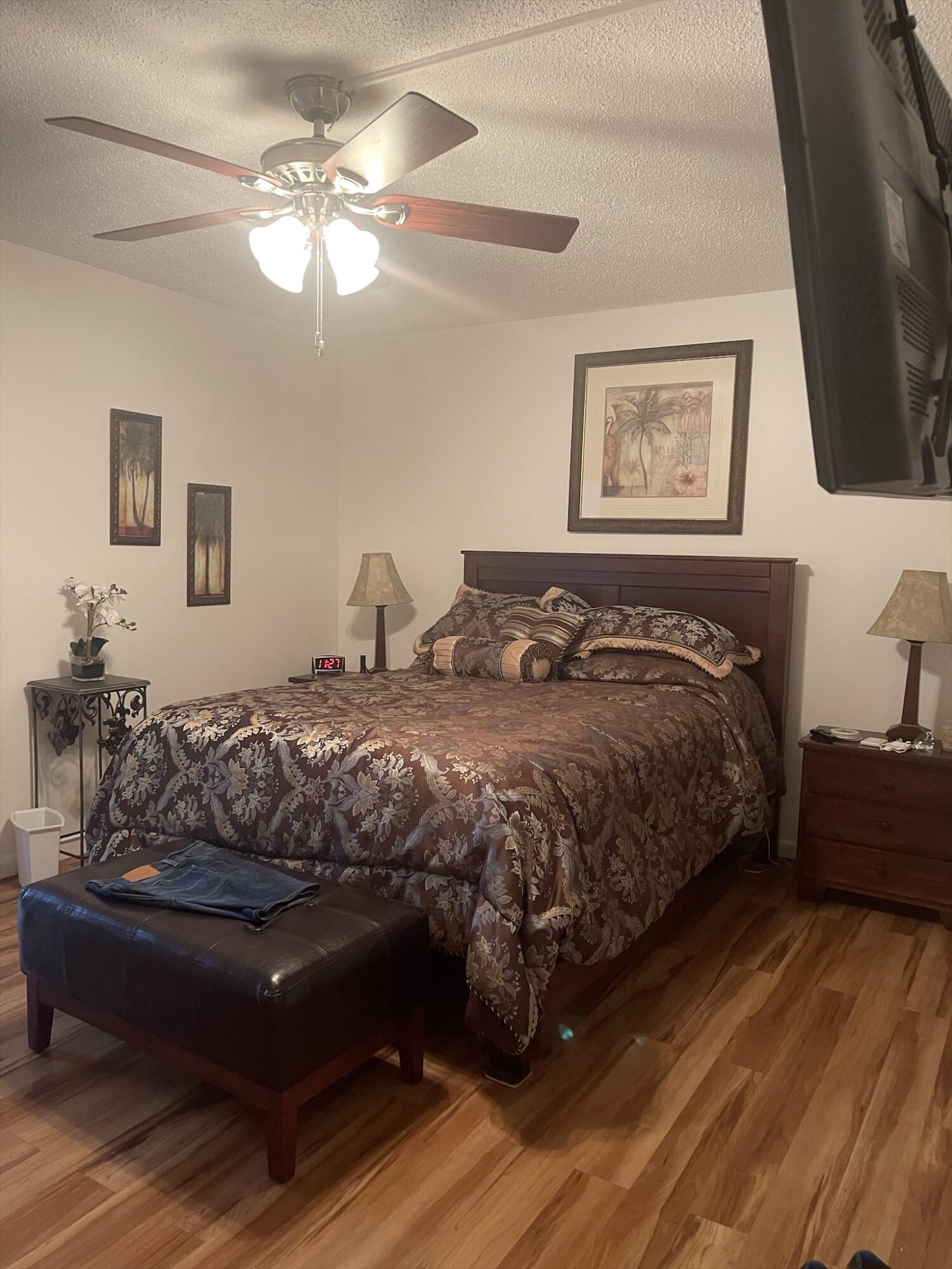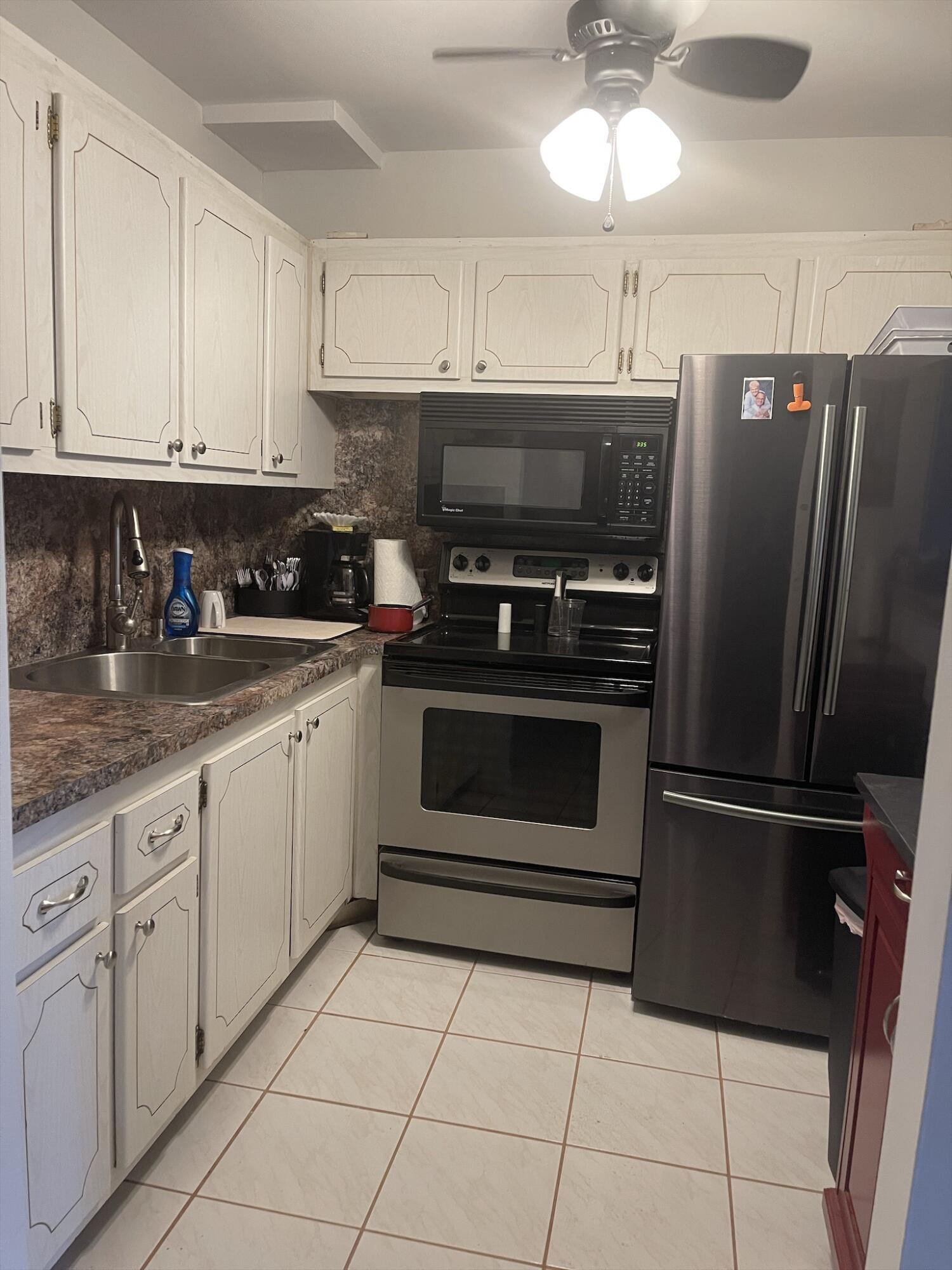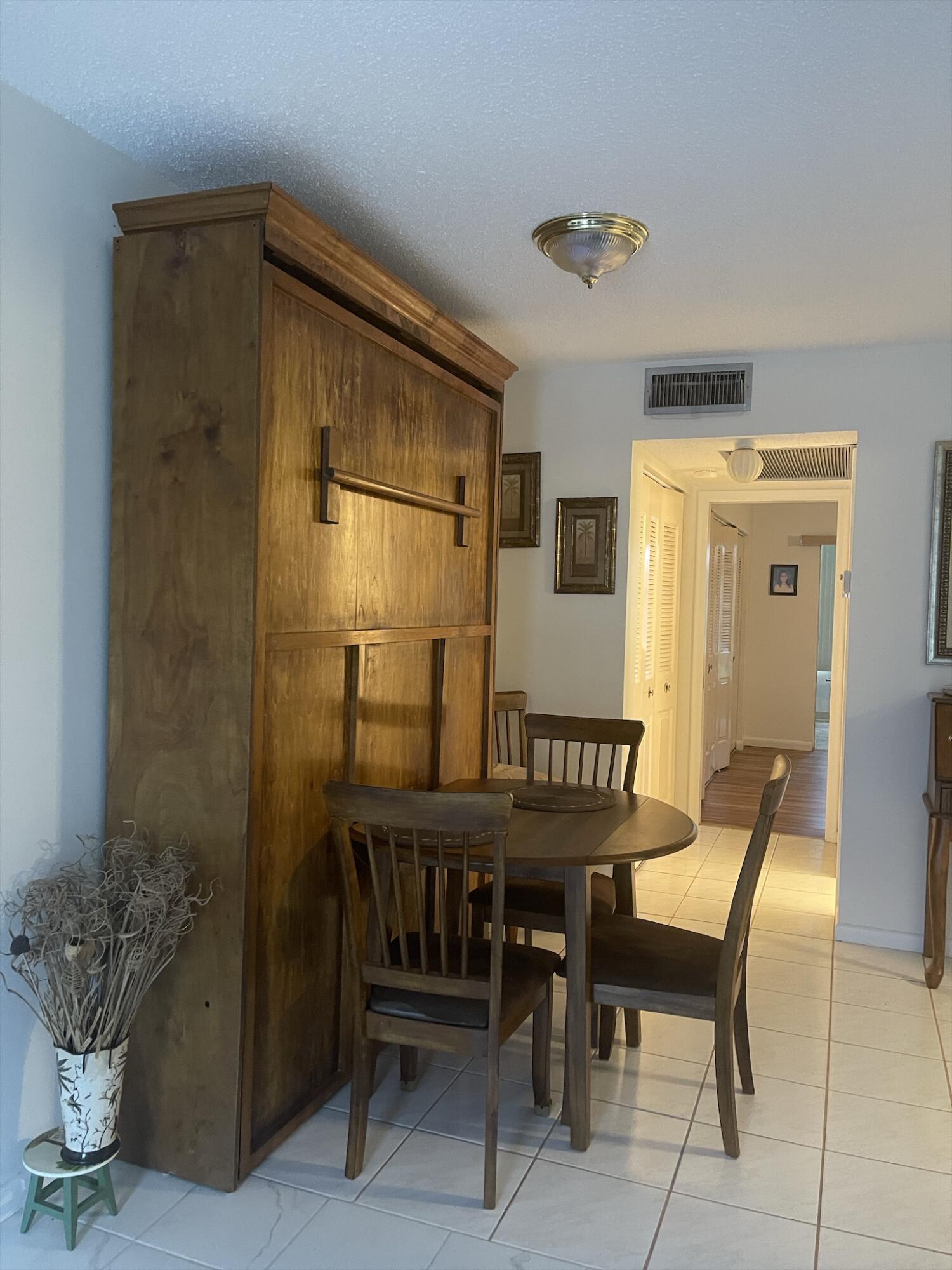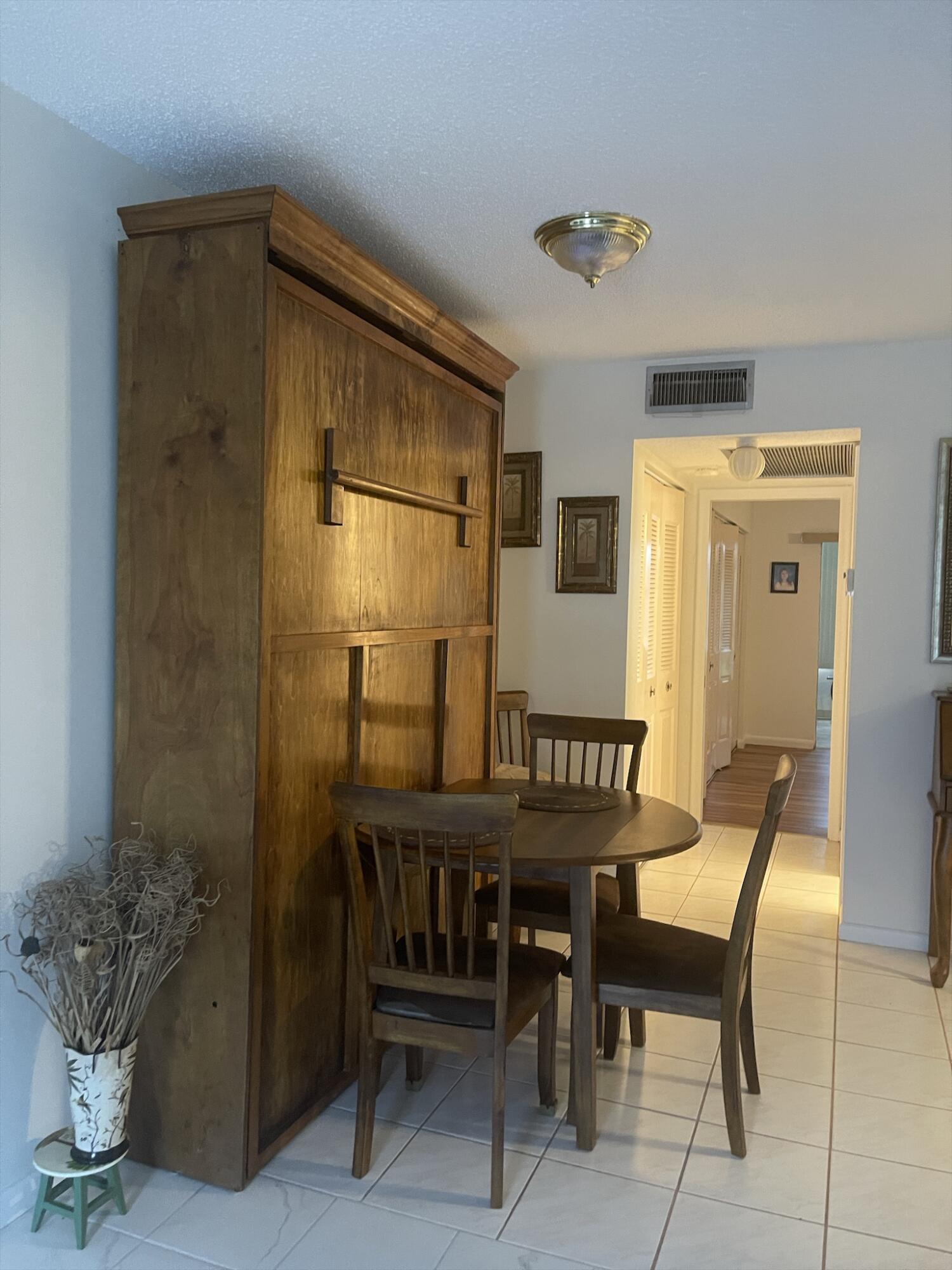 WOW!!! NICE UNIT IN A GREAT BUILDING. One bedroom, one and a half baths, first floor, near elevator, trash chute and laundry room. Directly across from Southampton pool. Assigned parking space (34) very close and directly in front of unit.Living Room (LR)/Dining Room (DR)-o Large with 52inch ceiling fan and lights (LR)o Gray/white ceramic tile installed three years ago (LR)o Queen size light oak Murphy bed to remain with unit (DR)o Wall mounted large television bracket and glass component shelf with cable and power outlet Kitchen -o Custom crafted counter tops and backsplash with Formica laminate and stainless-steel double bowled sinkwith pull out sprayero Black 32-inch ceiling fan with light kito Thirty-inch slide in range.......(read next page)......