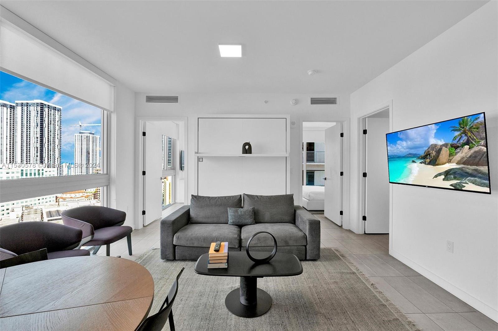 A beautiful, fully furnished, turnkey 2-bedroom unit located in the heart of Downtown Miami. It boasts modern decor and stunning views of downtown Miami. NO rental restrictions!!! Great opportunity for investors. The location is excellent, just one block from Bayfront Park and directly across from the First Street Metromover station. The building is a high-rise with fantastic amenities, including a beautiful swimming pool, gym, restaurant, bars, rooftop residence lounge, etc. Valet parking and 24/7 security. Come to see it now!