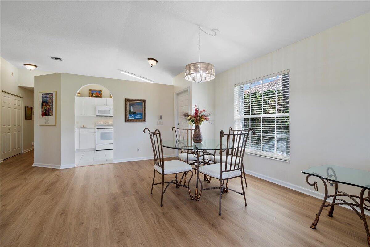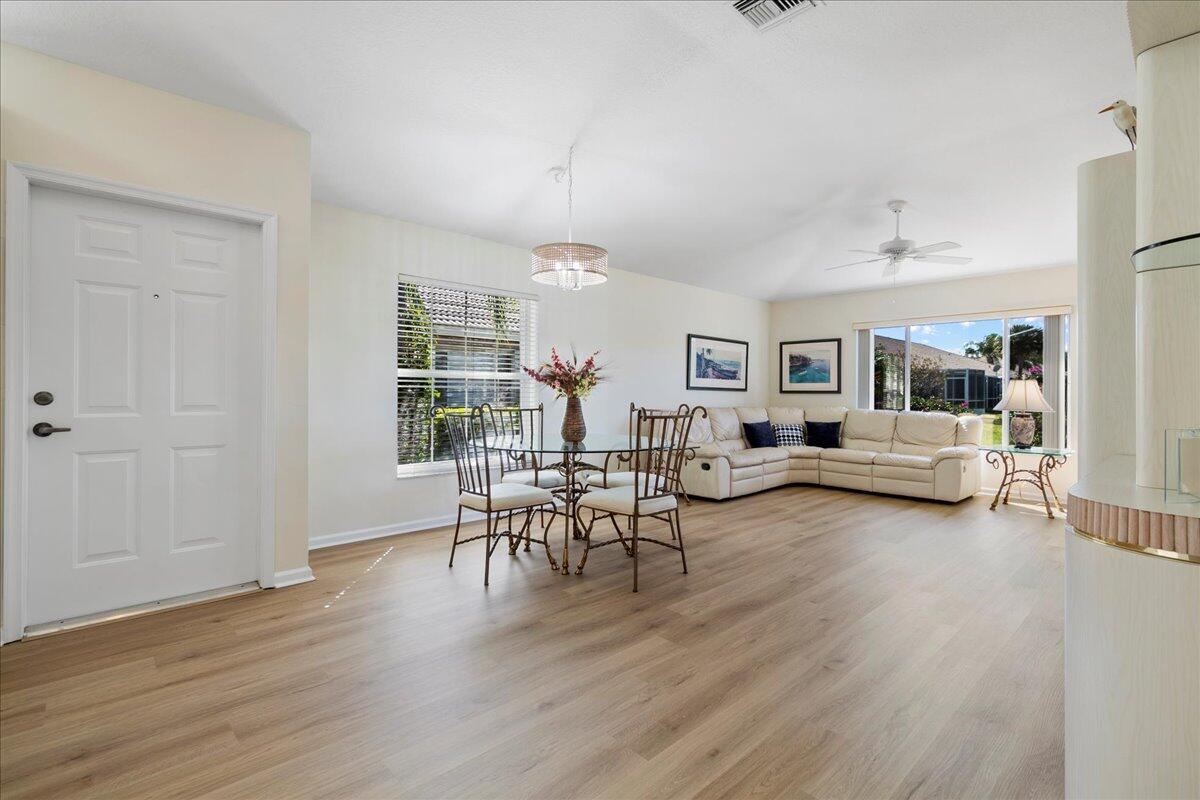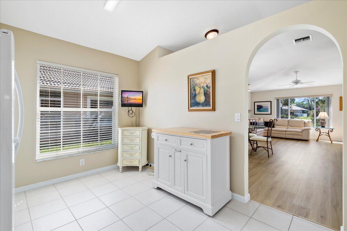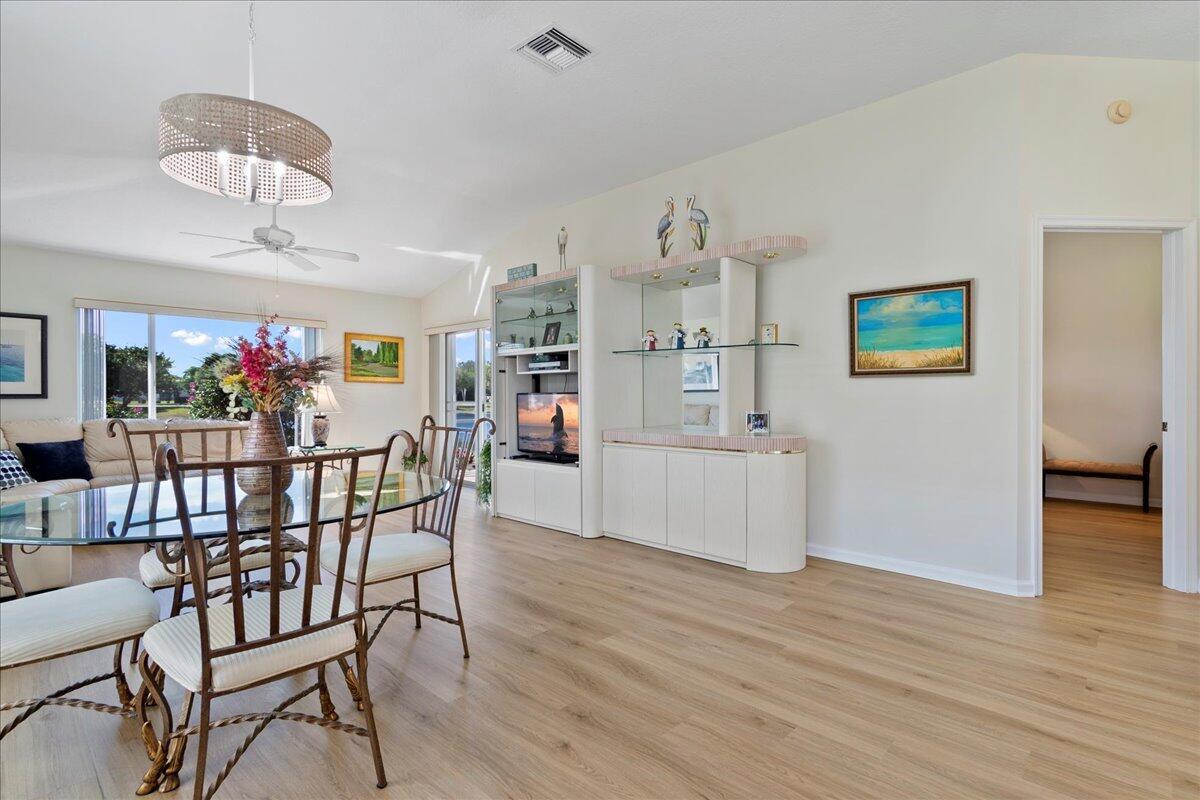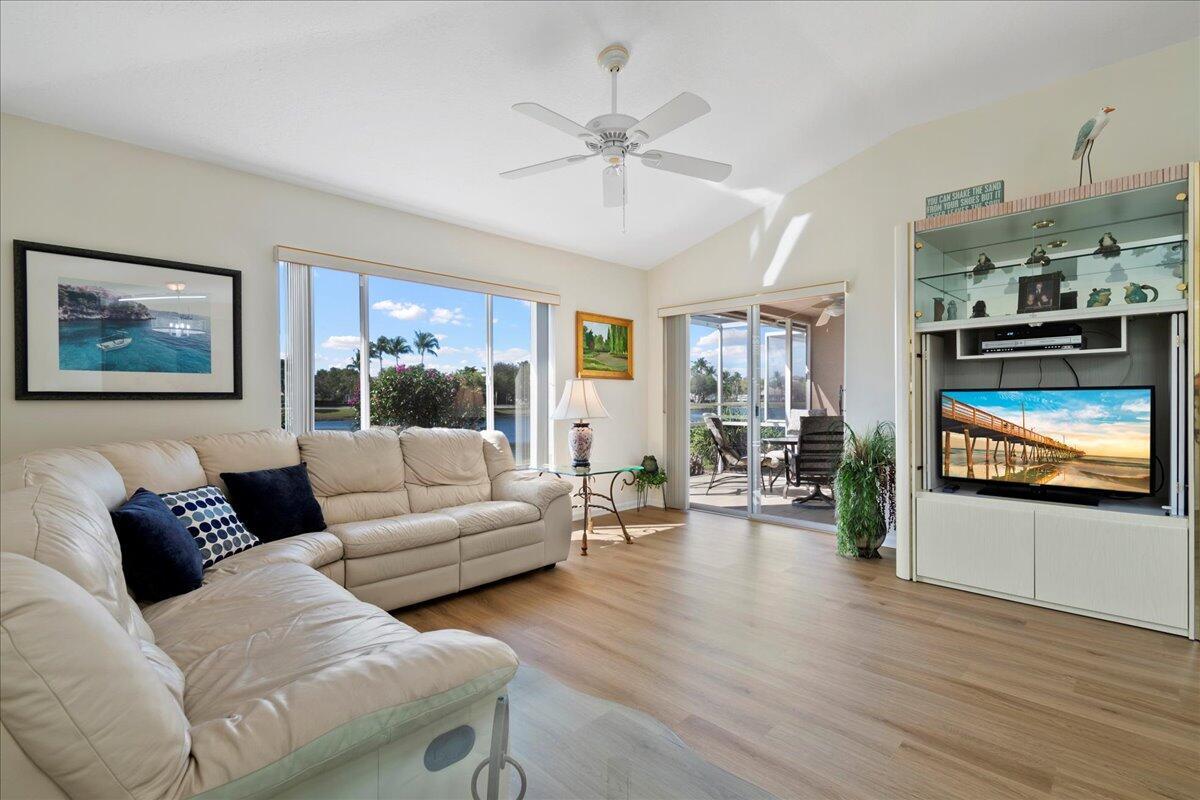 Welcome to your dream lakefront villa in the highly sought after gated community of Bay Colony within Andros Isle! This single-story villa is a haven of comfort and style, boasting 3 spacious bedrooms, 2 bathrooms, and a 2-car garage in an inviting split-floorplan. As you step inside, natural light floods the living spaces, complemented by new Luxury Vinyl flooring throughout. The large living and dining areas offer breathtaking water views, painted in neutral tones that create a serene atmosphere. The well-appointed kitchen features white cabinets, tile flooring, and its own TV, accompanied by a movable island for added storage. The grand primary suite echoes the luxury vinyl floors and lakefront views, complete with a spacious bathroom featuring dual sinks, a newer