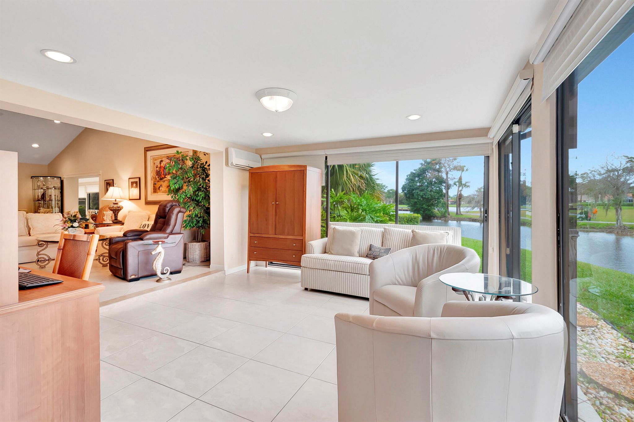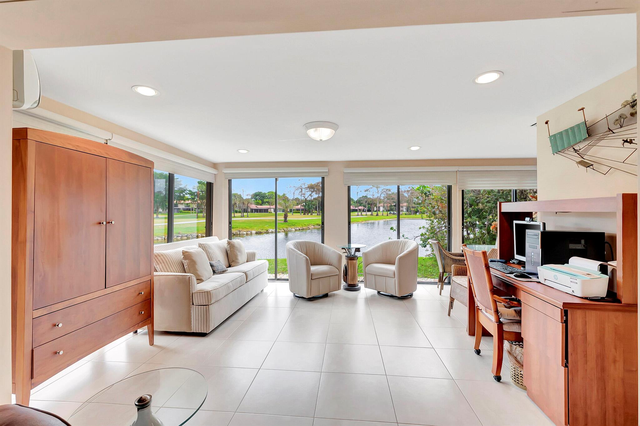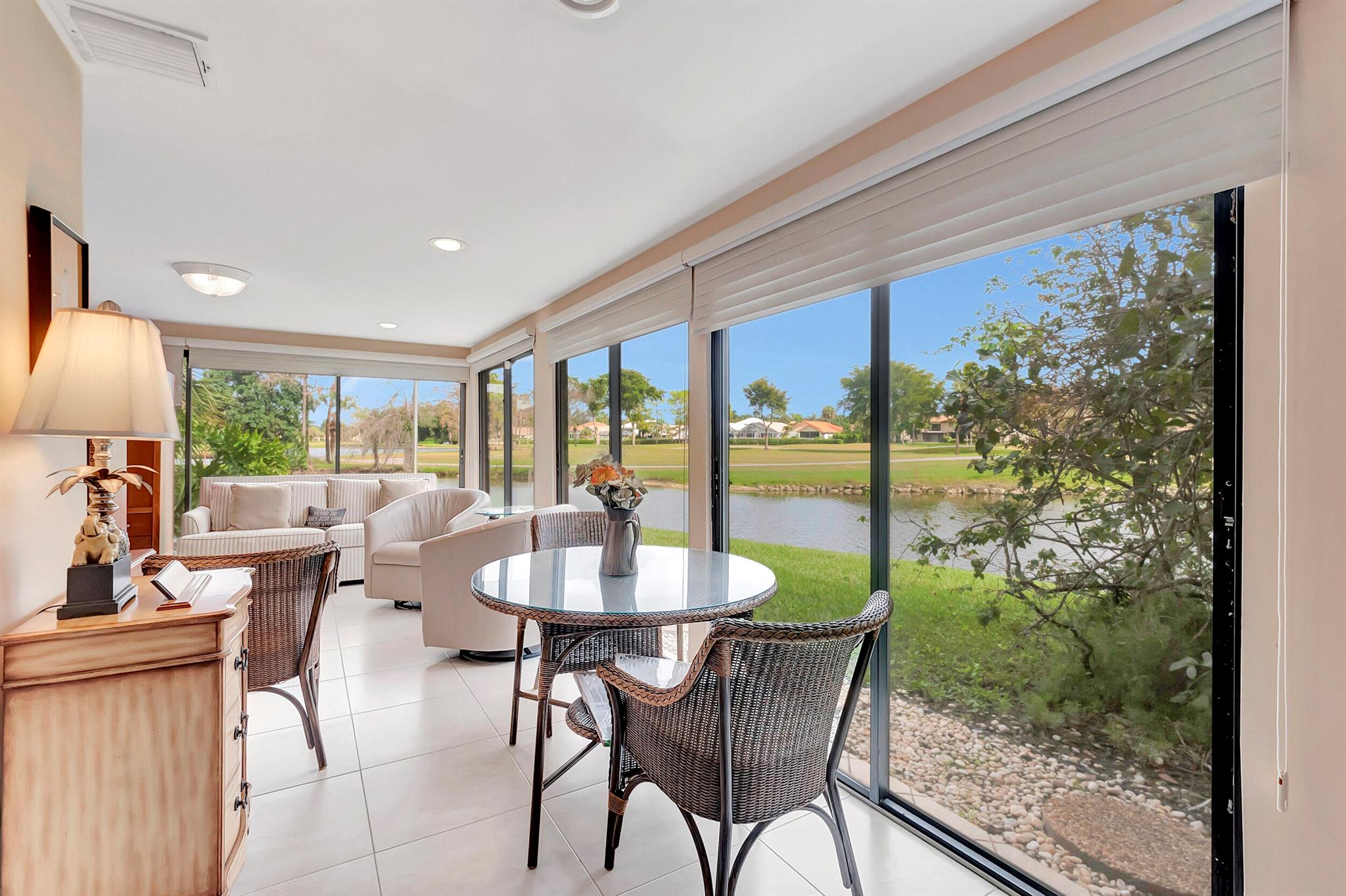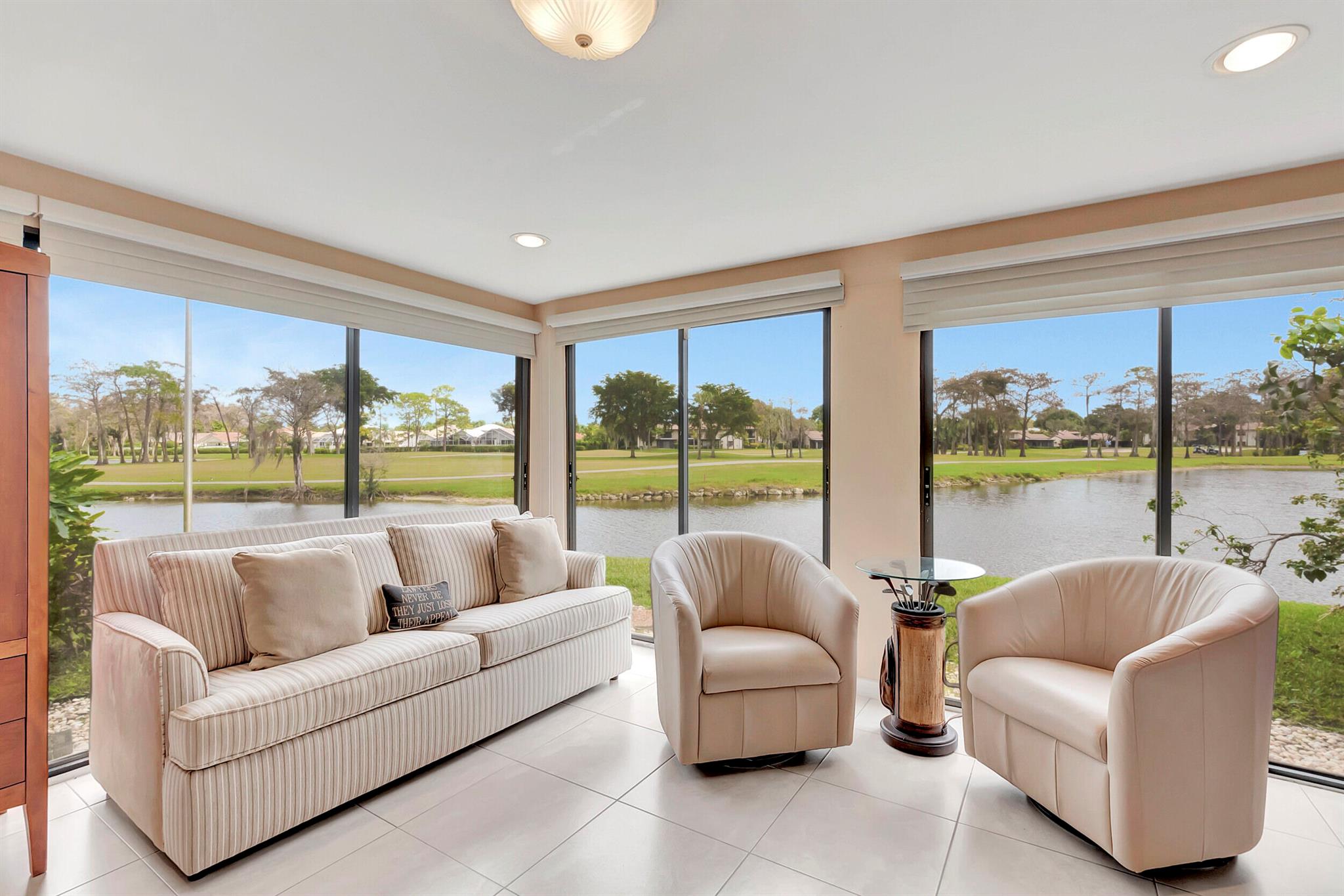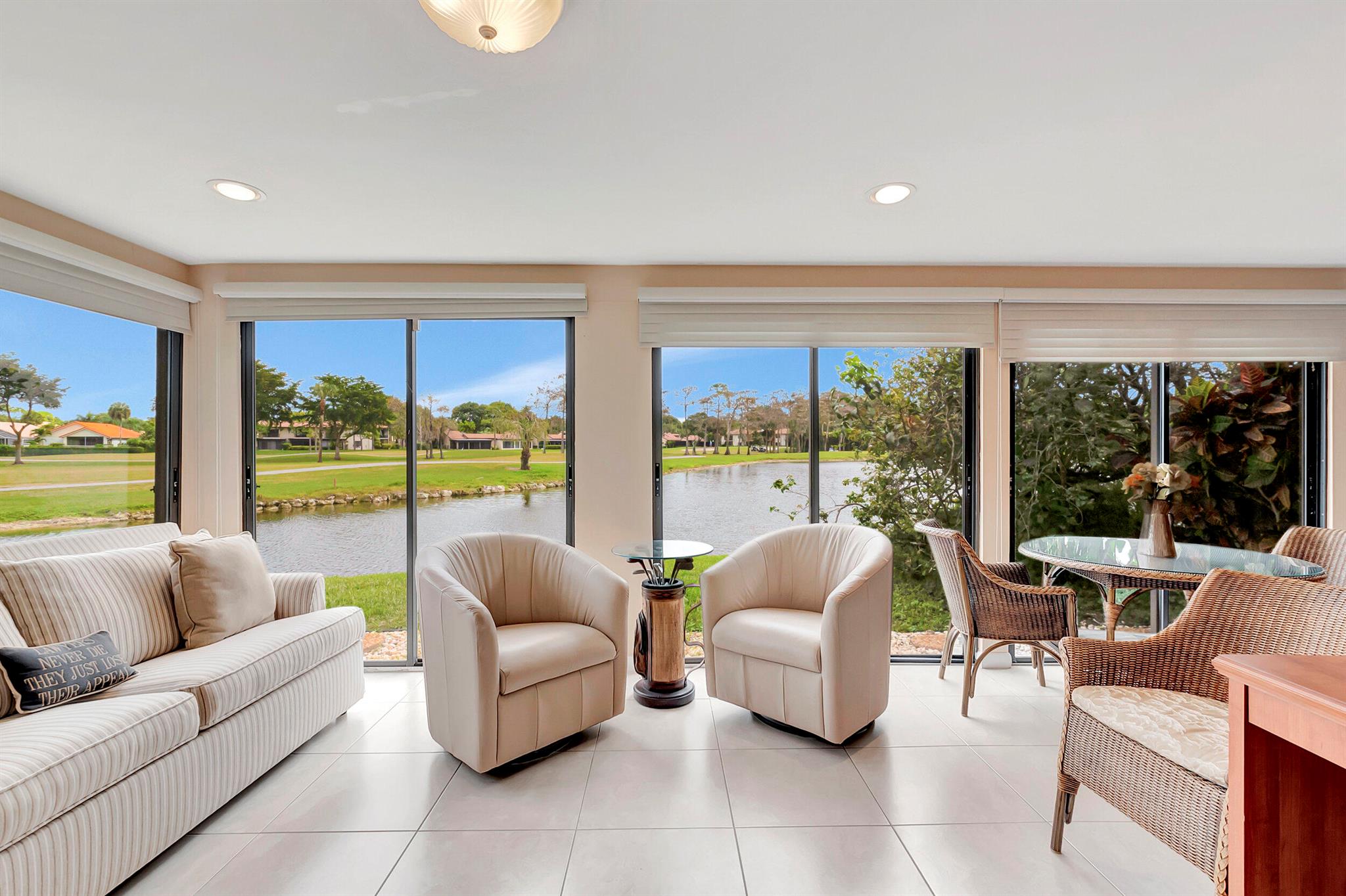 Rare find alert! This stunning 2 bedroom, 2 bathroom villa is located on a picturesque lake with a golf course view. No membership required! Stainless steel appliances, granite counter tops, custom cabinet. High volume ceiling this home is sure to impress. Enjoy the sunset views from the enormous glass enclosed patio with one of the best water views. Plenty of closet space and ample storage this home has everything you need. A/c 2020, water .heater 2020, NEW ROOF .Club membership is available but NOT required! Must see!