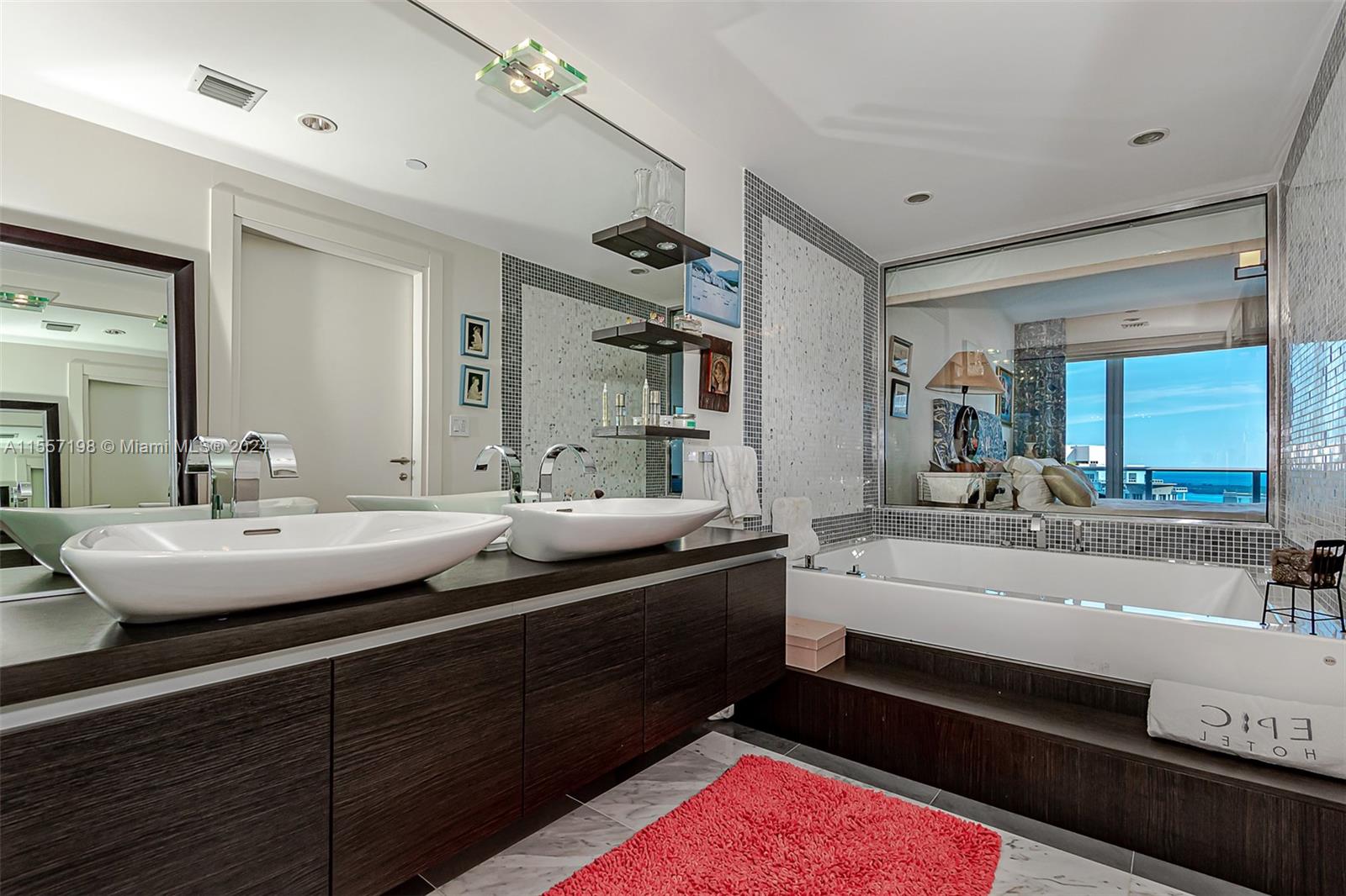 Spectacular two bedroom, two and a half bath split plan unit. Dining room +den space total interior 1,598 sq.ft. per developer's floor plan. High floor, amazing direct water views and city views. Ideally situation between downtown Miami and Brickell City Center. Walk to Whole Foods, theaters, restaurants. Adjacent to 1st class Kimpton Hotel w/ full services; top-rated restaurants on site Zuma and Area 31, A private pool for residences plus social hotel pools with service, Spa/Yoga and fitness plus 24/7 concierge and valet available. So much comes with an Epic Residence. Unit features top of the line finishes 10 ft ceilings, walk in closets, oversize balconies with floor to ceiling impact doors: all with window treatments. Assigned covered parking and private storage included