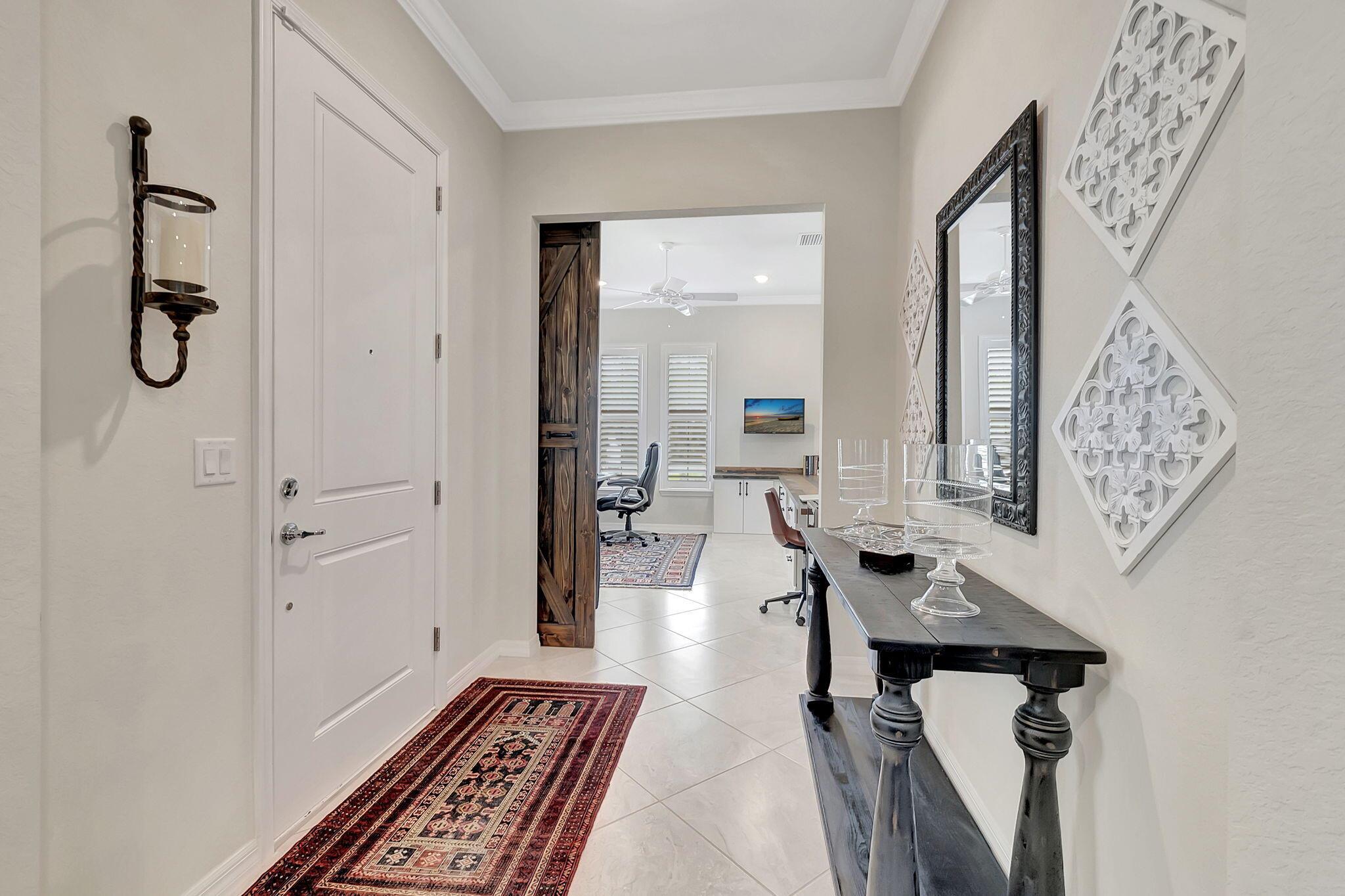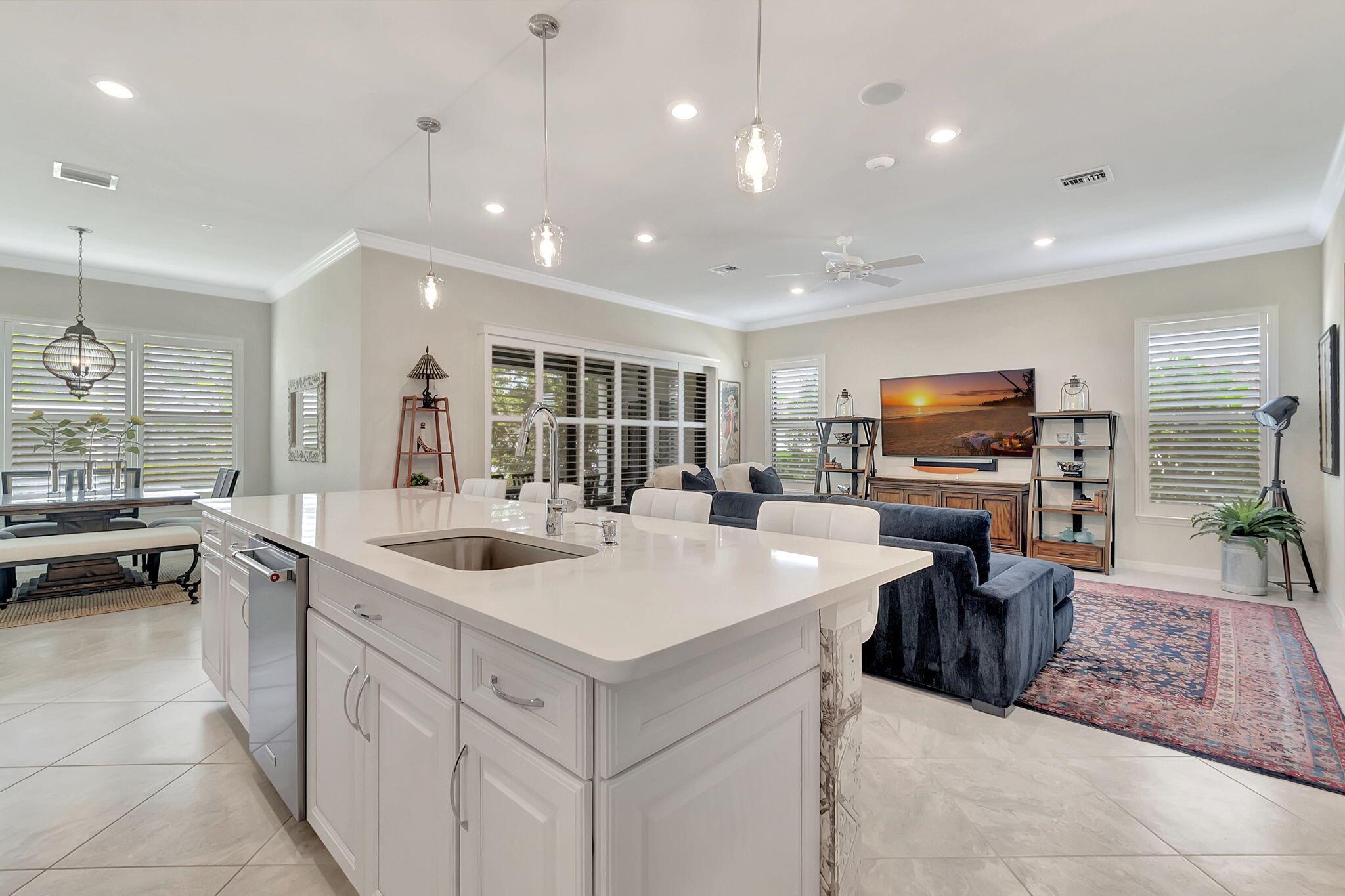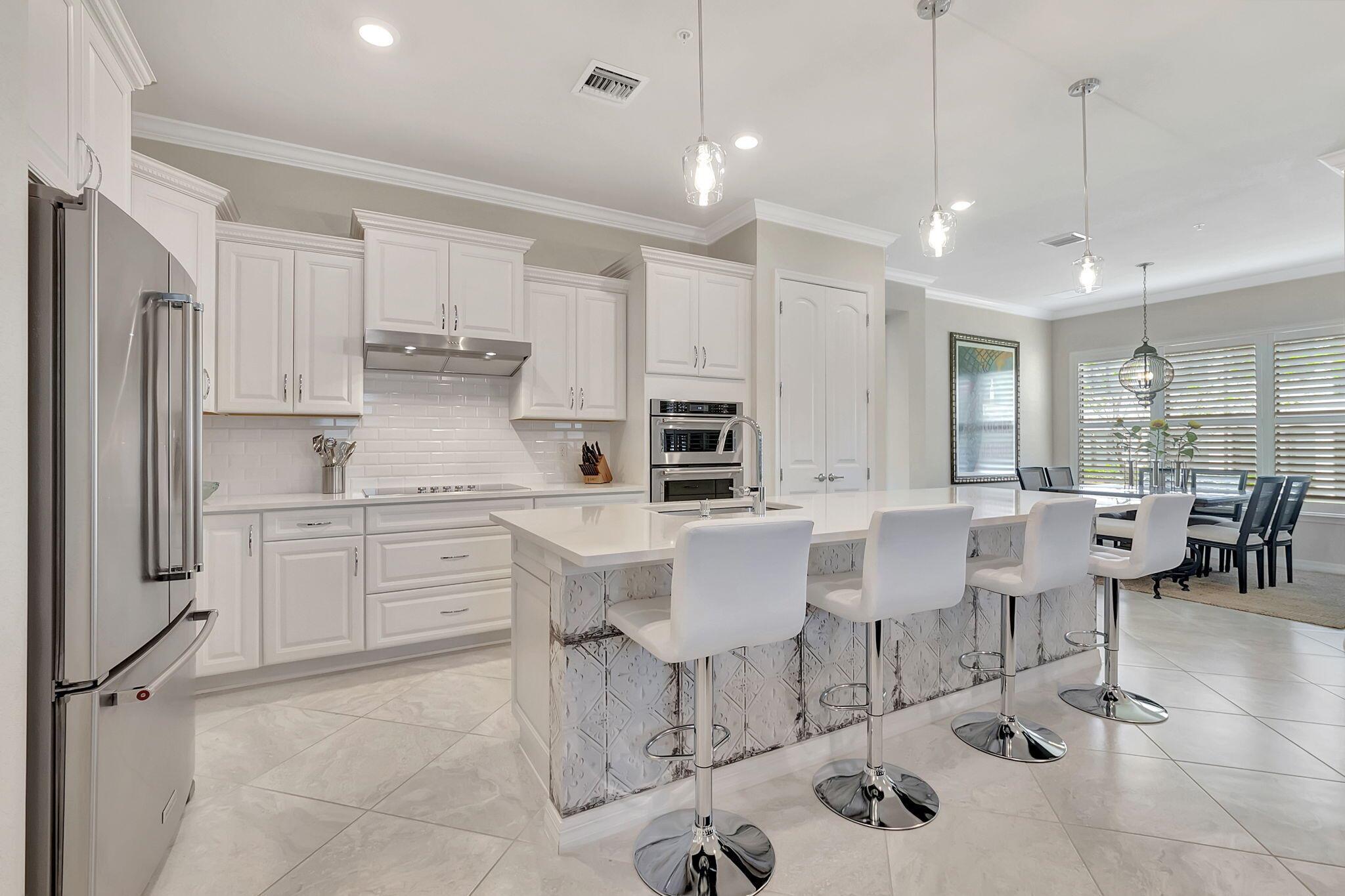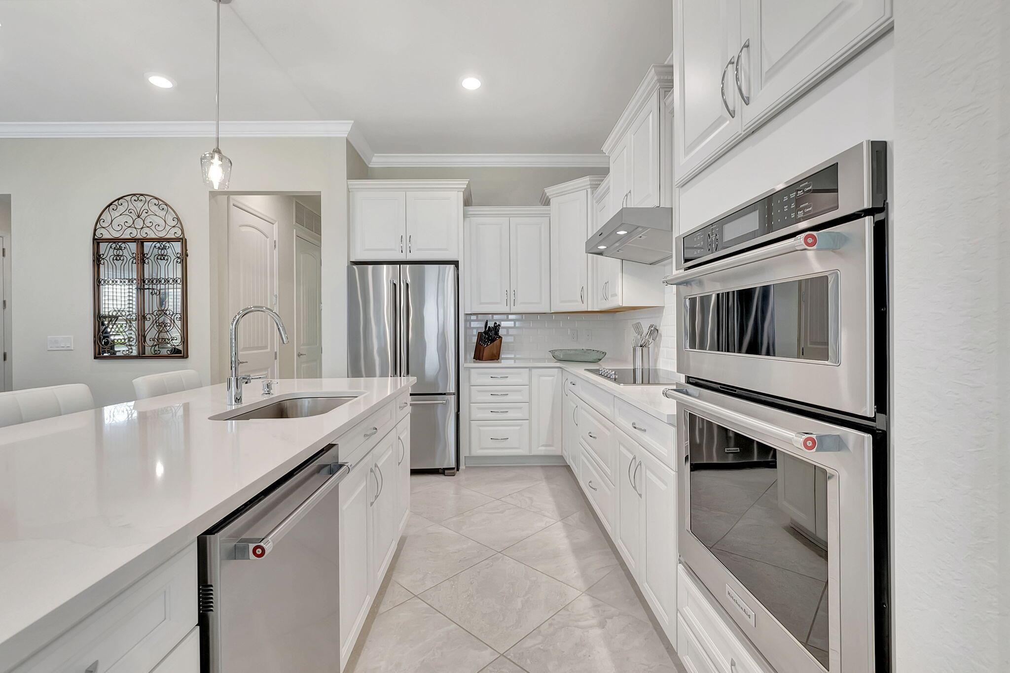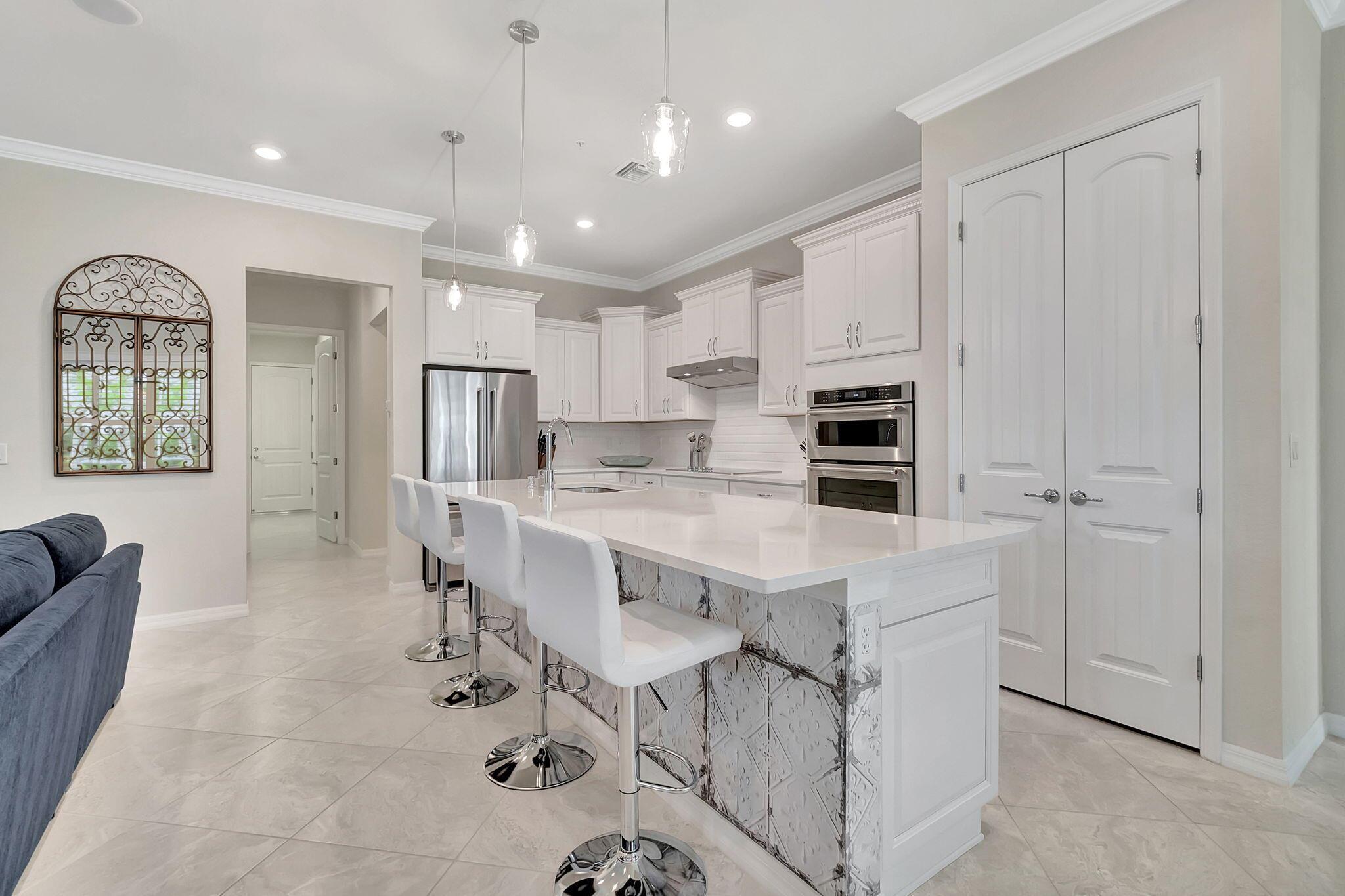 Everything is NEW! 1st Floor condo with 2 BR + Den + 2 car garage + screened in porch! This Pompano Model boasts an airy and inviting open floor plan, with a versatile flex room adorned with stylish barn doors for added privacy.The kitchen is a haven for culinary enthusiasts, featuring upgraded custom cabinets, high-end stainless steel appliances, a full backsplash, wall oven, oven hood, dual pantries, and an expansive island for both meal preparation and casual dining.Designer touches abound throughout the home, including crown molding, diagonal porcelain tile, luxury wood plank flooring in all bedrooms, designer ceiling fans & light fixtures, and plantation shutters.