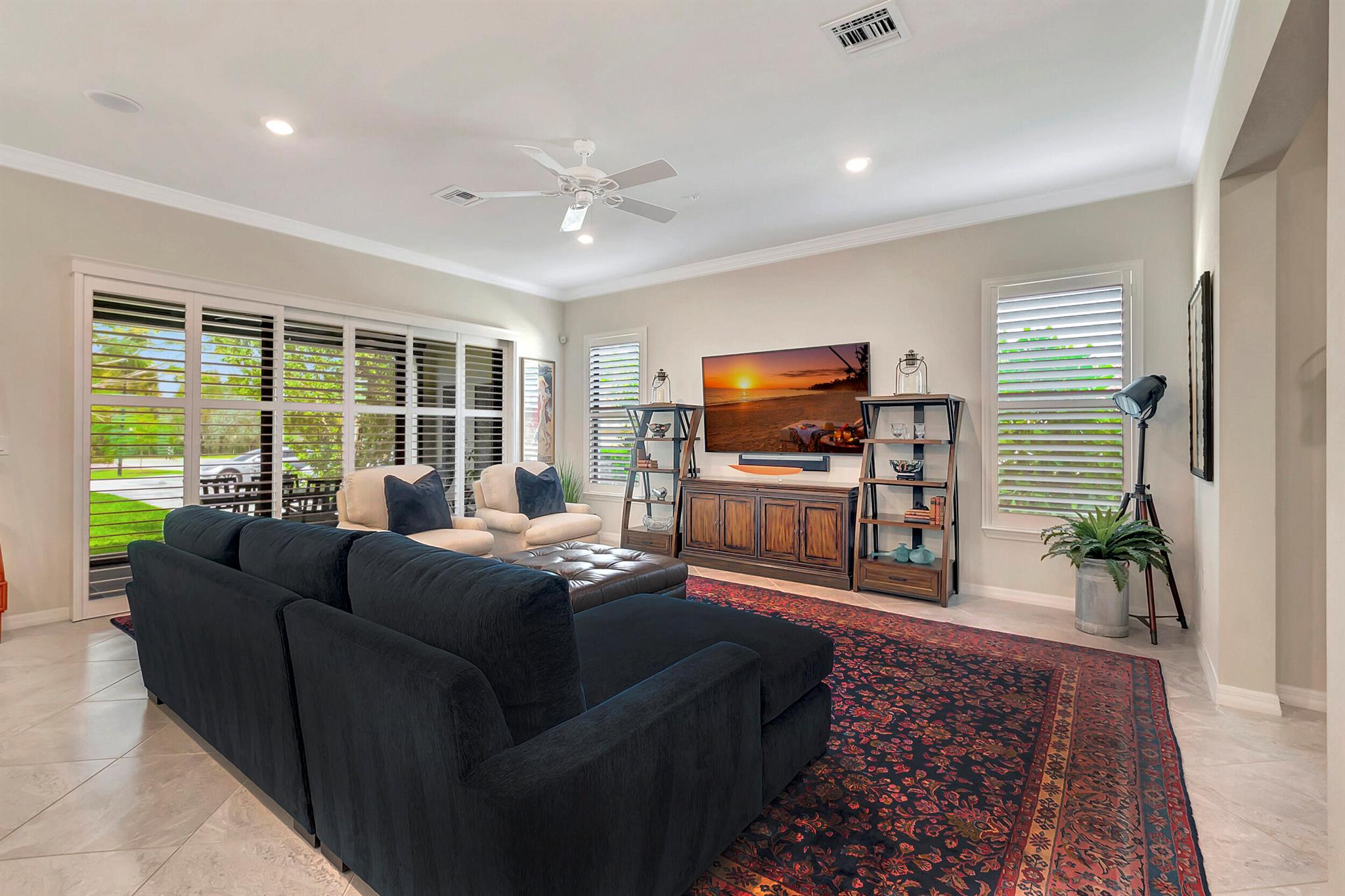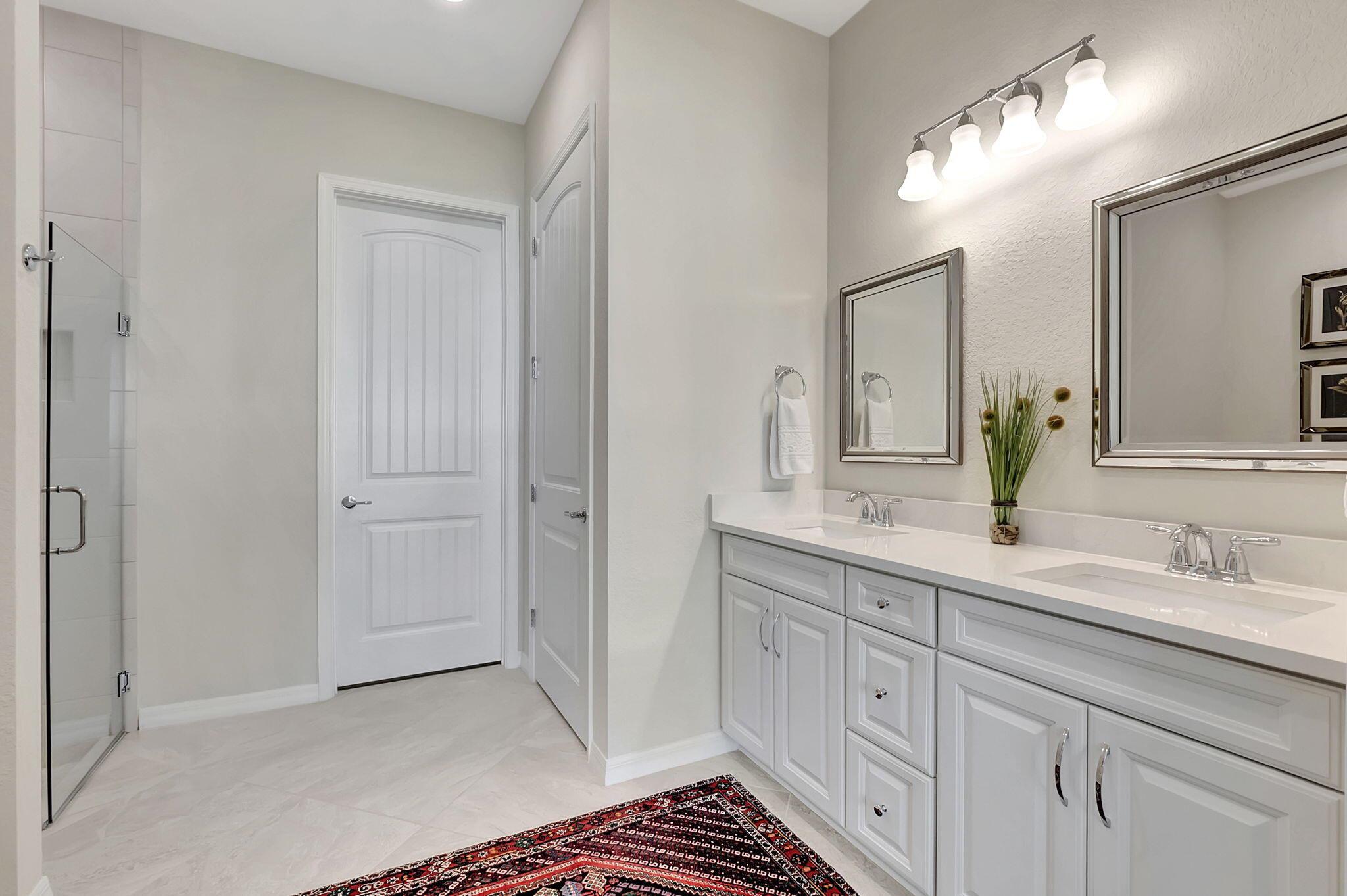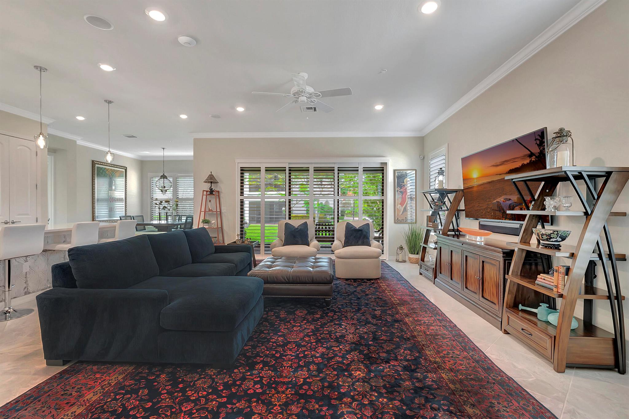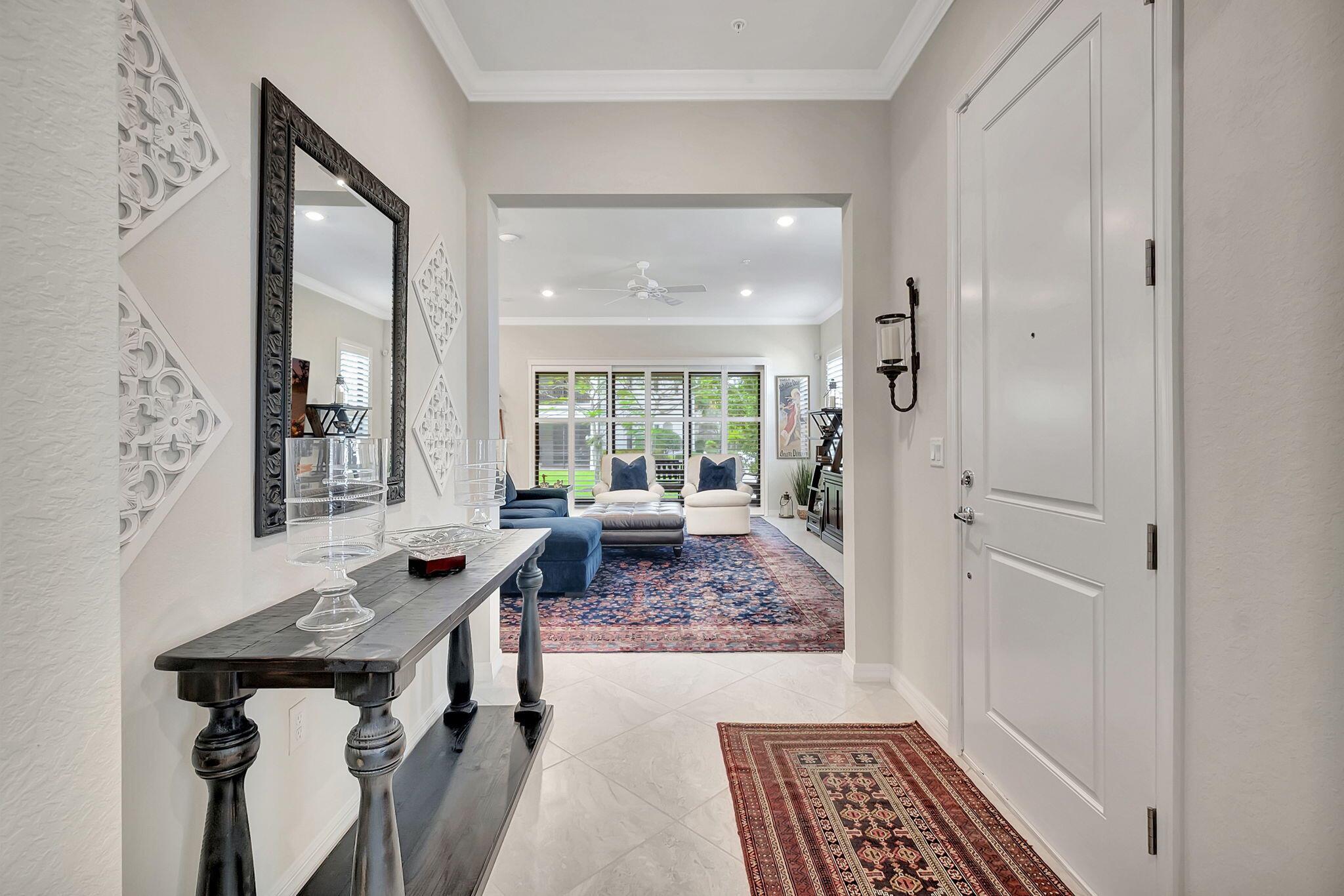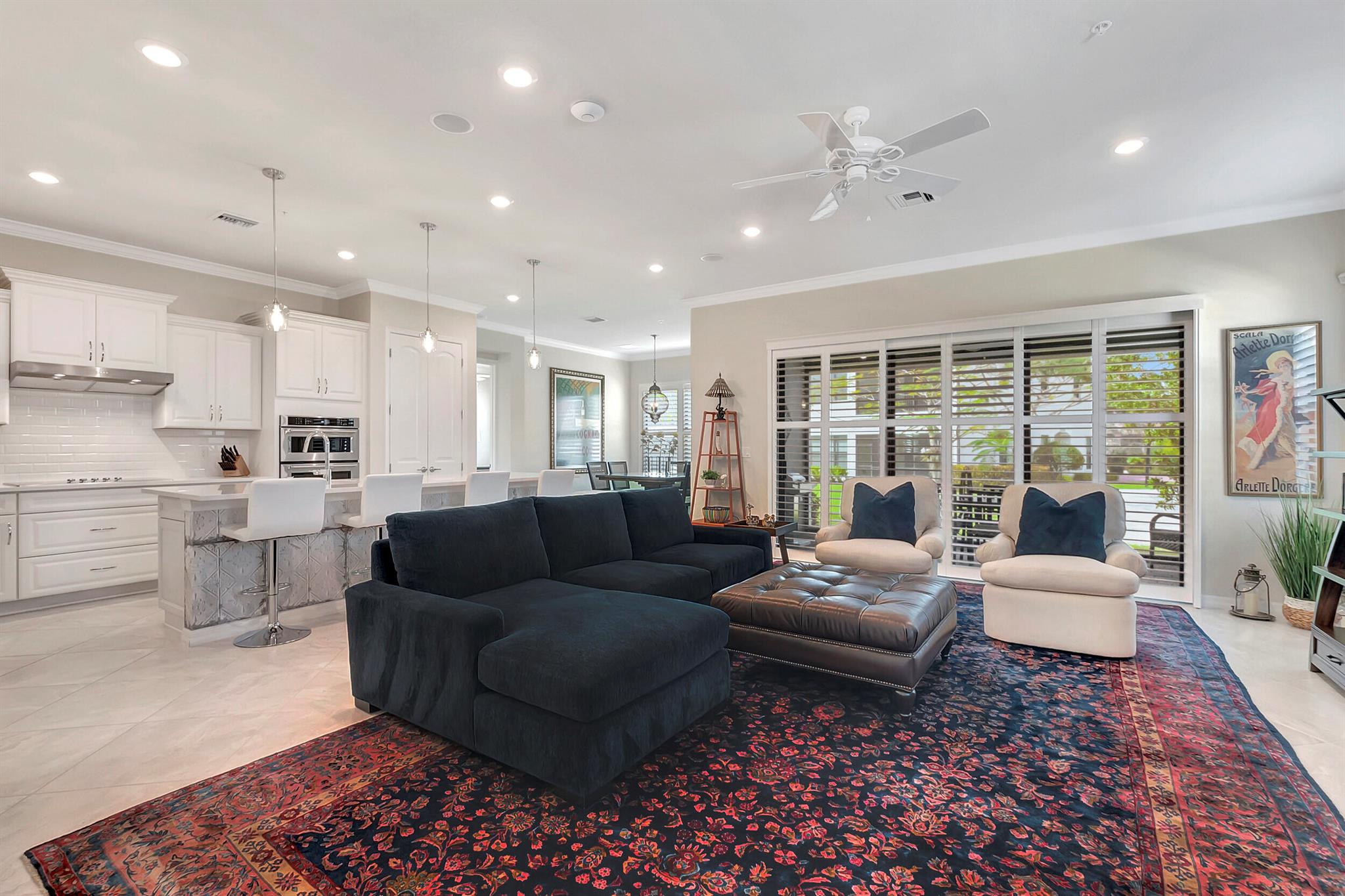 Everything is NEW! 1st Floor condo with 2 BR + Den + 2 car garage + screened in porch! This Pompano Model boasts an airy and inviting open floor plan, with a versatile flex room adorned with stylish barn doors for added privacy.The kitchen is a haven for culinary enthusiasts, featuring upgraded custom cabinets, high-end stainless steel appliances, a full backsplash, wall oven, oven hood, dual pantries, and an expansive island for both meal preparation and casual dining.Designer touches abound throughout the home, including crown molding, diagonal porcelain tile, luxury wood plank flooring in all bedrooms, designer ceiling fans & light fixtures, and plantation shutters.