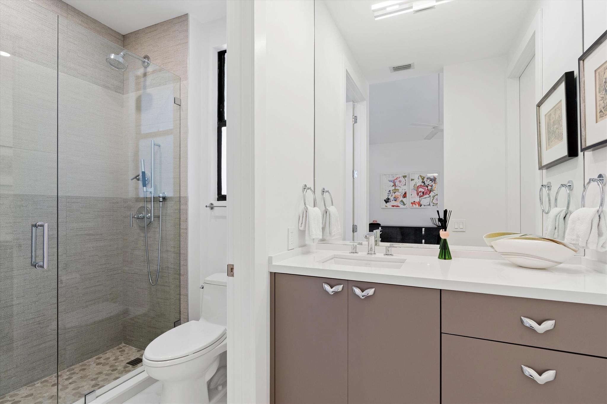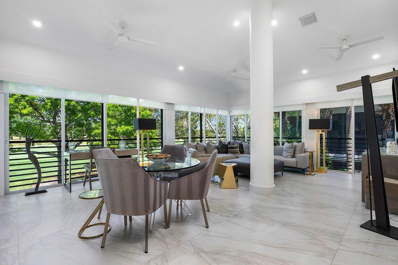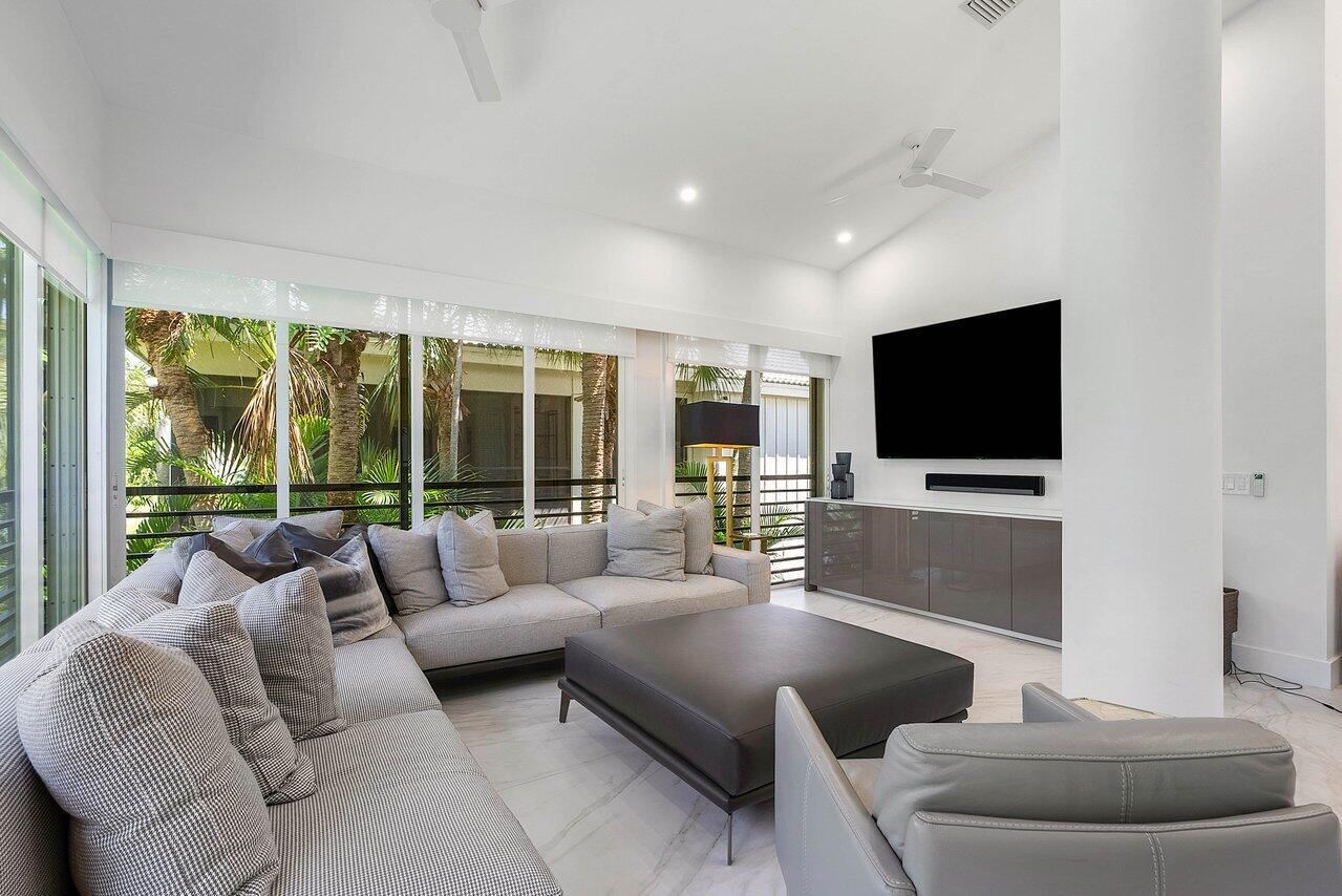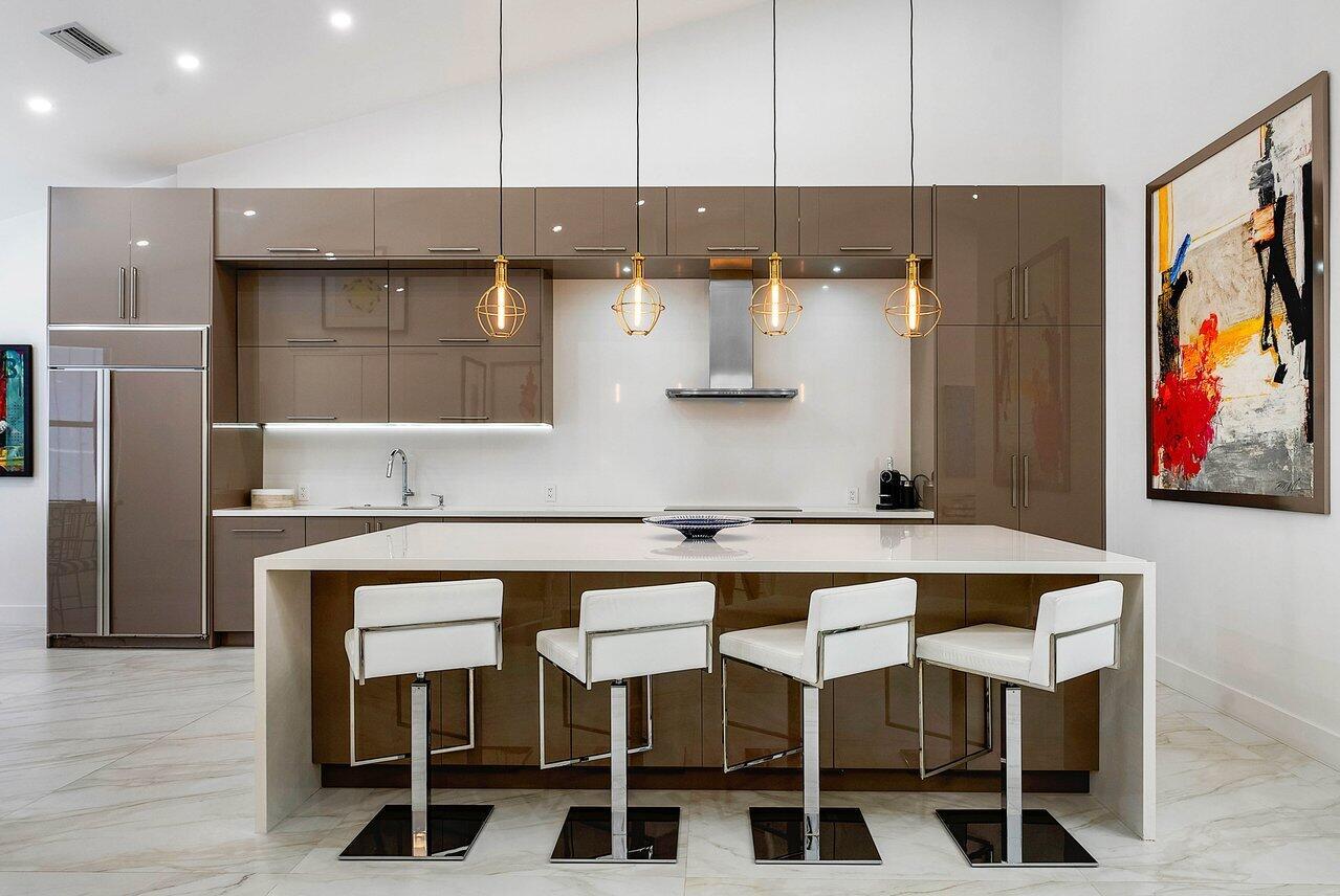 Experience unparalleled luxury in this meticulously renovated second-floor condo, complete with a private elevator and glass railing, showcasing a blend of sophistication and comfort. Boasting 4 spacious bedrooms and 3.5 elegantly appointed baths, this expansive residence spans 2,438 square feet of refined living space. Inside the home, a stunning and sleek kitchen awaits, boasting a large island with waterfall edge and top of the line appliances. This exceptional condo is further distinguished by 48-inch porcelain tile floors throughout. Some additional features include a one-car garage with ample room for a golf cart, state-of-the-art electric shades on the enclosed wrap-around patio, ensuring privacy and comfort. An array of new LED high hats complement the skylights, creating