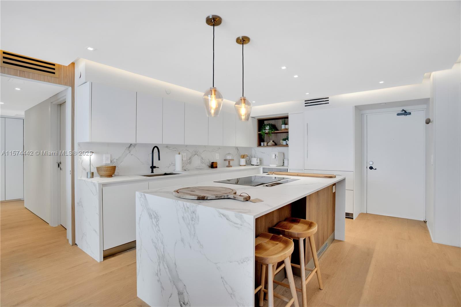 Apt is 2 beds + den, perfect as a 3rd bed. In the heart of Surfside, this residence offers the epitome of coastal chic w/stunning renovations right next door to the prestigious SurfClub! Adorned with italian porcelain wood like floors and exquisite wall coverings. Gourmet kitchen boasts top of the line Smeg appliances, dual wine coolers, marble counters, and Italian cabinetry. The primary suite is a sanctuary of relaxation featuring his/her walk-in closets. The den transitions between a guest room & office. Resort-style living w/ exclusive access to the pool overlooking the beach. Completely furnished with restoration hardware designs in Surfside's most coveted location. Experience luxury beachfront living like never before!