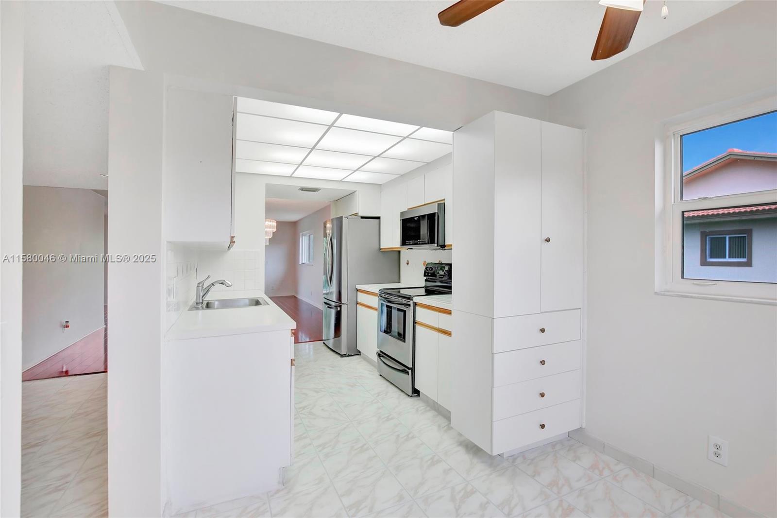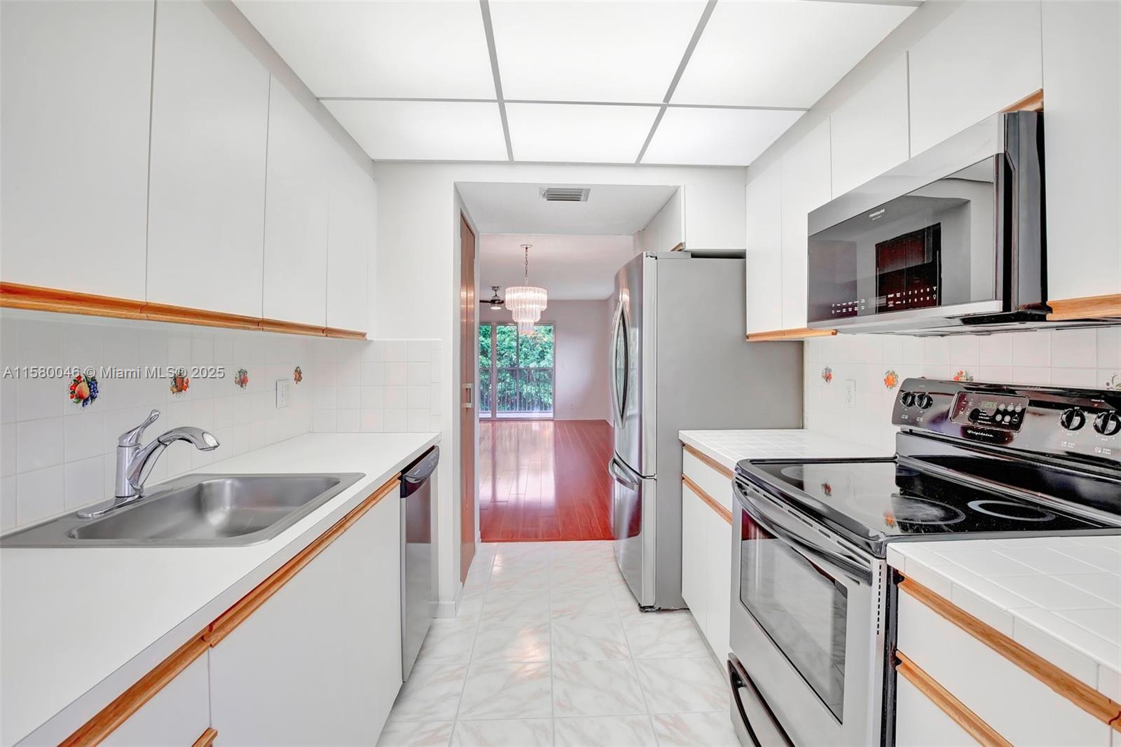 Top-floor corner unit with a breathtaking golf view and 1,507 SQ.FT. a well-maintained interior, complete with attic access through the master bedroom closet and a convenient shower bathroom. The kitchen features pull-out drawers for easy access, stainless steel appliances including a French door refrigerator and wood flooring with a high-quality finish. With hurricane impact windows and accordion shutters on the patio, peace and security are ensured, allowing for uninterrupted enjoyment of the breathtaking golf course views. Additionally, the potential to customize the space to your liking, adding even more value to this already desirable property. Enjoy Resort-style living with a clubhouse, movies, fitness center, transportation, free golf, pharmacy, cafe, 24-hour security patrol.