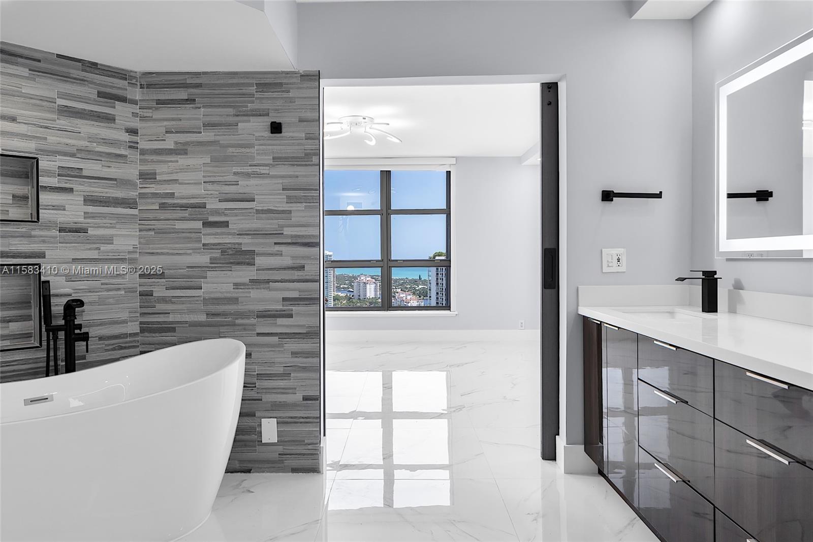 ONE OF A KIND. Completely remodeled 2 beds plus den and 2 full bathrooms.Enjoy the most beautiful and spectacular panoramic views of the ocean,Turnberry Golf course,skyline from this spacious apartment in the prestigious Mystic Pointe.Apartment features an exquisite open kitchen with new stainless steel appliances and wine-cooler. Unit features exquisite bathrooms, separate new washer and dryer in the unit. Entire home has tile throughout. Split floor with extensive wrap-around balcony with breathtaking views and shutter.Full building amenities including: Fitness center, heated pool,library,7 clay tennis courts,2 pickle ball courts,1 basketball court and dog park,mini market, beauty salon and restaurant. Mystic Pointe is a desirable and all-inclusive 24 hours gated community.