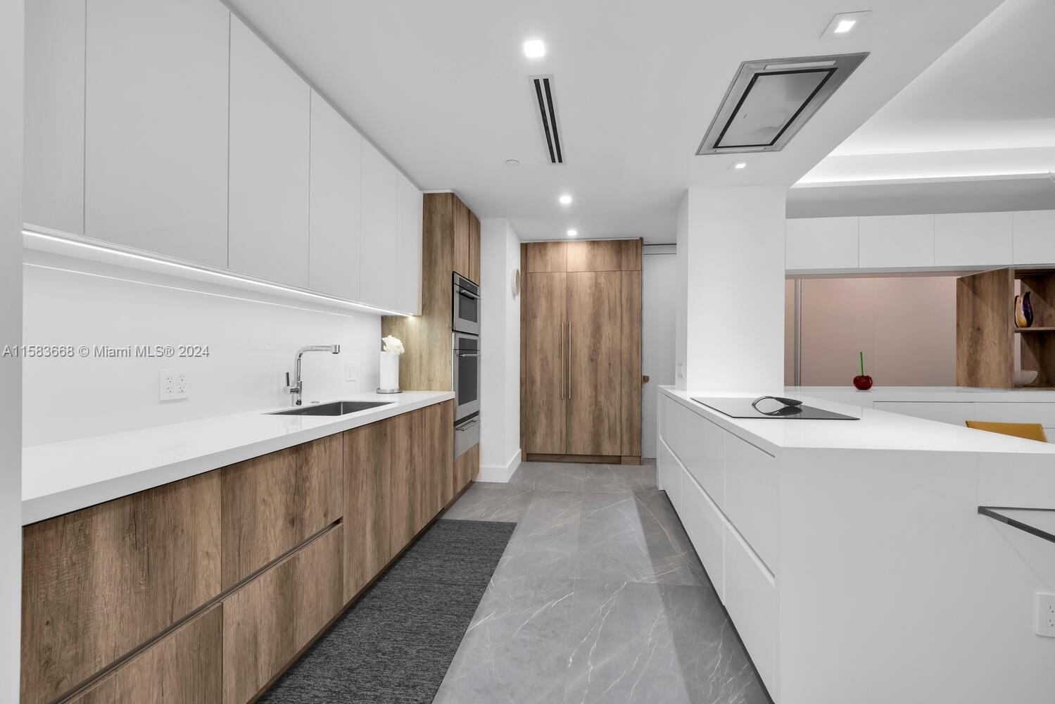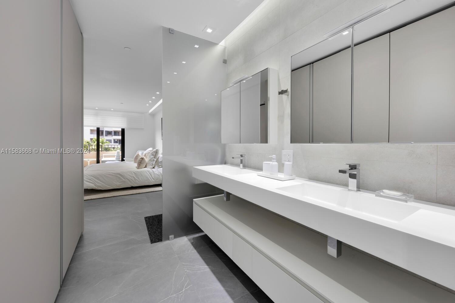 Unparalleled, impressive & completely renovated 2/2.5 unit. 1560 SF. Ingenious use of space like no other unit. Split bedroom plan. Large laundry/pantry/office. HIGH IMPACT WINDOWS & DOORS. Unique and sleek interior design features raised ceilings, custom sliding door system throughout w/internal auto lighting, MiaCucina designed kitchen w/Wolf, SubZero and Asko appliances. 48 bottle Wolf wine cooler. Linear A/C diffusers. Porcelain flooring provides a seamless transition to the extended balcony. Be the first to preview this spectacular unit! 2 covered parking spaces.