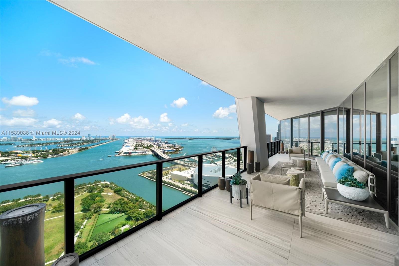 The most spectacular residence available at One Thousand Museum by Zaha Hadid. Curated & Designed by Morada with highly customized details throughout. This half-floor residence features a flow-through floor plan with unobstructed Biscayne Bay and Atlantic Ocean views. Both east and west terraces span the entire width of the residence, which is a rarity. 4 bedrooms, 5.5 baths, including a private foyer, beautiful great room with custom ceilings & lighting, proper bar, service quarters, and an impressive Poliform Kitchen with Gaggenau & Sub-Zero appliances. First-Class amenities & service levels- fitness center & spa, theater, interior & exterior pools, and a 60th-floor sky lounge with the only private residential helipad. Unit includes Storage #44 on 7th Floor of Garage.