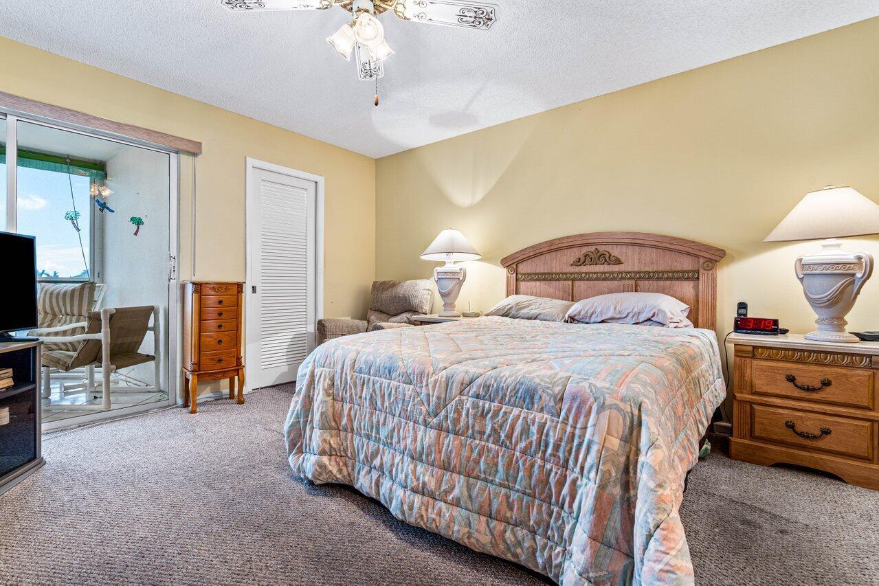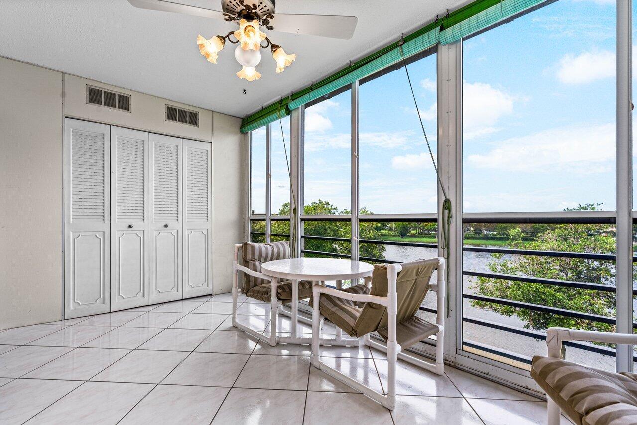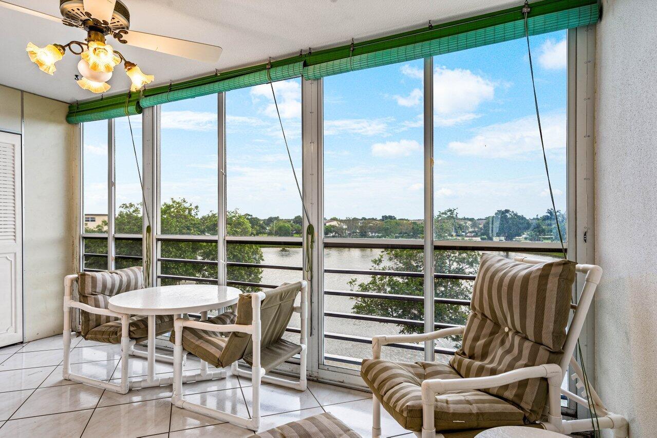 Desirable and spacious fourth floor unit with two bedrooms, two full baths and 1008 living square feet. This unit features tile throughout living area and carpet in the bedrooms, sliders to the patio from both the primary bedroom and second bedroom, large walk-in closets with California closet organizers, an updated walk-in shower in the guest bathroom, ceiling fans in every room (including the patio), and a screened in patio with added electric, a storage closet and beautiful long lake views. Wolverton is walking distance to the clubhouse and places of worship. Century Village is an active 55+ community with state of the art amenities.