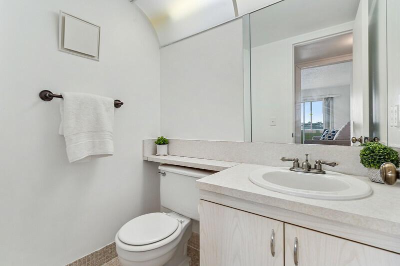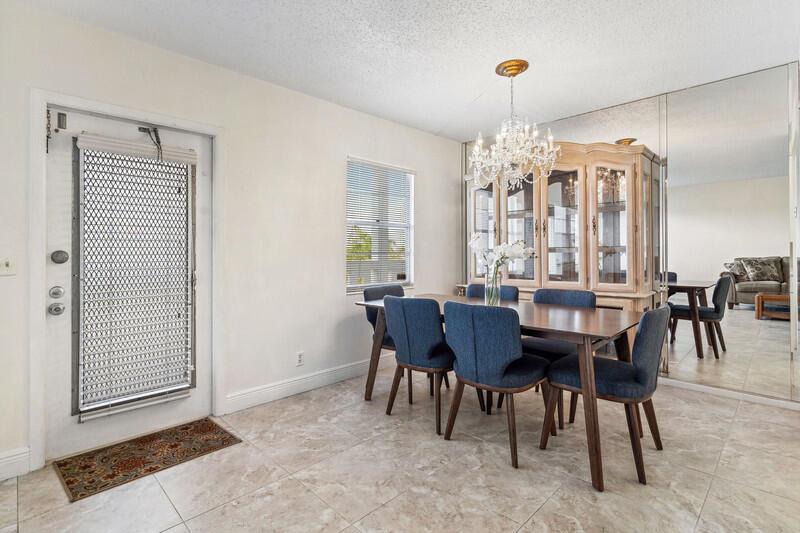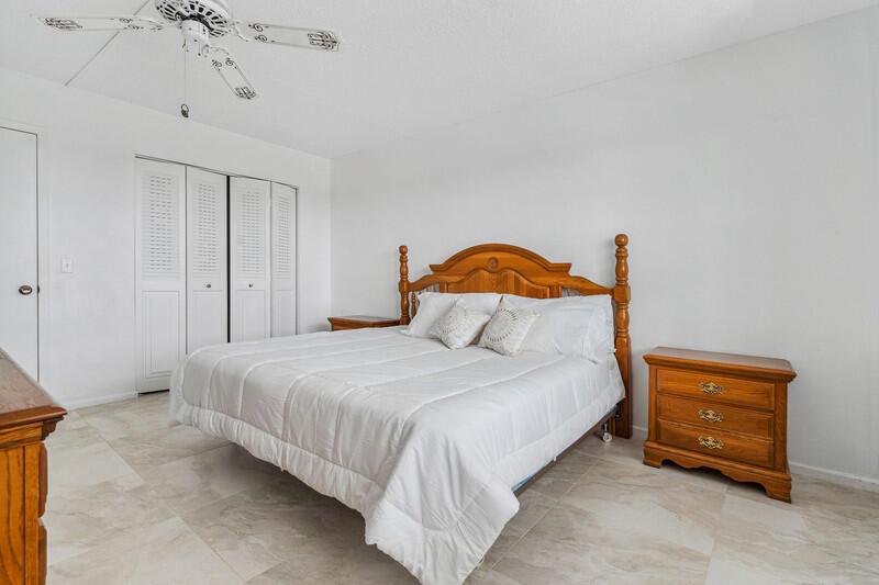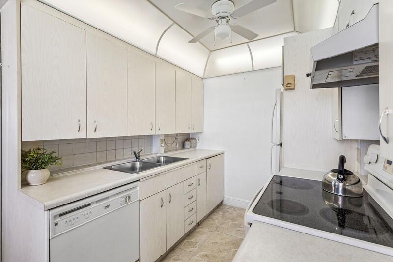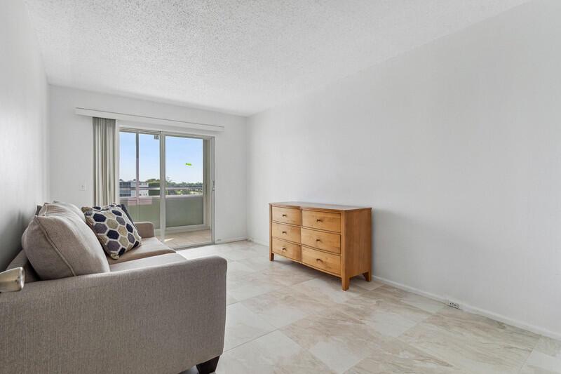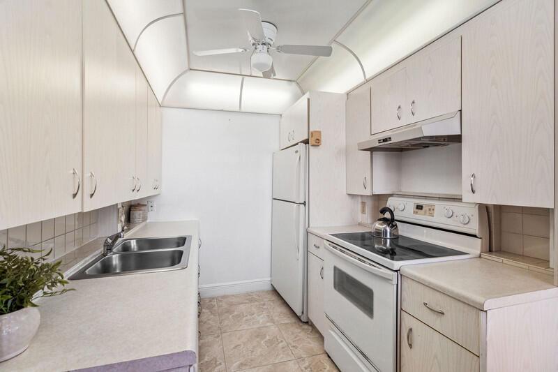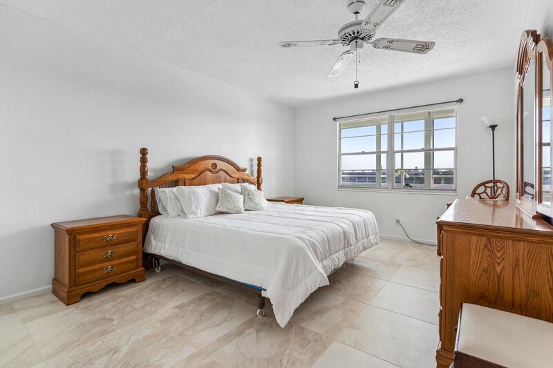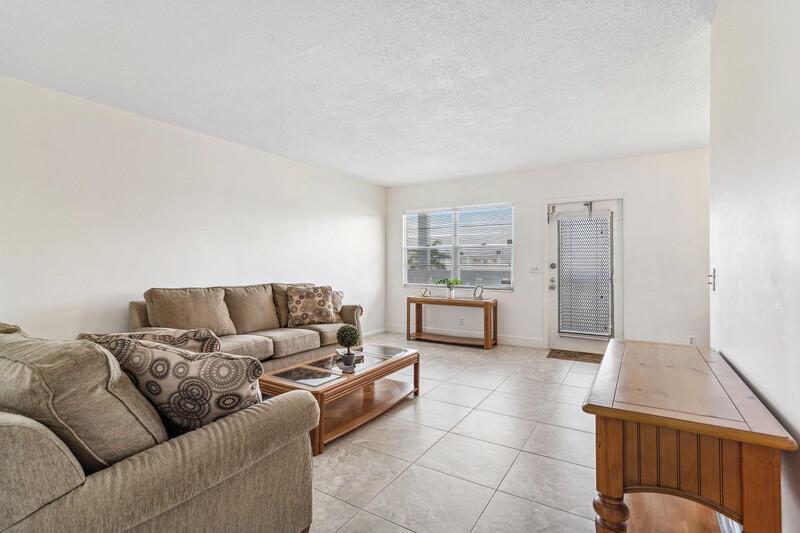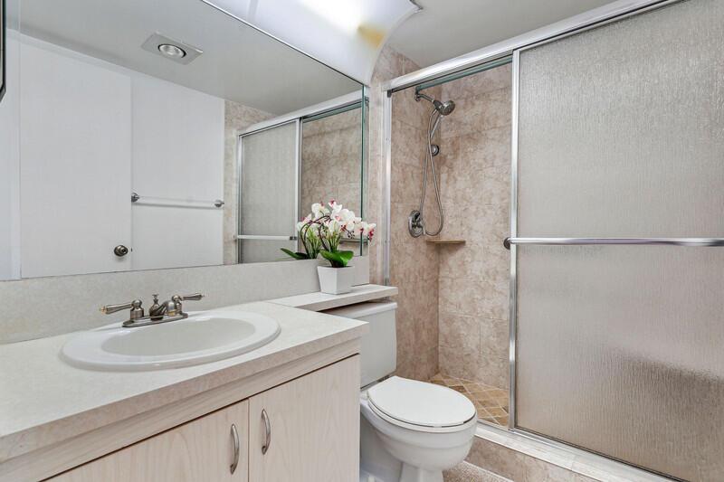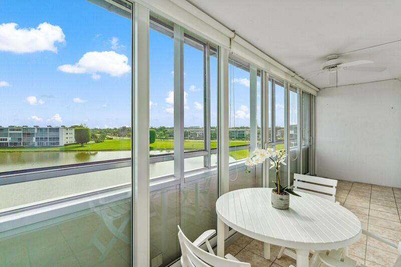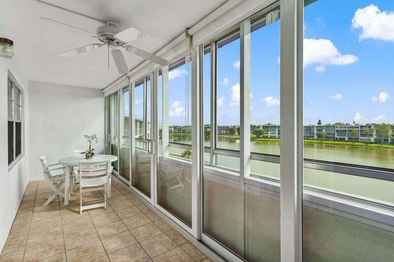 Light, bright, and spacious 2 bedroom, 1.5 bath unit on the fourth floor in highly desirable Exeter at Century Village. This meticulously maintained unit has beautiful tile floors throughout, a redone stall shower in the main bathroom, a 2020 A/C, and a glass enclosed patio with hurricane impact sliders. Can be sold furnished or unfurnished. Just steps from the laundry room and elevator. Parking space right in front of the unit. Property can be rented out immediately after closing.