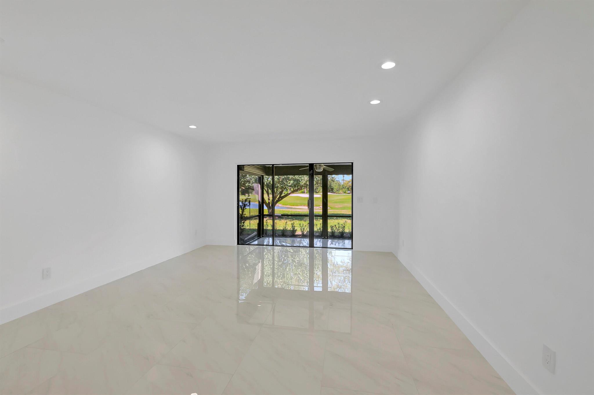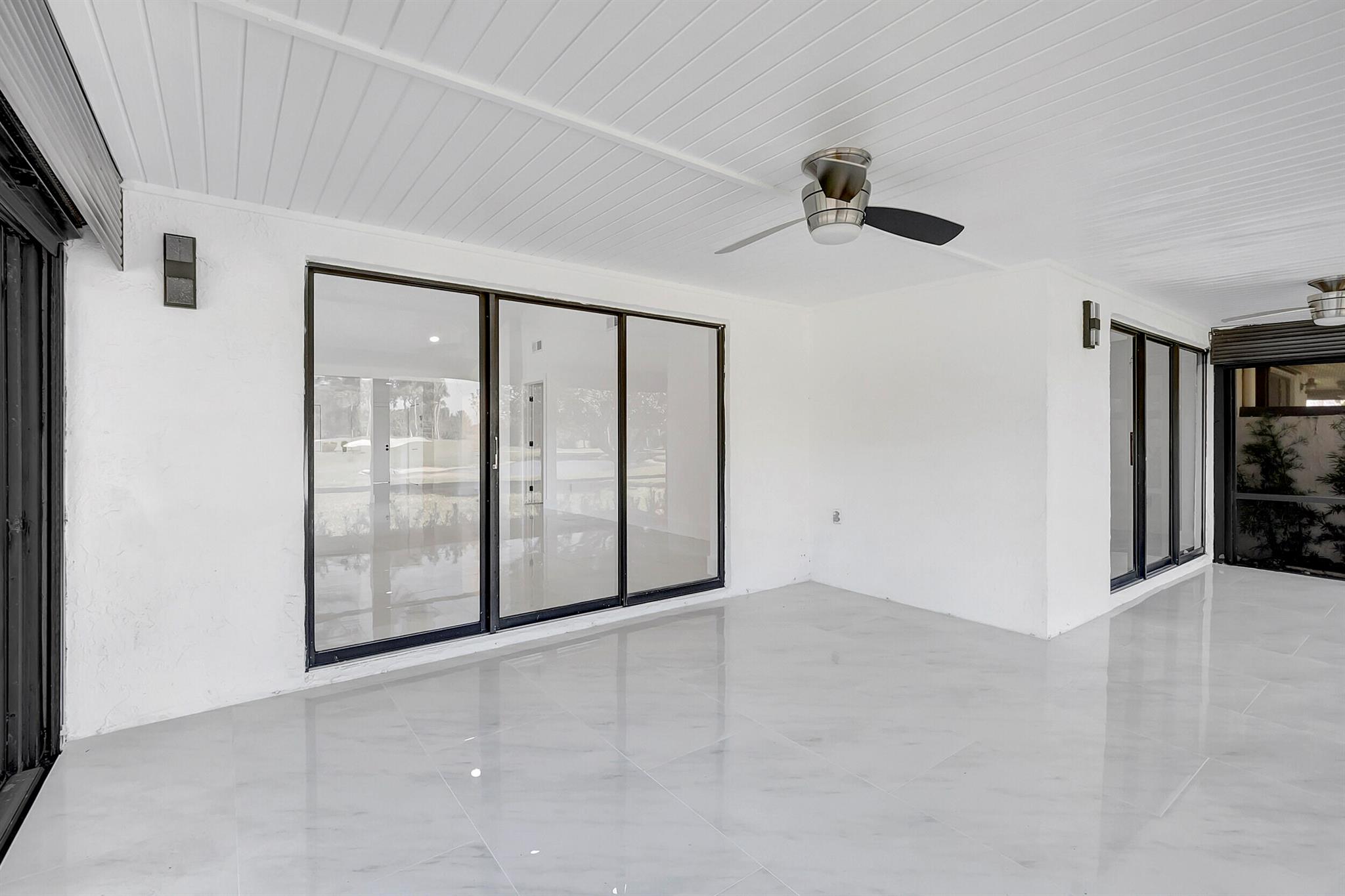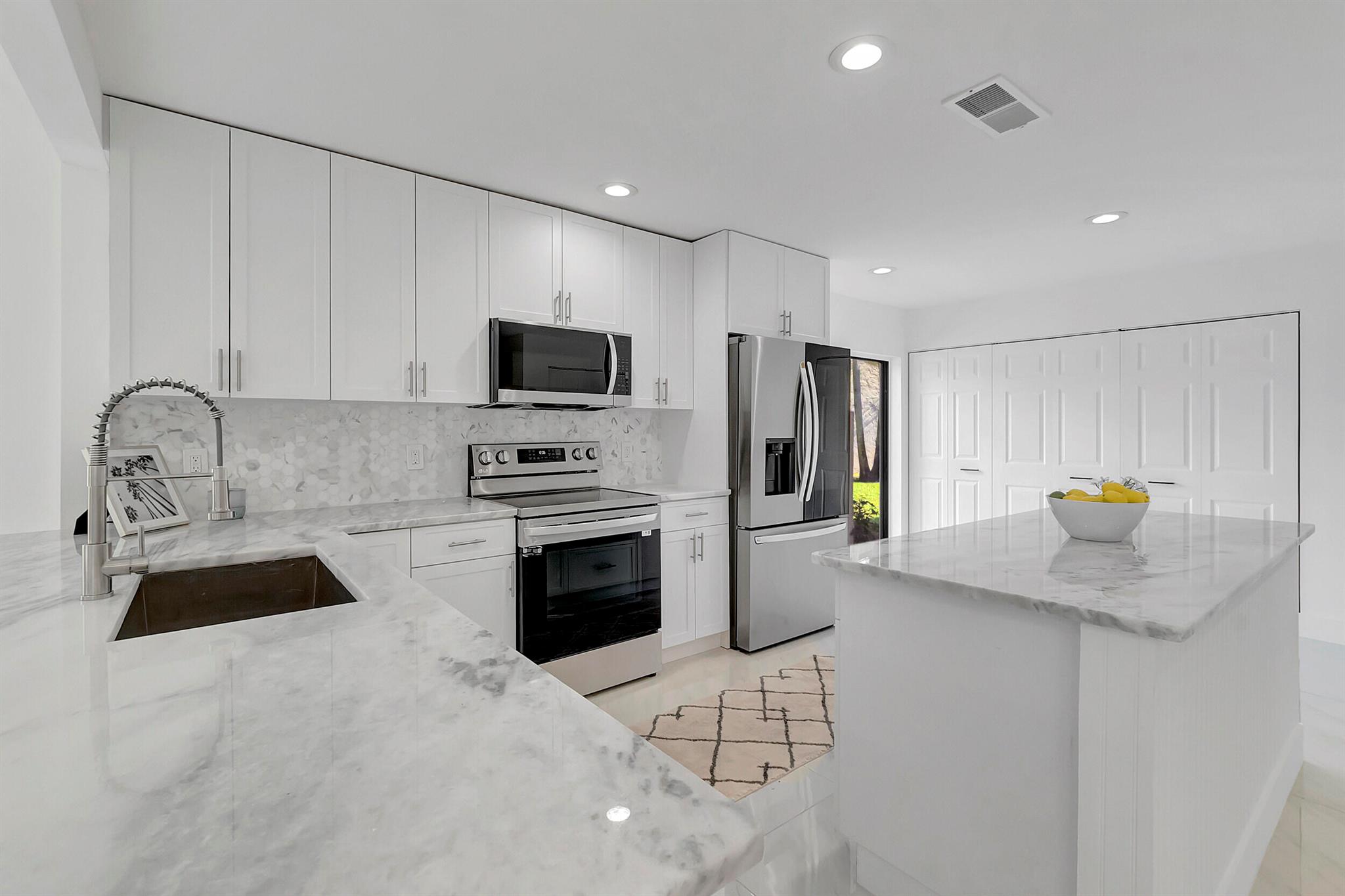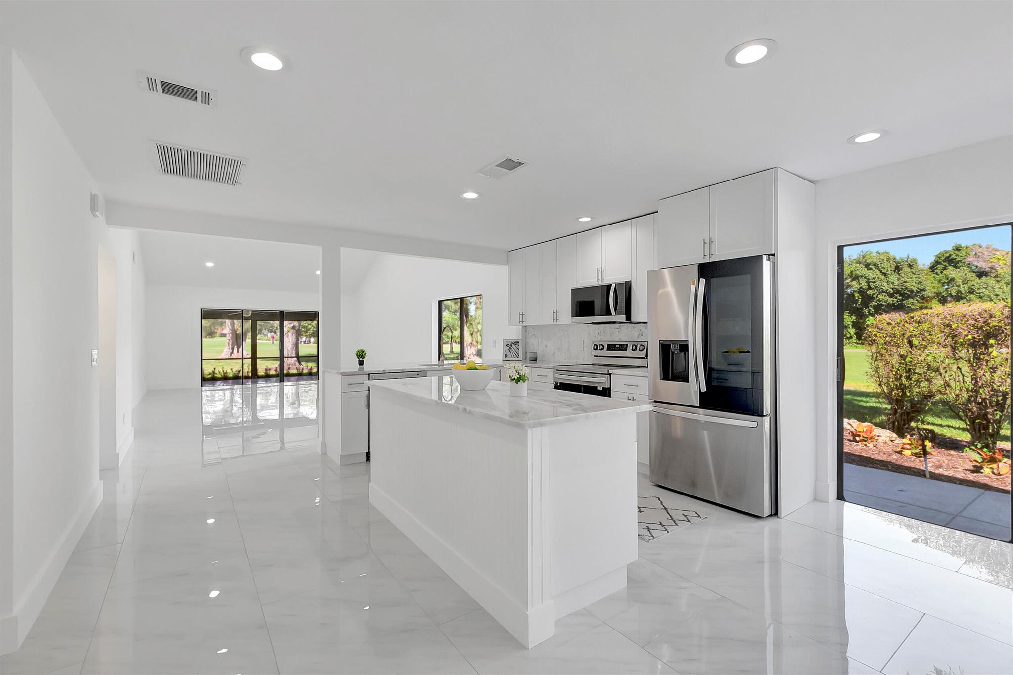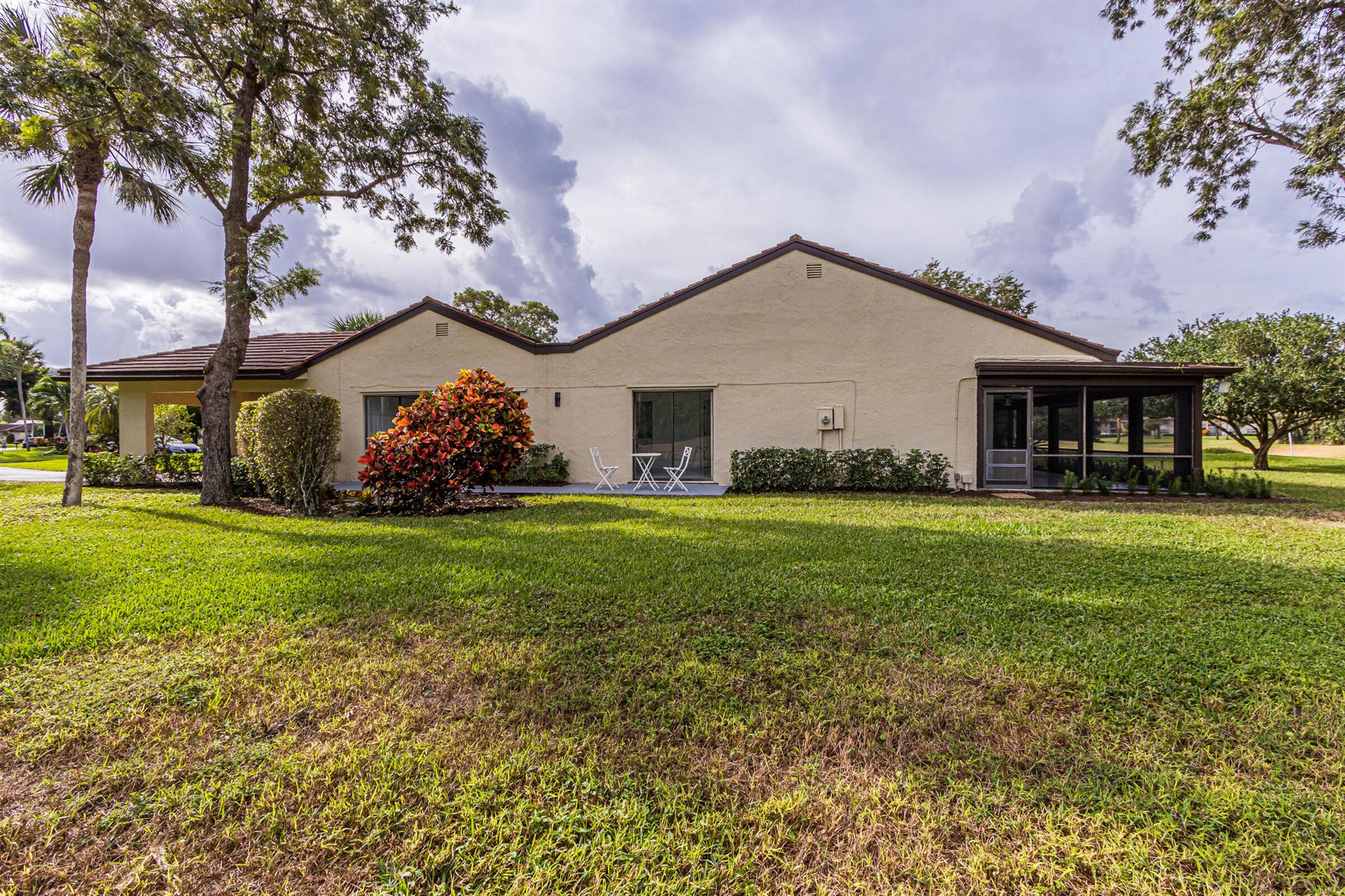 Welcome to the Fairways of Boca Lago. A 55+ active community. Spacious 2 bedroom, 2 bath villa. This unit has undergone a total renovation by an upscale contractor. 24x48 tiles throughout. Brand new custom kitchen with quartz counters and new LG stainless steel appliances. open flr plan, vaulted ceilings, all new recessed lighting. New doors. New water heater.New washer/Dryer. Designer bathrooms with high end fixture. Tons of closet space. Sliders to side patios. New screen enclosed back lanai with ceiling fans and a gorgeous view of a lake and golf course. Private peaceful with no rear neighbors. Large bedrooms with access to front and rear patios. Covered carport with long driveway for extra cars. Brand New roof installed May 2024. paid in full by contractor. No assessment due