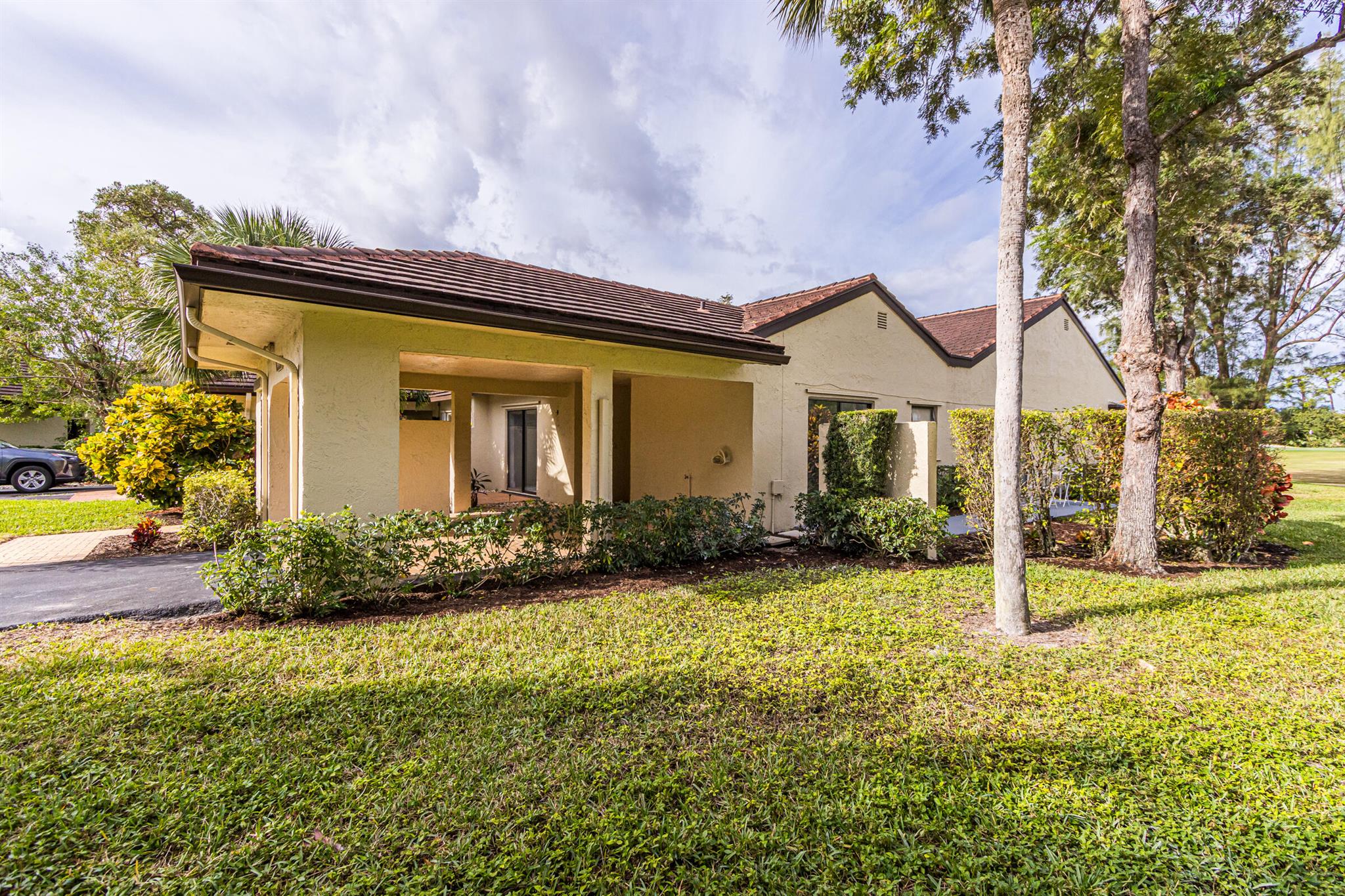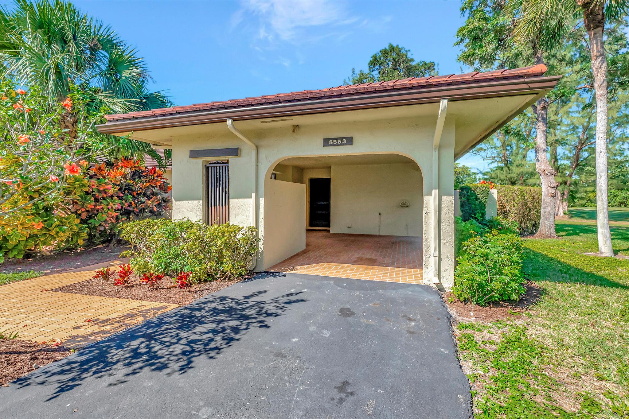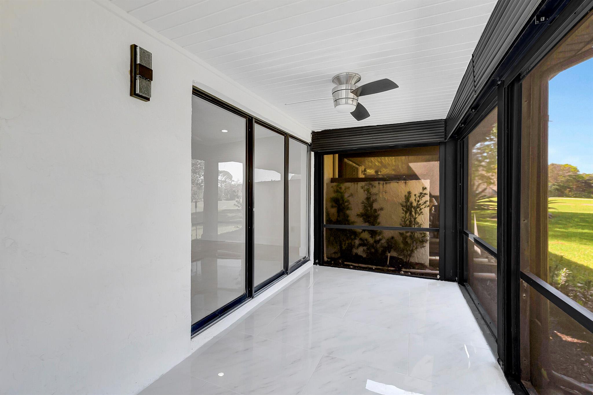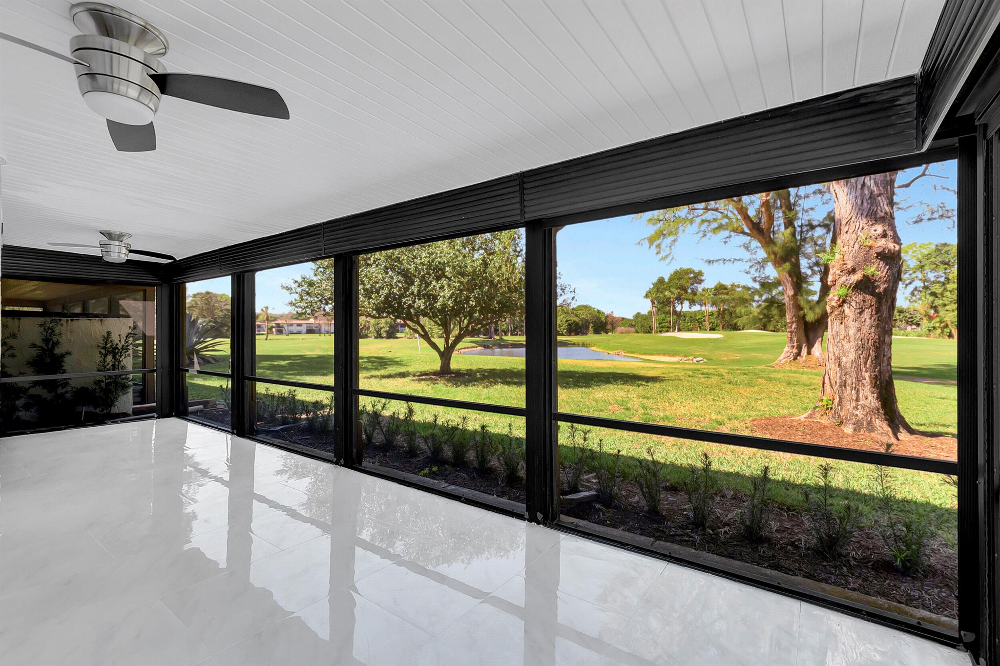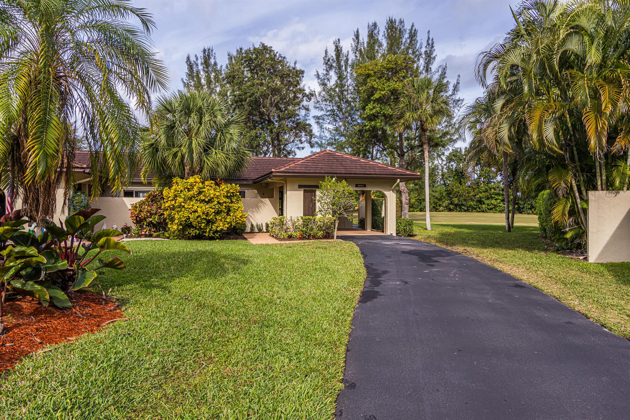 Welcome to the Fairways of Boca Lago. A 55+ active community. Spacious 2 bedroom, 2 bath villa. This unit has undergone a total renovation by an upscale contractor. 24x48 tiles throughout. Brand new custom kitchen with quartz counters and new LG stainless steel appliances. open flr plan, vaulted ceilings, all new recessed lighting. New doors. New water heater.New washer/Dryer. Designer bathrooms with high end fixture. Tons of closet space. Sliders to side patios. New screen enclosed back lanai with ceiling fans and a gorgeous view of a lake and golf course. Private peaceful with no rear neighbors. Large bedrooms with access to front and rear patios. Covered carport with long driveway for extra cars. Brand New roof installed May 2024. paid in full by contractor. No assessment due
