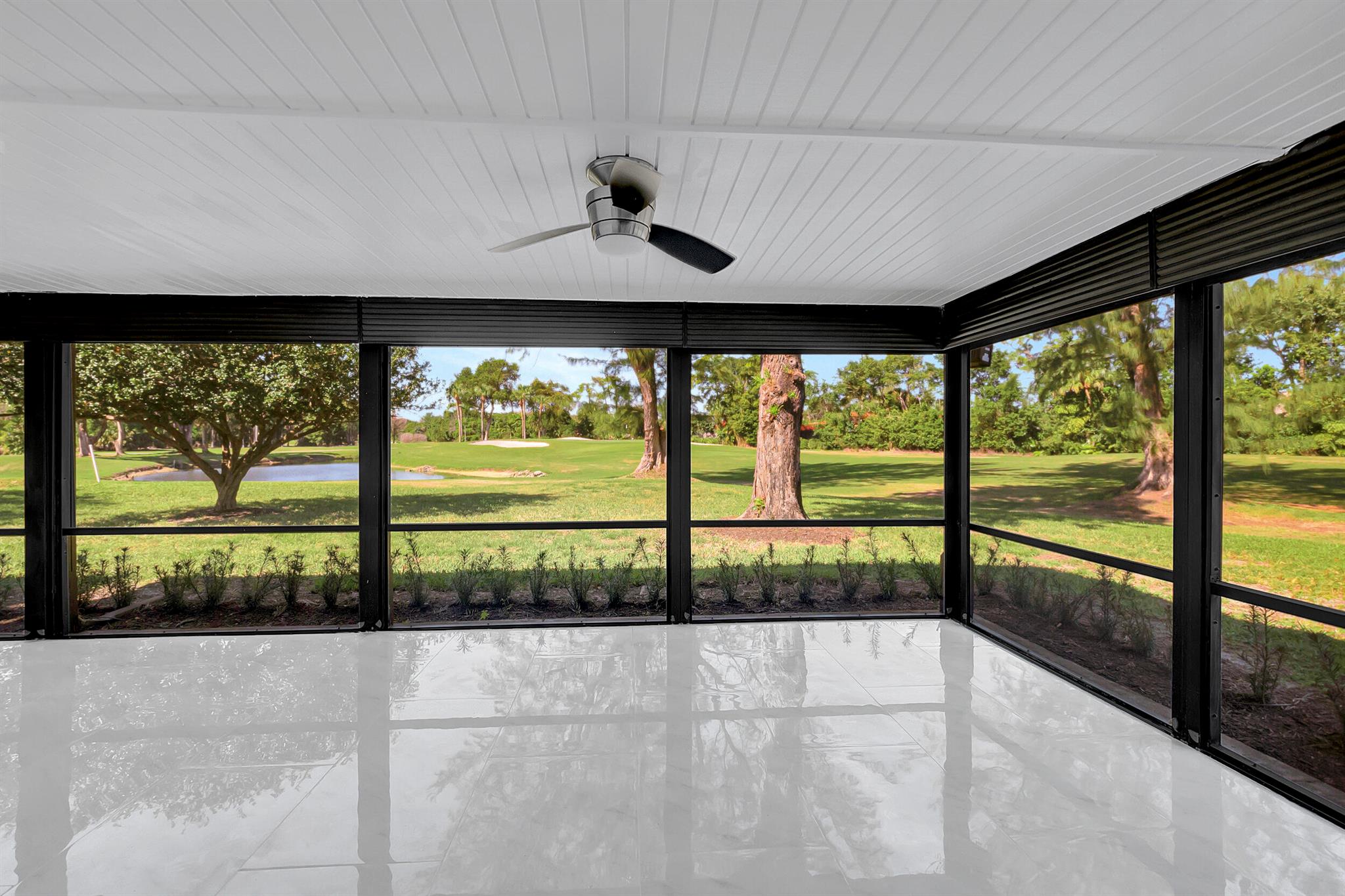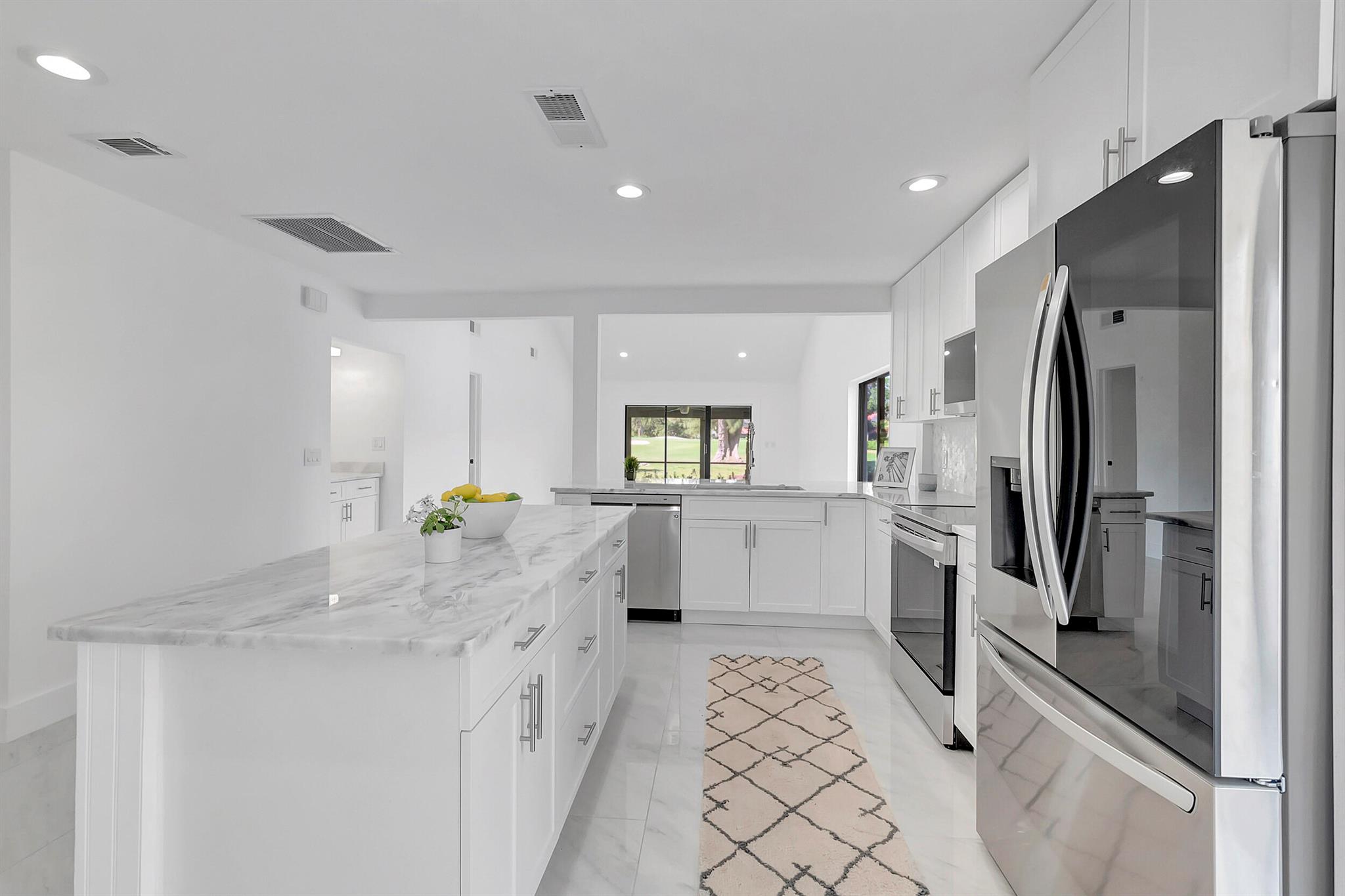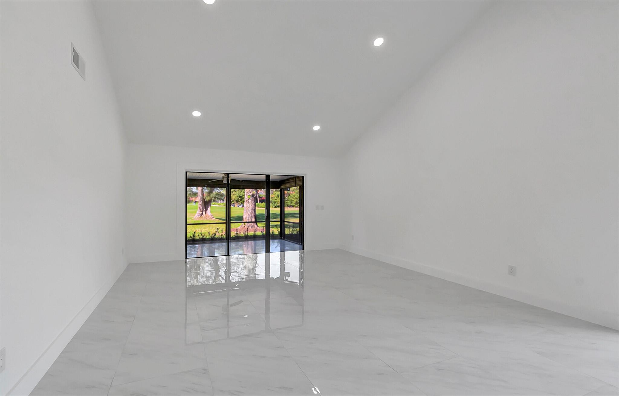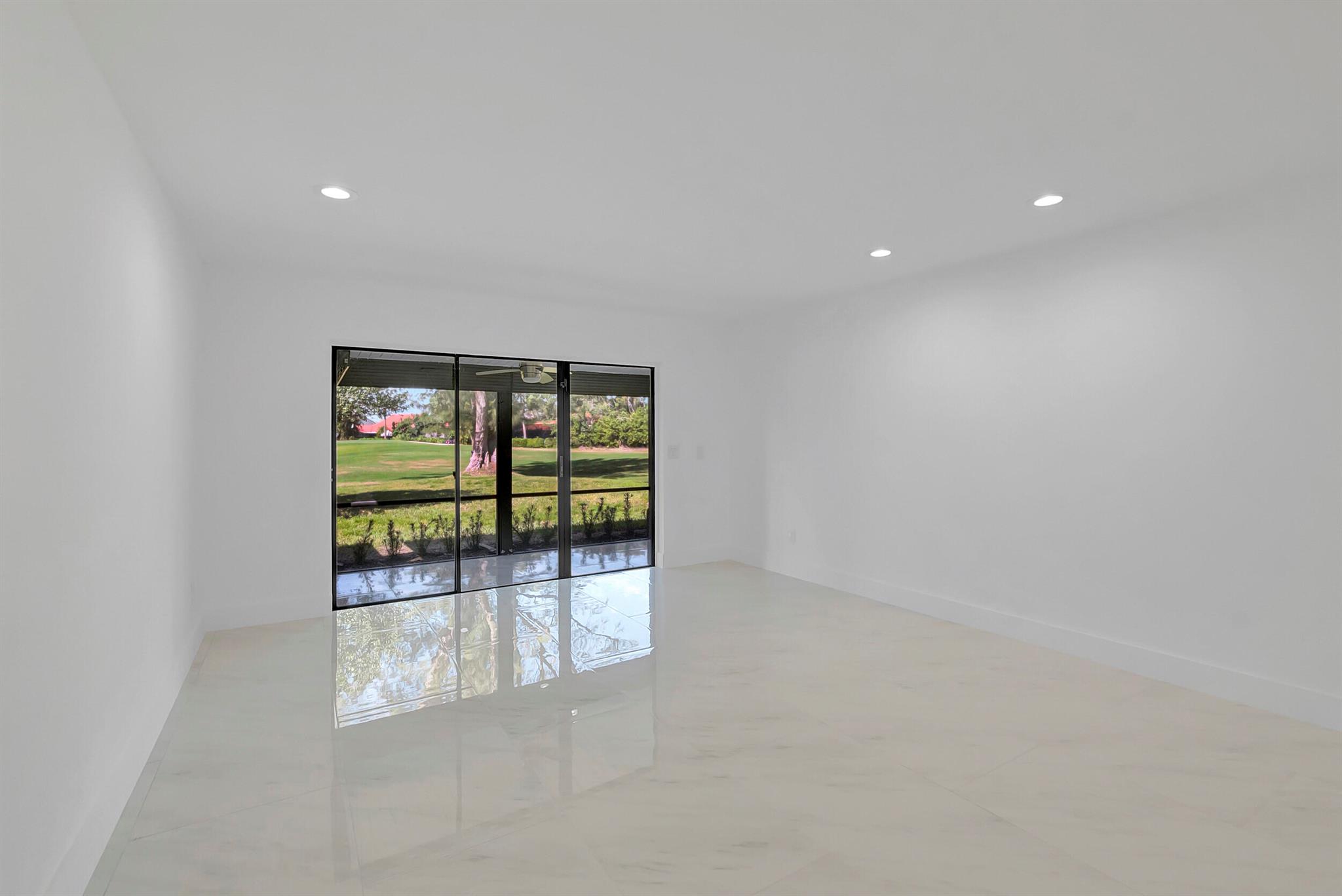 Welcome to the Fairways of Boca Lago. A 55+ active community. Spacious 2 bedroom, 2 bath villa. This unit has undergone a total renovation by an upscale contractor. 24x48 tiles throughout. Brand new custom kitchen with quartz counters and new LG stainless steel appliances. open flr plan, vaulted ceilings, all new recessed lighting. New doors. New water heater.New washer/Dryer. Designer bathrooms with high end fixture. Tons of closet space. Sliders to side patios. New screen enclosed back lanai with ceiling fans and a gorgeous view of a lake and golf course. Private peaceful with no rear neighbors. Large bedrooms with access to front and rear patios. Covered carport with long driveway for extra cars. Brand New roof installed May 2024. paid in full by contractor. No assessment due