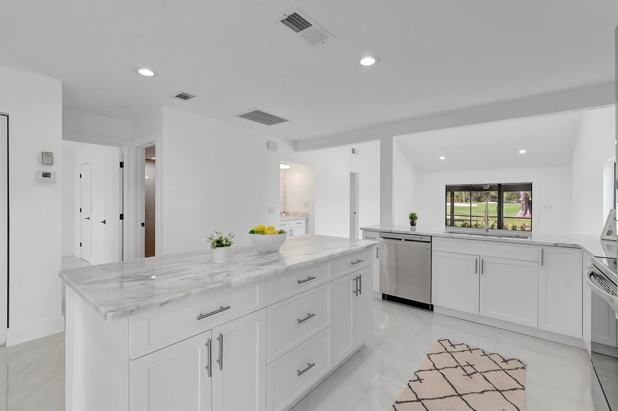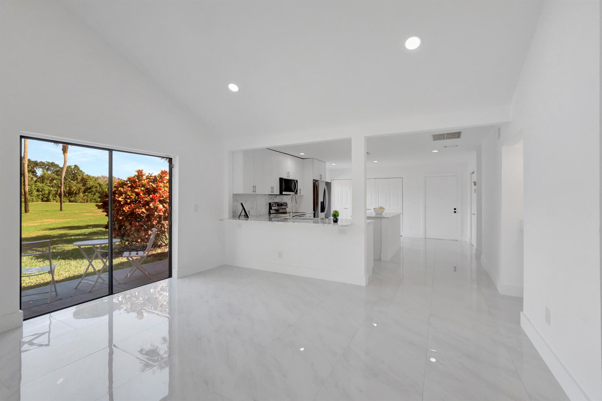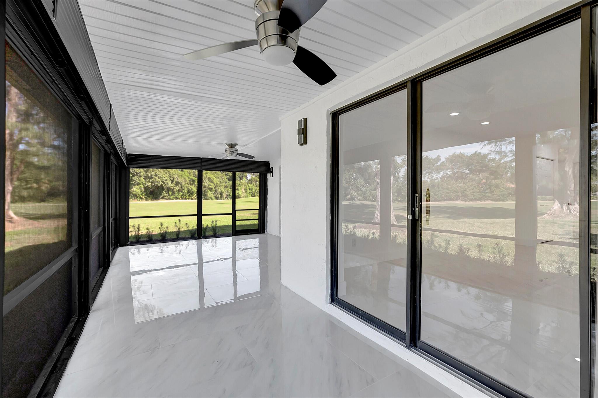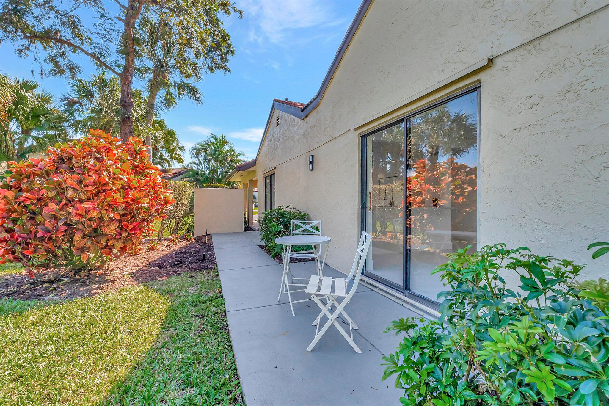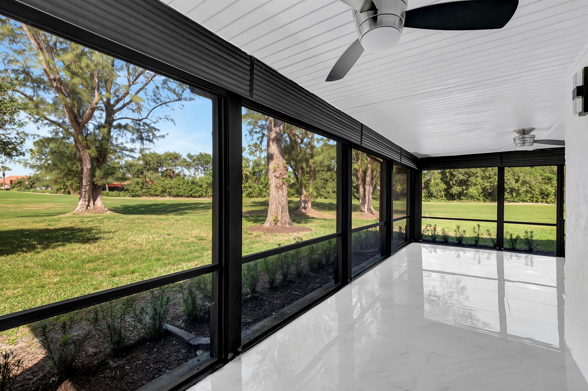 Welcome to the Fairways of Boca Lago. A 55+ active community. Spacious 2 bedroom, 2 bath villa. This unit has undergone a total renovation by an upscale contractor. 24x48 tiles throughout. Brand new custom kitchen with quartz counters and new LG stainless steel appliances. open flr plan, vaulted ceilings, all new recessed lighting. New doors. New water heater.New washer/Dryer. Designer bathrooms with high end fixture. Tons of closet space. Sliders to side patios. New screen enclosed back lanai with ceiling fans and a gorgeous view of a lake and golf course. Private peaceful with no rear neighbors. Large bedrooms with access to front and rear patios. Covered carport with long driveway for extra cars. Brand New roof installed May 2024. paid in full by contractor. No assessment due