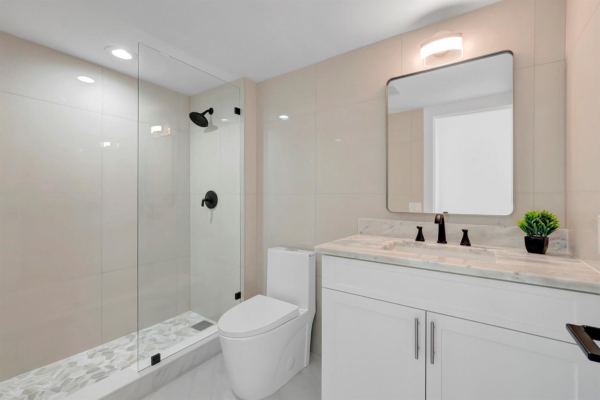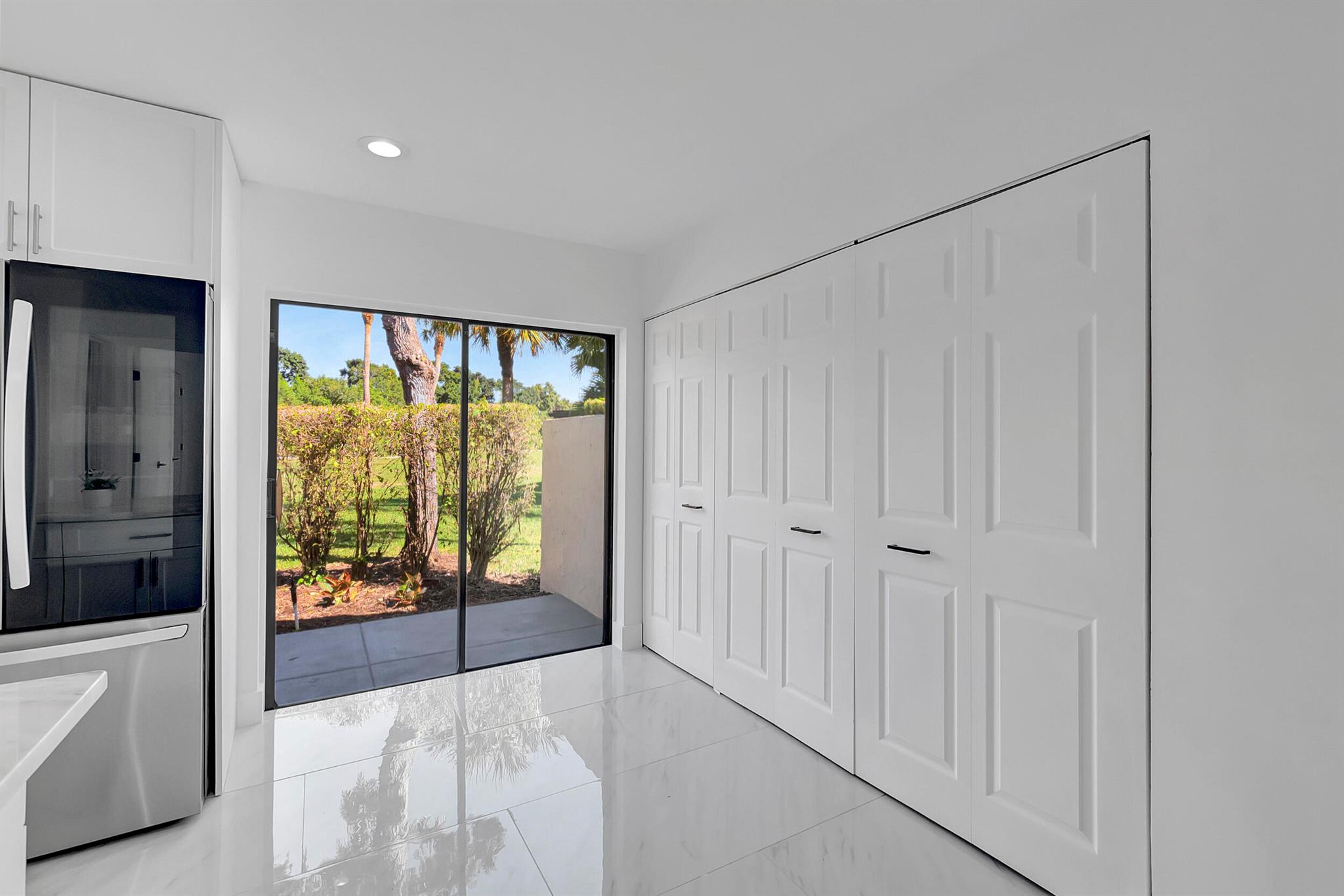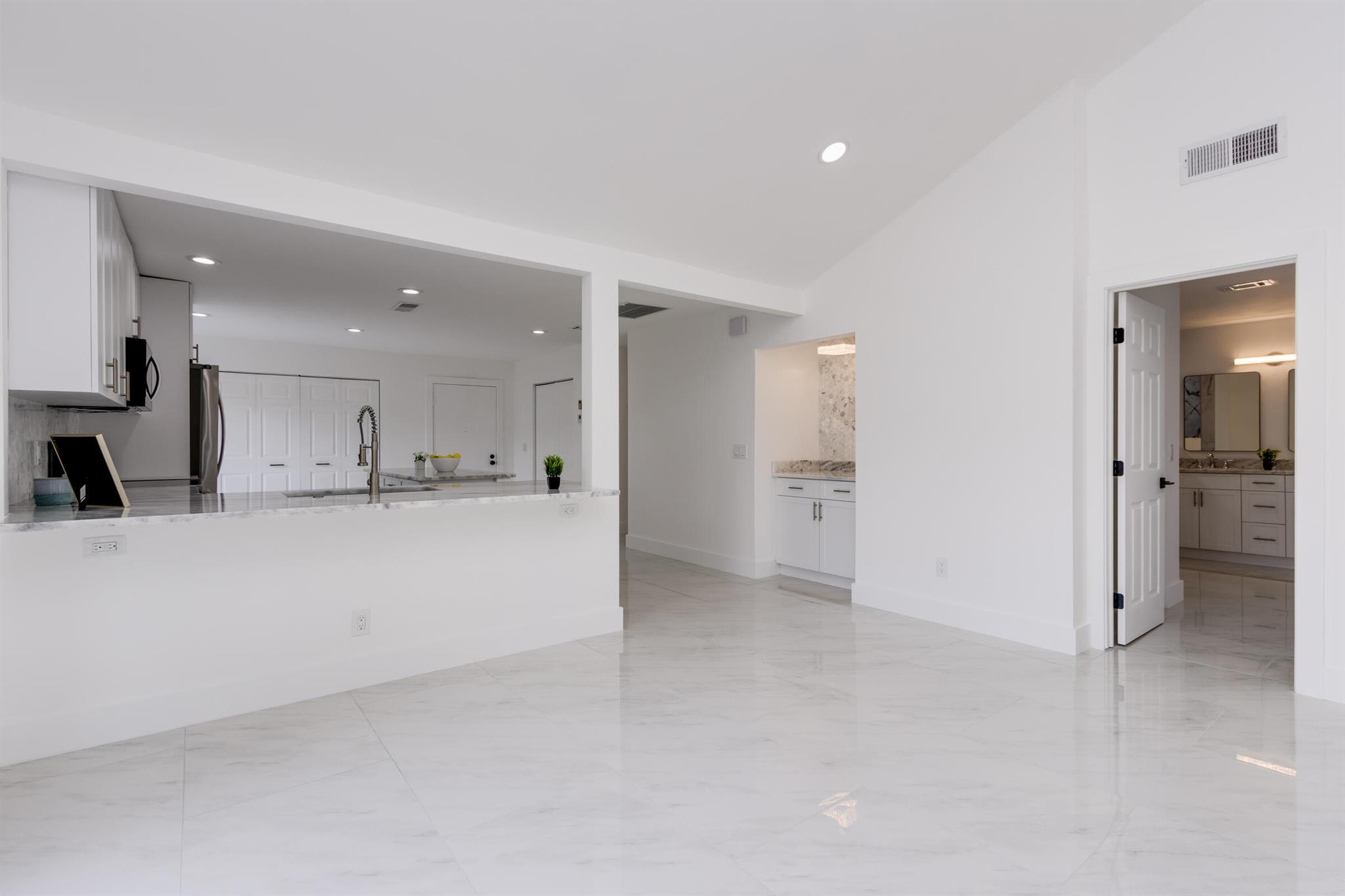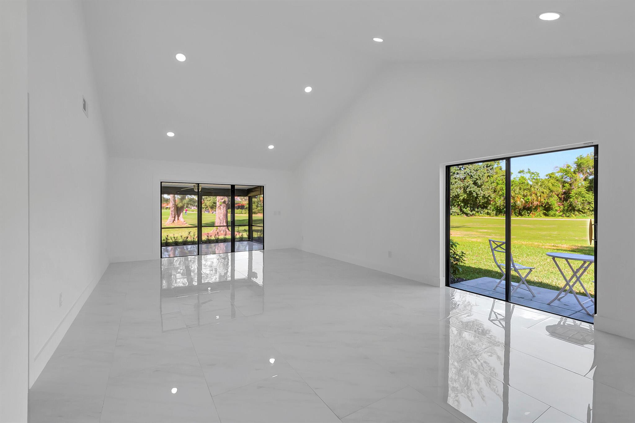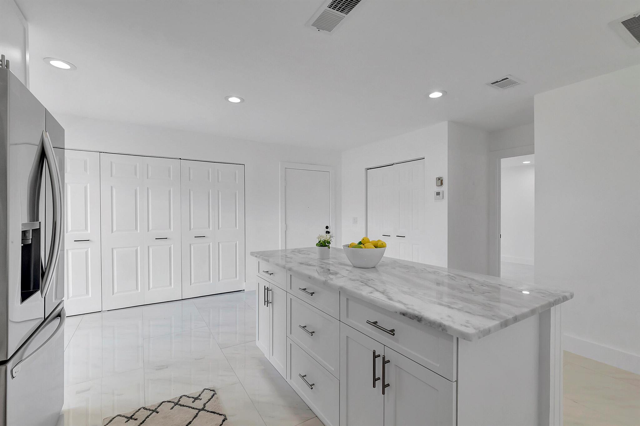 Welcome to the Fairways of Boca Lago. A 55+ active community. Spacious 2 bedroom, 2 bath villa. This unit has undergone a total renovation by an upscale contractor. 24x48 tiles throughout. Brand new custom kitchen with quartz counters and new LG stainless steel appliances. open flr plan, vaulted ceilings, all new recessed lighting. New doors. New water heater.New washer/Dryer. Designer bathrooms with high end fixture. Tons of closet space. Sliders to side patios. New screen enclosed back lanai with ceiling fans and a gorgeous view of a lake and golf course. Private peaceful with no rear neighbors. Large bedrooms with access to front and rear patios. Covered carport with long driveway for extra cars. Brand New roof installed May 2024. paid in full by contractor. No assessment due