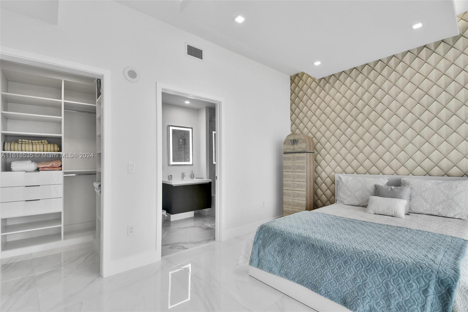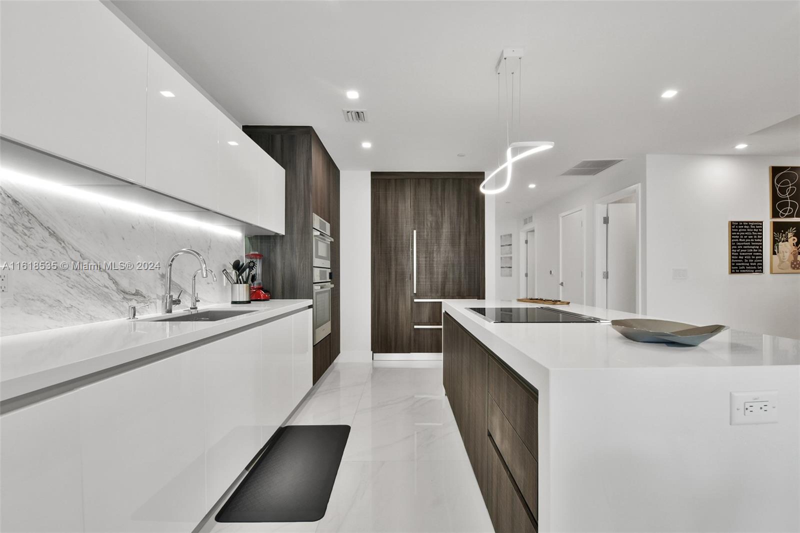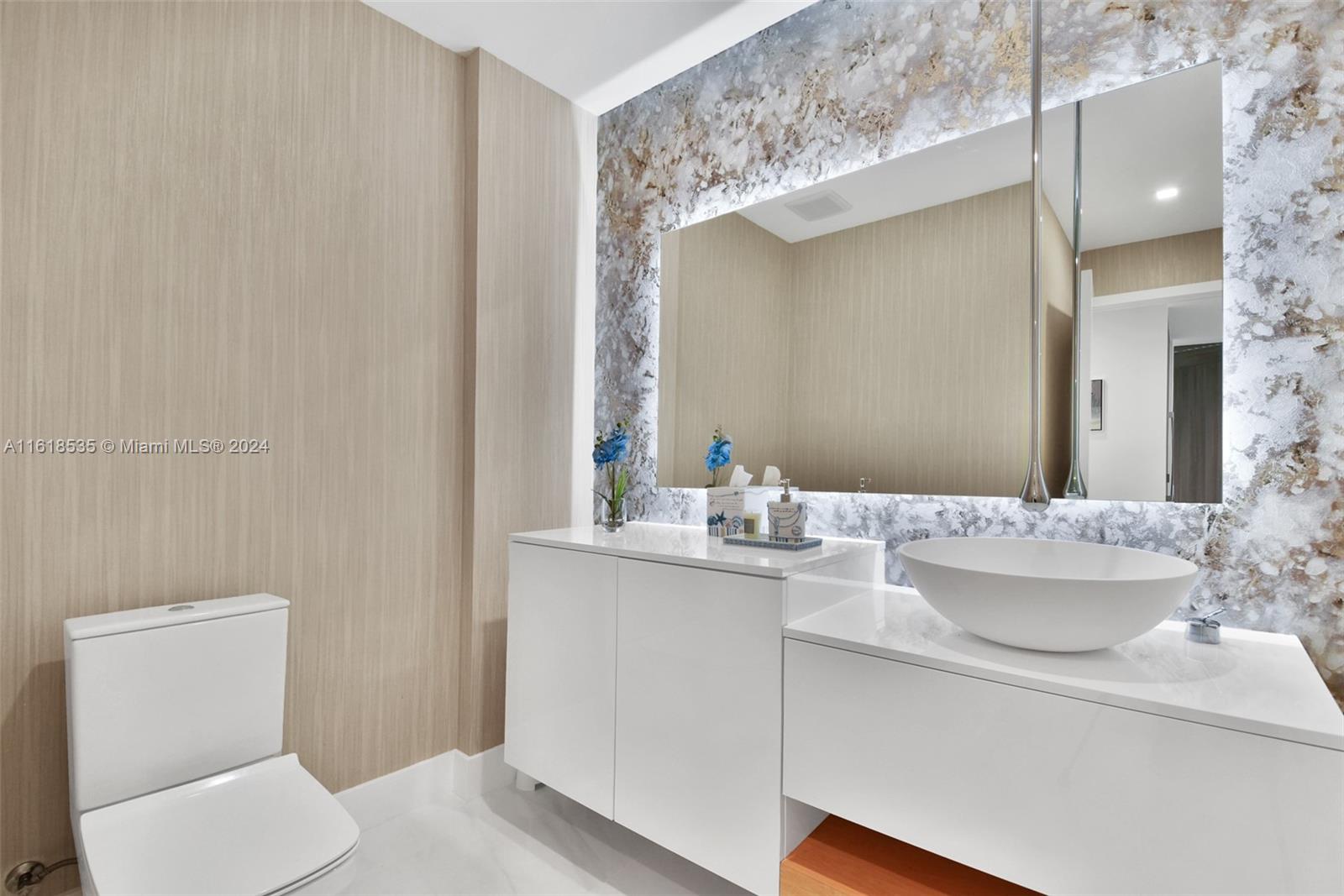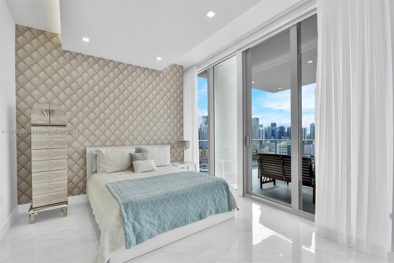 This exquisite unit features 3 bedrooms, 3 full bathrooms, and 1 powder room. Enjoy a private elevator with foyer, oversized terrace, private balcony in primary bedroom, over $300k in upgrades including a dining area with built-in glass wine cellar, custom wallpaper, electric blackout shades, recessed lighting, Italkraft kitchen cabinetry, custom wood panels, Bosch appliances, and a large kitchen island with stovetop and ample storage. Breathtaking views of the skyline and Biscayne Bay. Building amenities include multiple pools, fitness center, spa, tennis courts, soccer field, boxing studio, and game room. Located in the heart of Miami Worldcenter, surrounded by premier dining, shopping, and entertainment. 1 assigned parking space + the right to valet park a second vehicle complimentary.