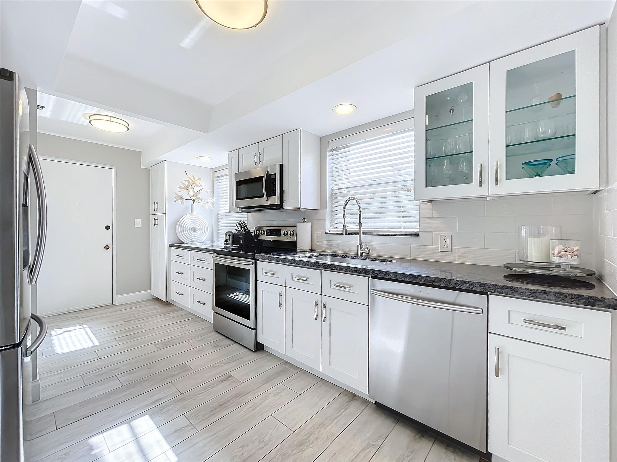 The pictures tell the story of this tastefully completed, high-end 3BR/2.5BA and 1715 sq ft remodeled condo. Seeing is believing! This spacious corner condo with open floor plan has the features today's buyers desire. Excellent views, cross ventilation options, windows on 3 of 4 sides of the building, built-in closets, stainless steel appliances, frameless shower glass... Simply put, exceptional design with high-end construction materials throughout. The complex features a clubhouse/community center with tennis /pickleball courts, large pool, back up generator, 24 hour video surveillance, cable, internet and water. The location is exceptional as it is just minutes from I95, the beaches and downtown areas of Boca and Delray. The green area is part of the planned Boca North Park.