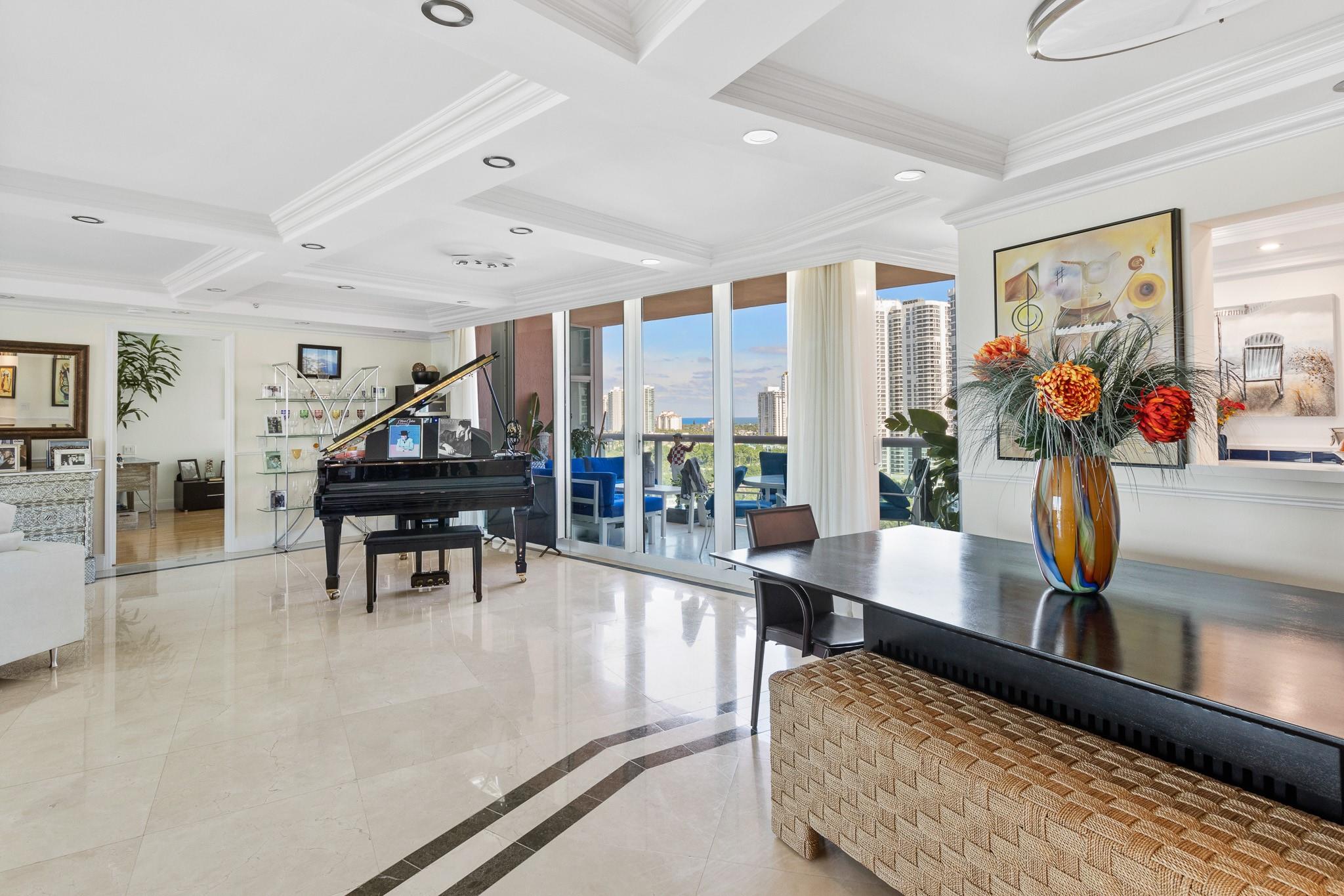 Immaculate oversized 2+2.5 Penthouse with rare see through views in living area of Ocean and Intercostal. Fully remodeled Kitchen including appliances; wainscoting; glazed subway tile; natural wood like porcelain tile flooring; plus comfortable breakfast bar, enhances this one of a kind kitchen. The custom coffered ceilings in living room and dining room, blends retro with elegance. Enjoy your evening views from your penthouse balcony or from every room inside your home. Each bedroom has a private ensuite. Primary ensuite has dual sinks, sinking tub and a private shower. Guests will welcome the custom powder room. Every room showcases one of a kind design. Pickle ball; tennis courts; workout room; community patio; and winding pool are just a few of the amenities. Pride of ownership shows.