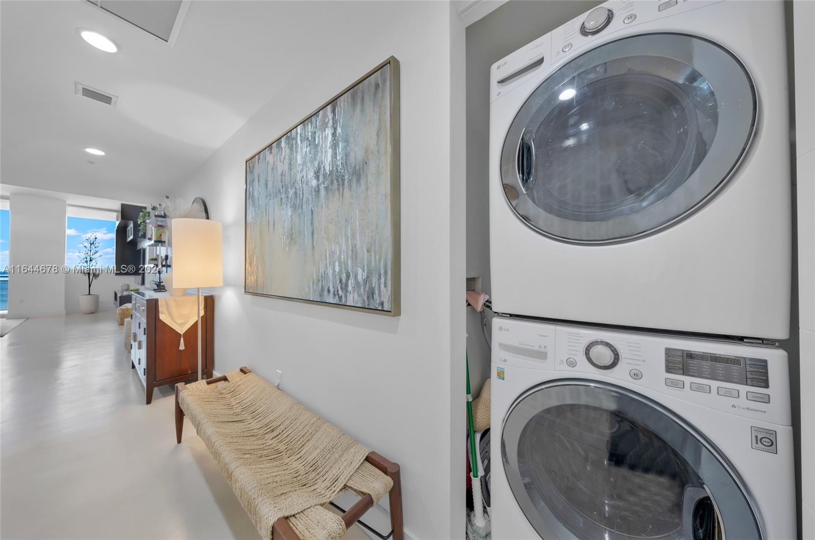 Experience luxury living at The Lexi in North Bay Village with this stunning 2 Bed, 2 bath condo. This expansive 1,458 sq. ft. residence features a sleek design with polished concrete floors and a bright, open floor plan. The gourmet kitchen, with stainless steel appliances, granite countertops, and ample cabinetry, is a chef's dream. Enjoy the convenience of a full-size washer & dryer and automatic blackout shades. The split floor plan ensures bedroom privacy, ideal for families or guests. Additional features include 2 dedicated parking spaces and extra storage. The Lexi offers resort-style amenities, including a new pool deck with a heated pool, jacuzzi, and a state-of-the-art gym with stunning bay views. Conveniently located just 1.5 miles from the sandy beaches.
